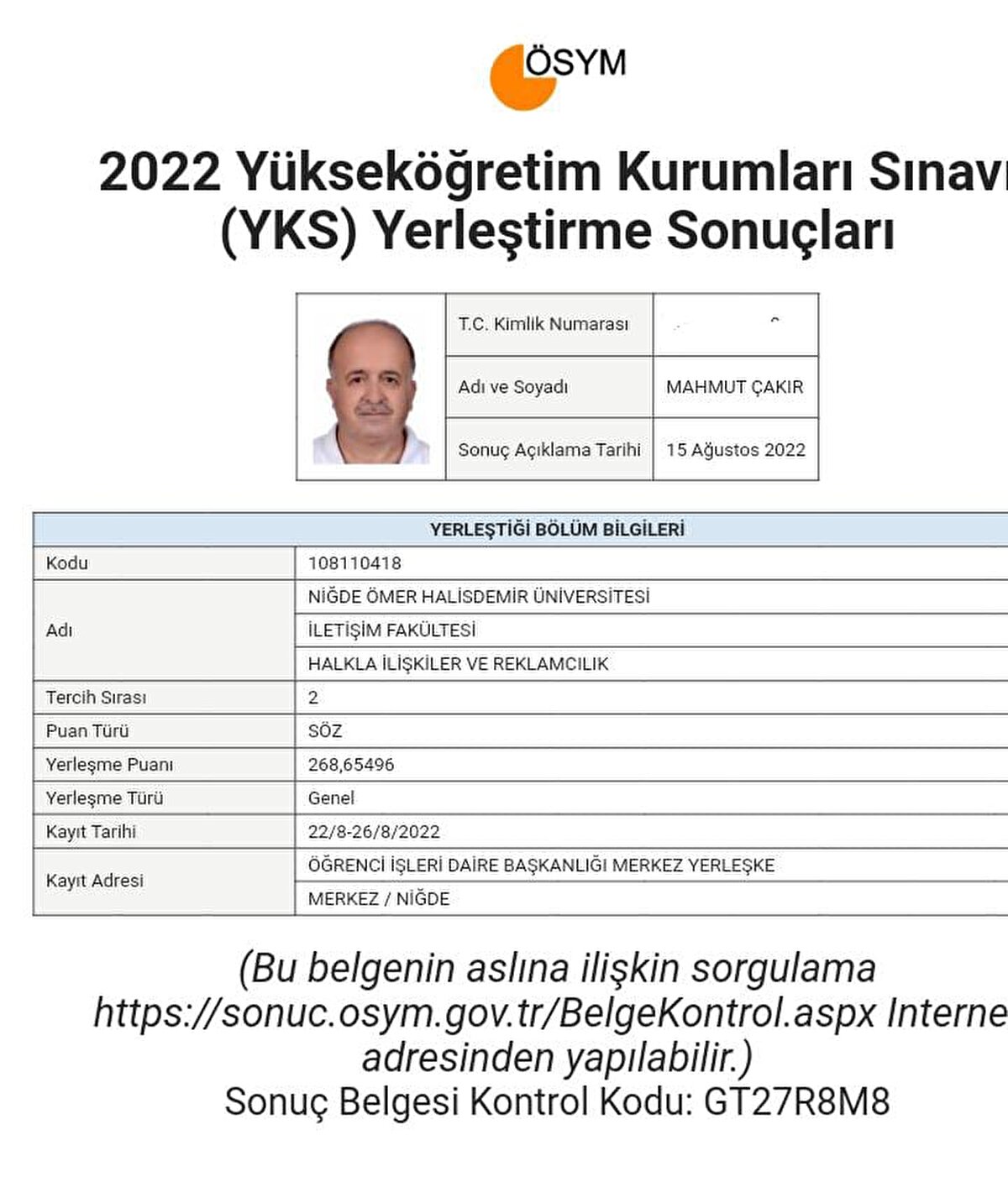 Niğde'de 2 çocuk ve 2 torunları olan Mahmut (60)- Ayşe Çakır (52) çifti, yıllardır kurdukları hayali gerçekleştirerek, Niğde Ömer Halisdemir Üniversitesi İletişim Fakültesi'ni kazandı. Halkla İlişkiler ve Reklamcılık Bölümü'ne yerleşen çift, torunları ve çocuklarıyla birlikte fakülteyi gezdi.