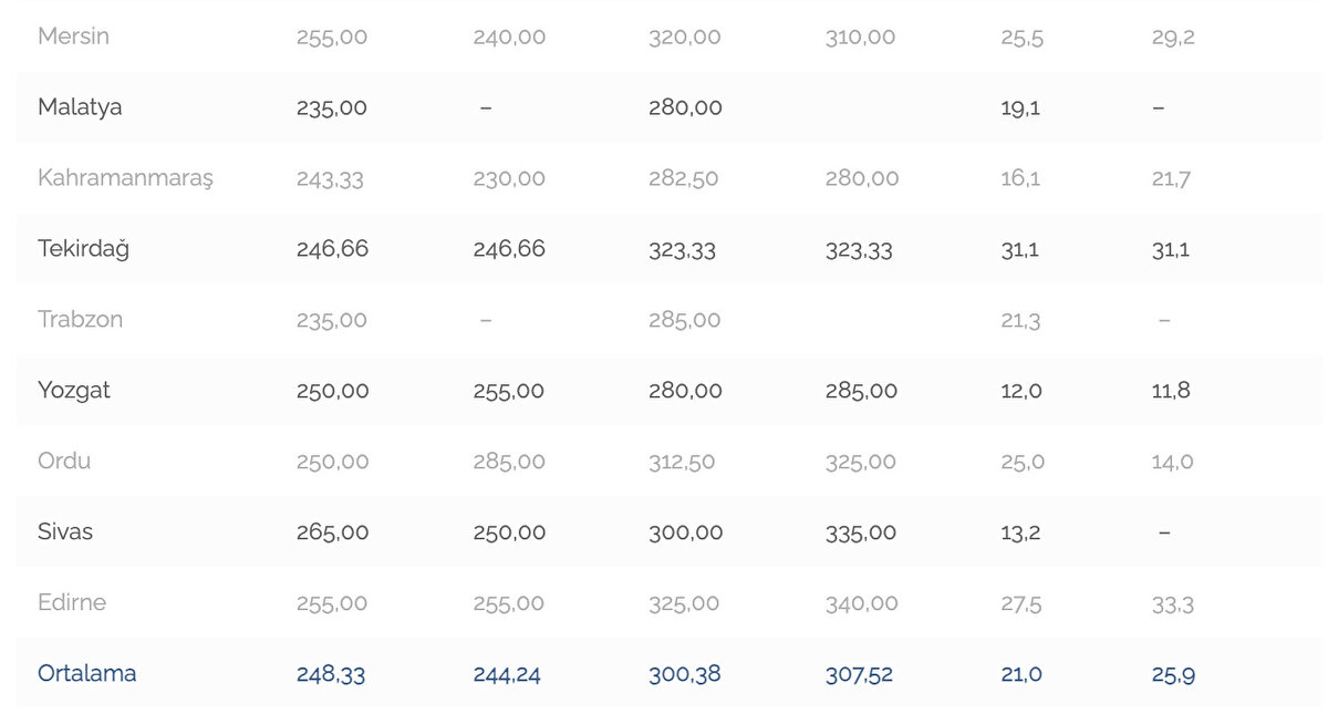 Canlı ağırlık fiyatının da kilogram başına büyükbaş hayvanlarda 250 lira ile 380 lira, küçükbaş hayvanlarda 230 lira ile 380 lira arasında olacağı tahmin ediyoruz. Ülke ortalamasına bakıldığında, büyükbaş hayvanların canlı kilogram fiyatının 300 lira 38 kuruş, küçükbaş canlı kilogram fiyatlarının ise 307 lira 52 kuruş olduğu görülüyor.