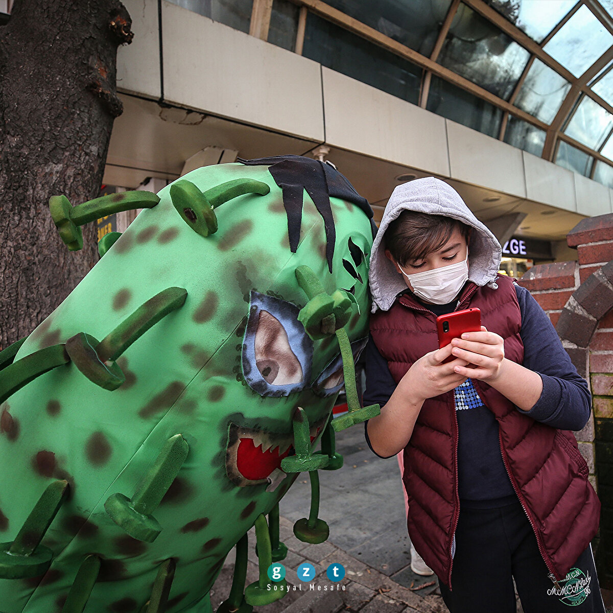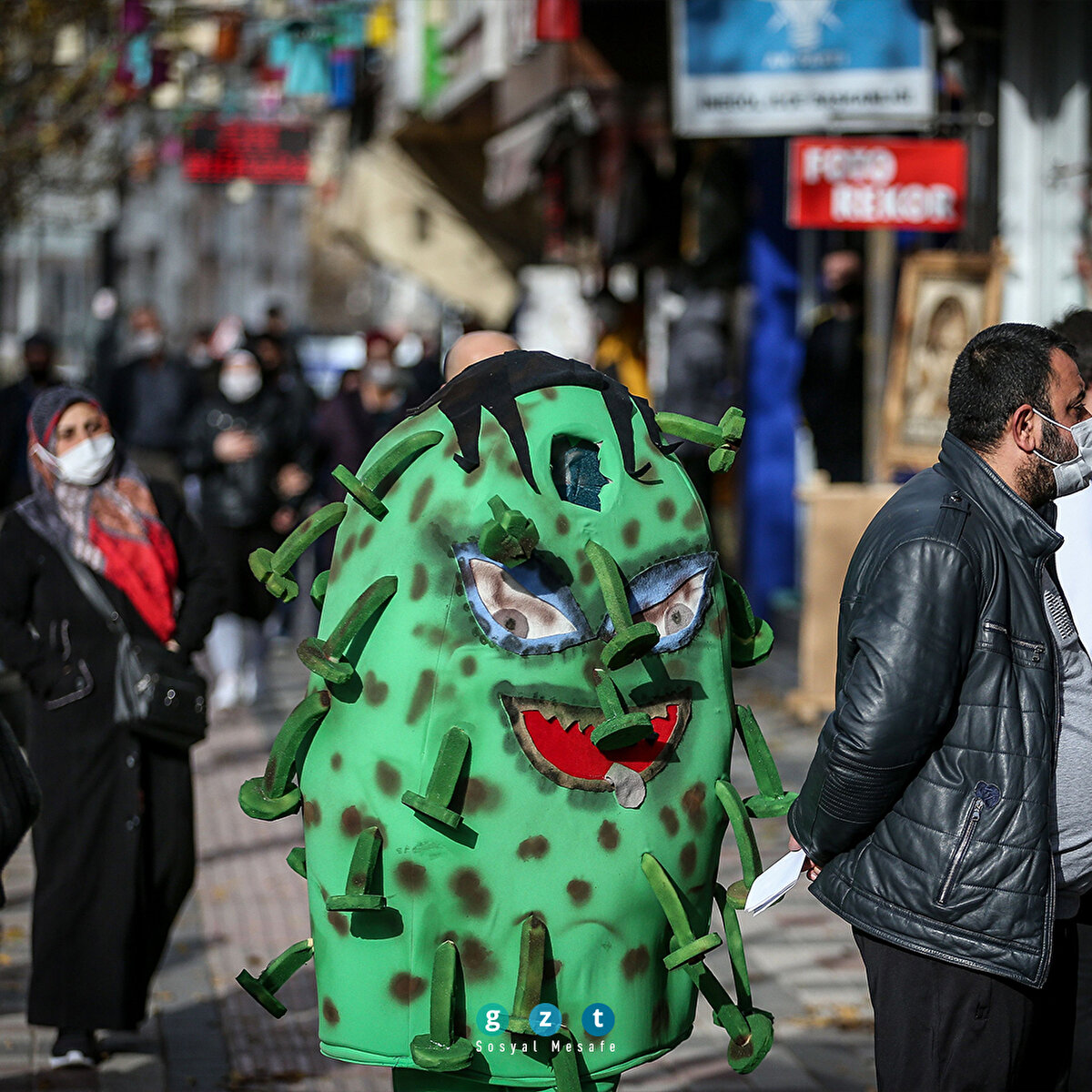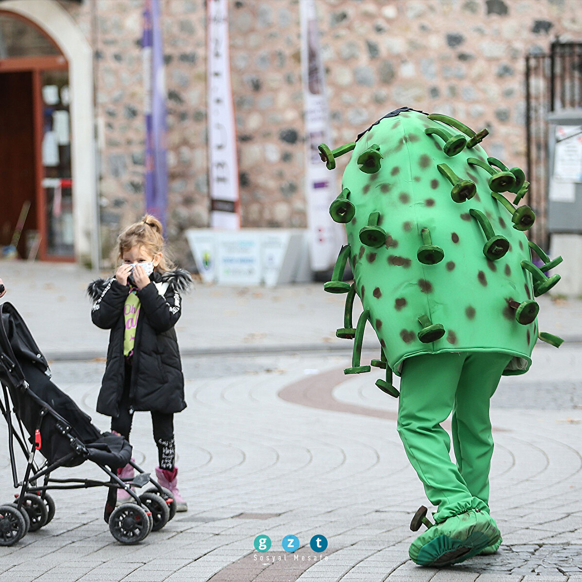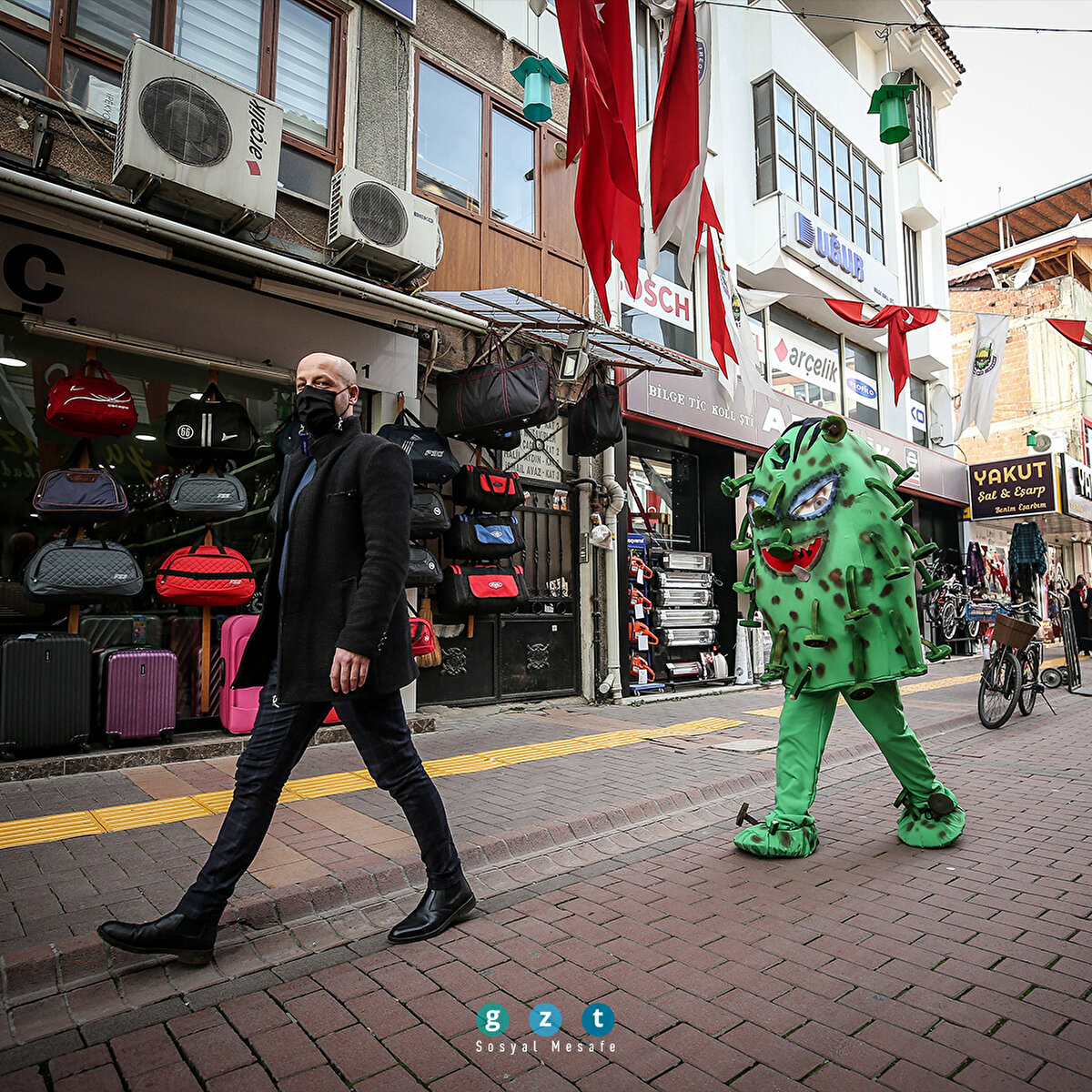 Bursa İnegöl'de "koronavirüs kostümü" giyerek sokaklarda gezen belediye personeli, vatandaşlara maske, mesafe, temizlik kuralını hatırlattı