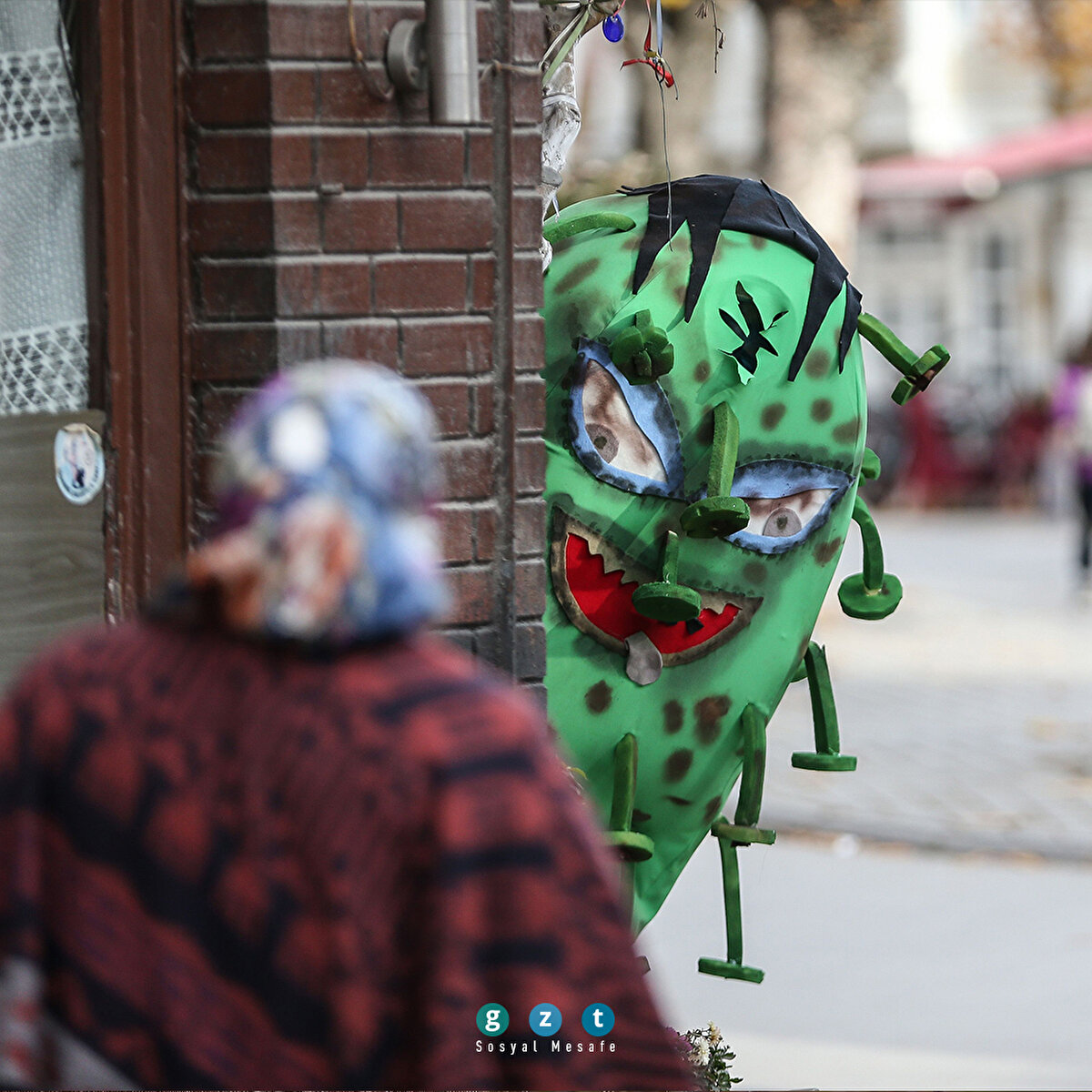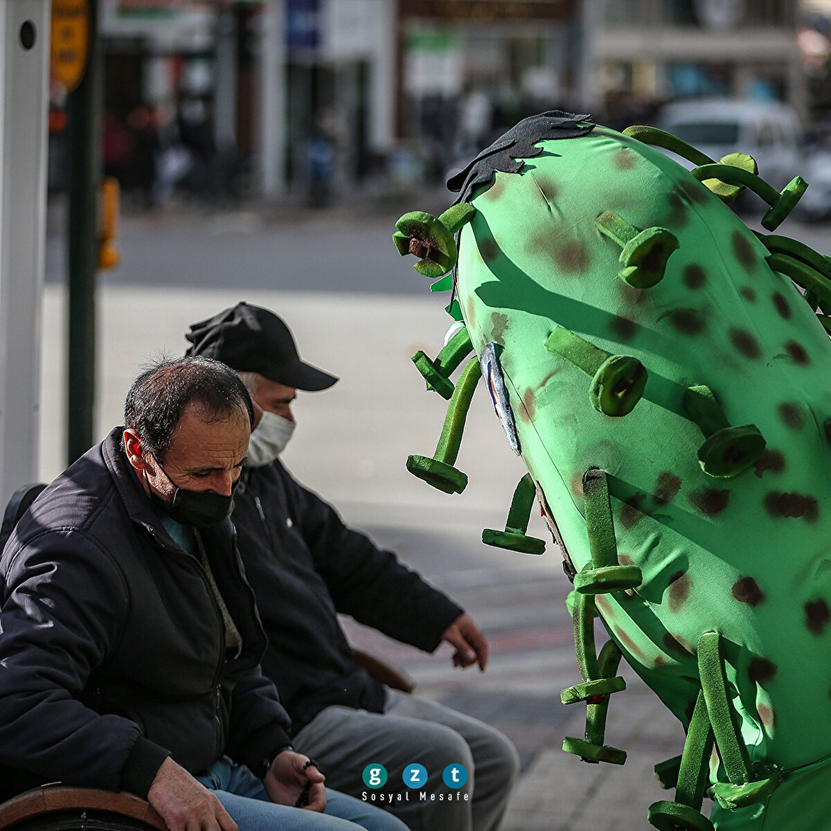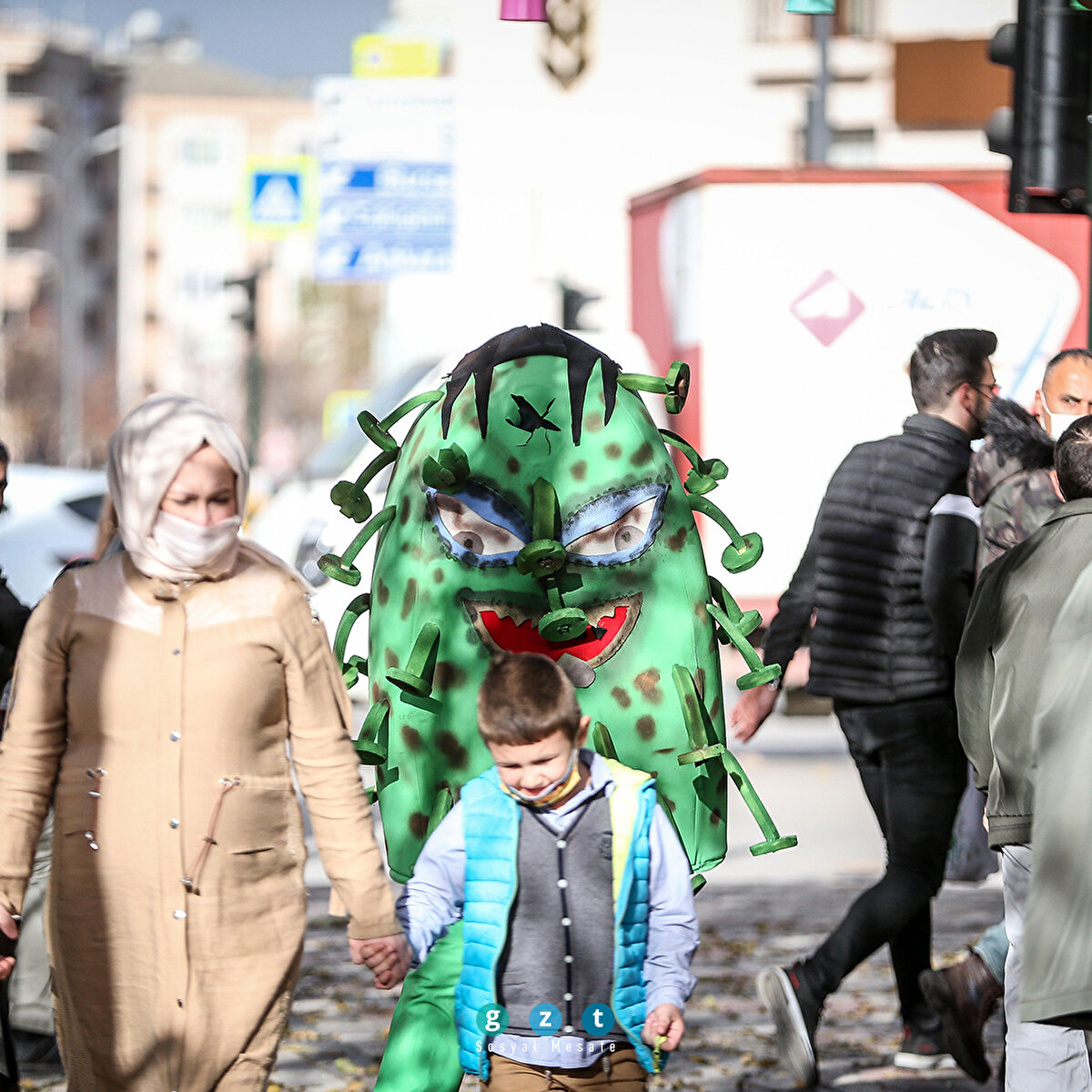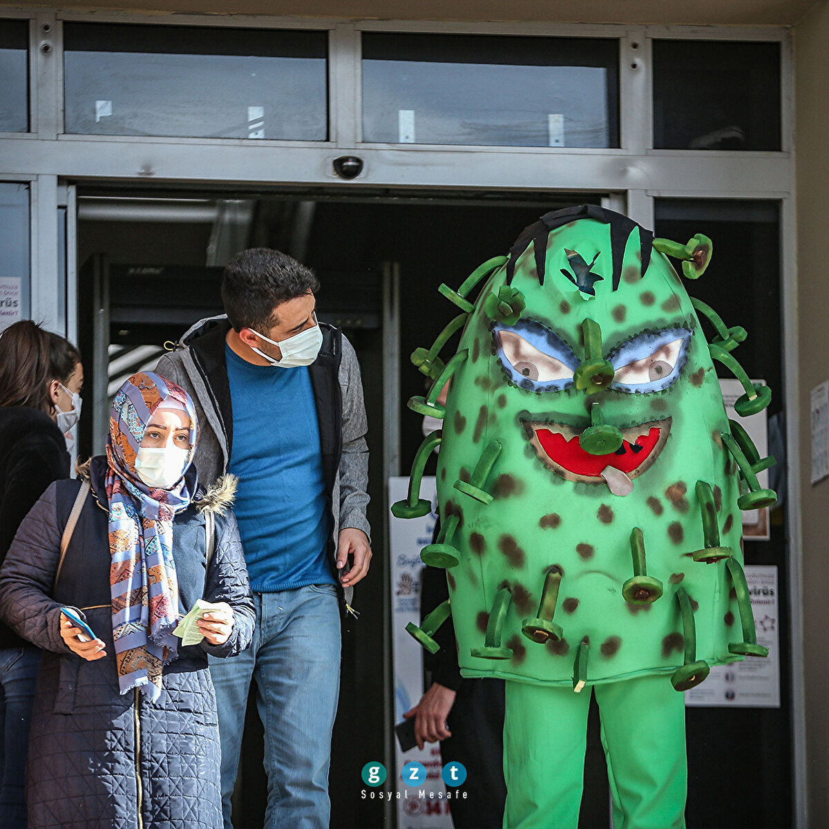 Bursa İnegöl'de "koronavirüs kostümü" giyerek sokaklarda gezen belediye personeli, vatandaşlara maske, mesafe, temizlik kuralını hatırlattı