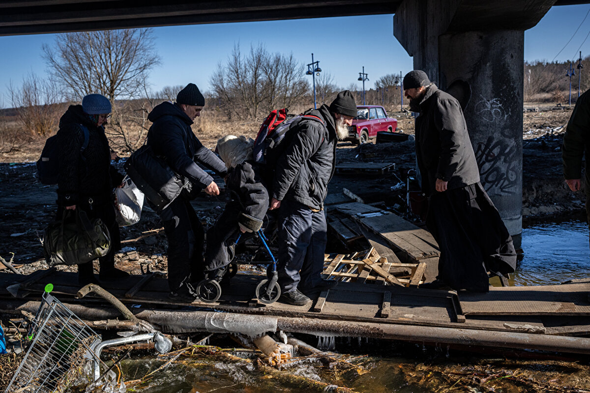 Çoğunluğu yaşlı, kadın ve çocuklardan oluşan siviller, Kiev ile İrpin arasında bulunan ve Ukrayna tarafından Rus güçlerinin ilerleyişini yavaşlatmak için yıkılan köprünün altından başkent tarafına geçmeye devam ediyor.