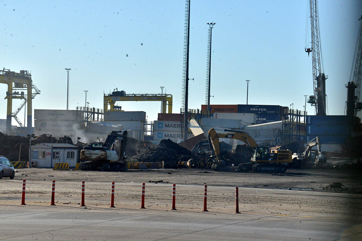 Soğutma çalışmaları tamamlanırken yangın bölgesinde hurdaya dönen konteynerlerin kaldırılmasına başlandı.