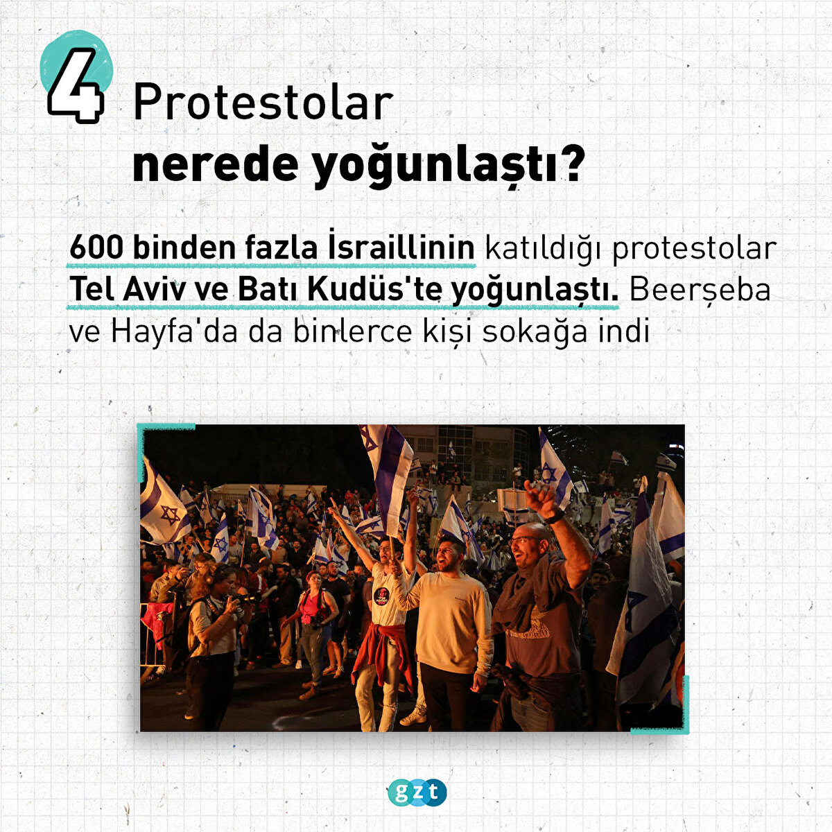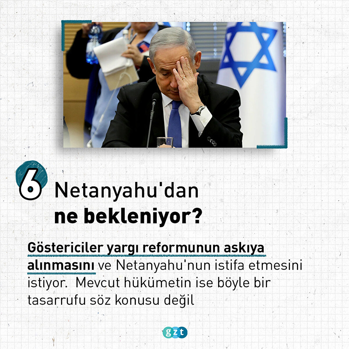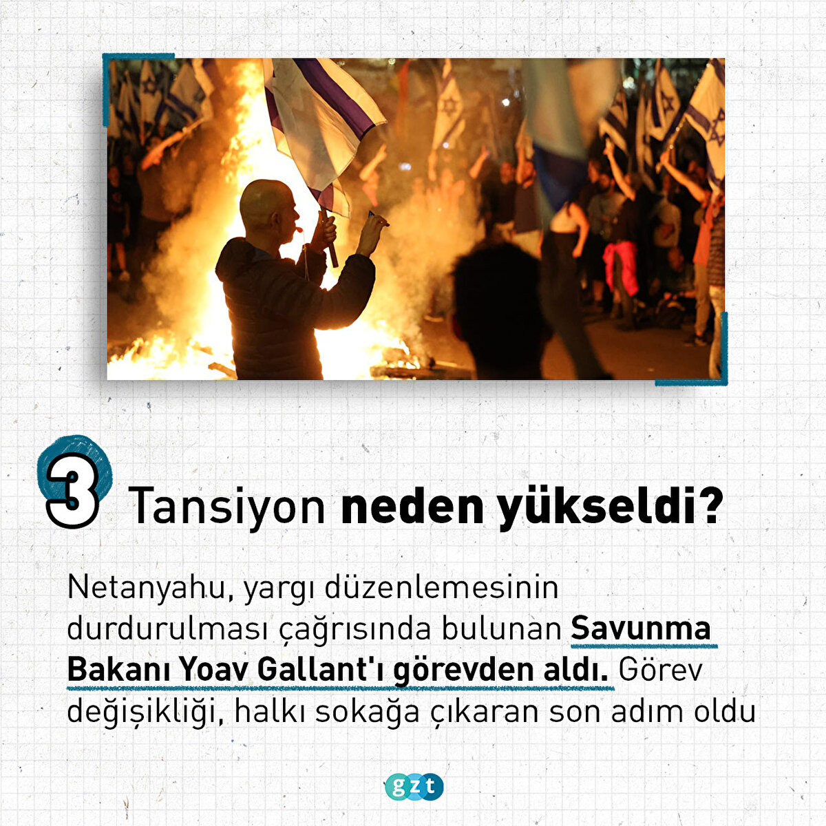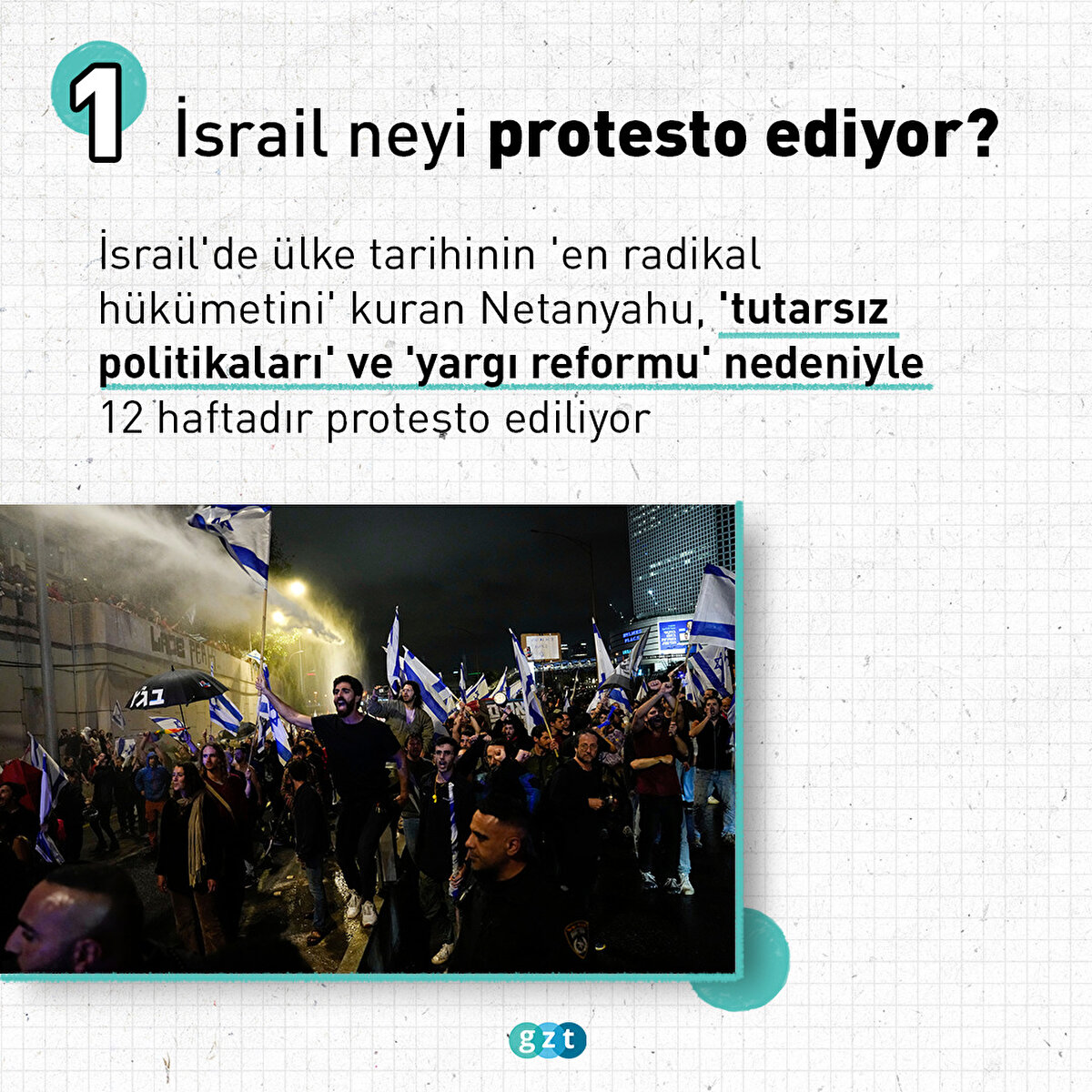 İsrail'de ülke tarihinin 'en radikal hükümetini' kuran İsrail Başbakanı Netanyahu, 'tutarsız politikaları' ve 'yargı reformu' nedeniyle 12 haftadır protesto ediliyor. Netanyahu'nun yargı düzenlemesinin durdurulması çağrısında bulunan Savunma Bakanı Yoav Gallant'ı görevden alması halkı sokağa çıkaran son adım oldu. İsrail'de yaşanan son gelişmeleri sizler için derledik.
