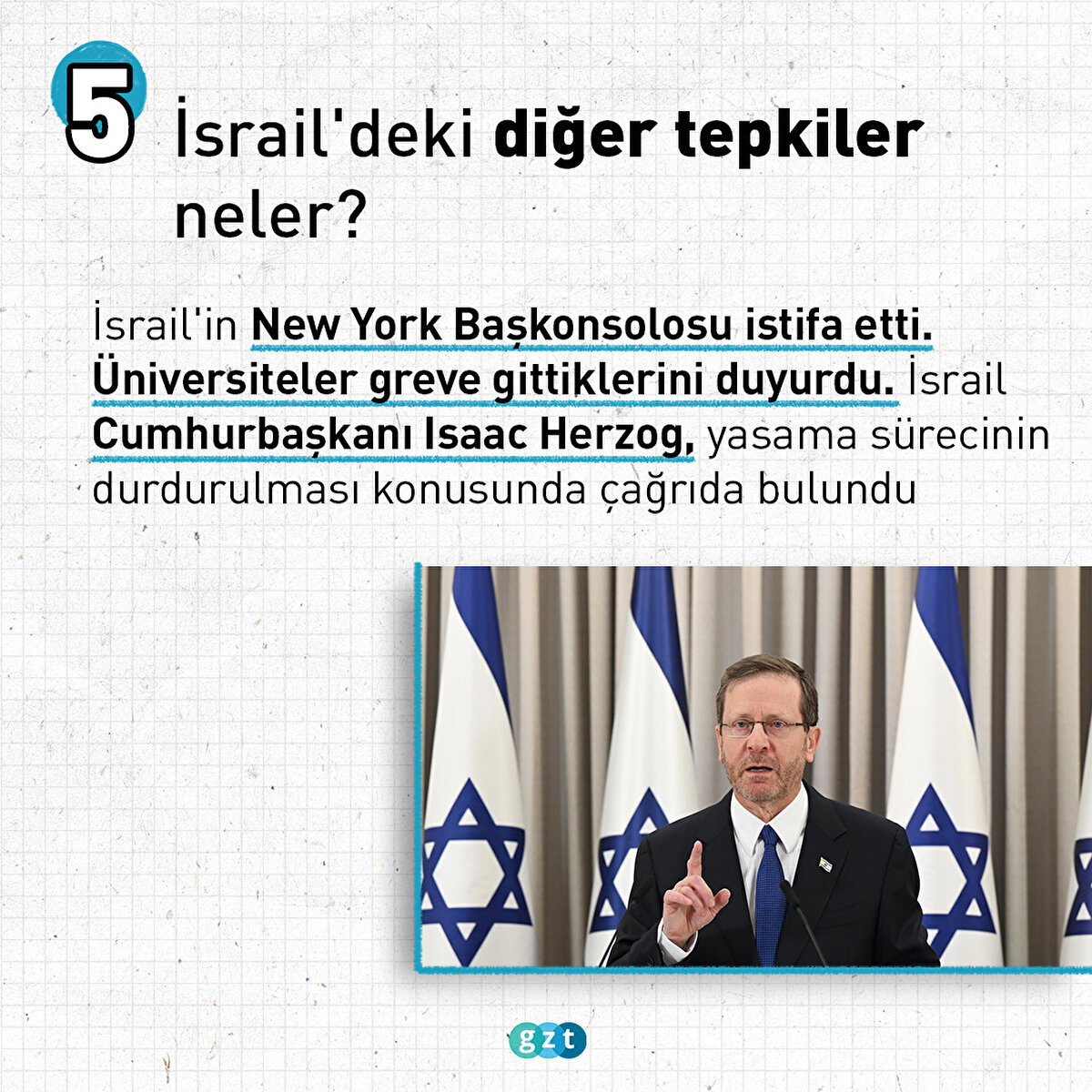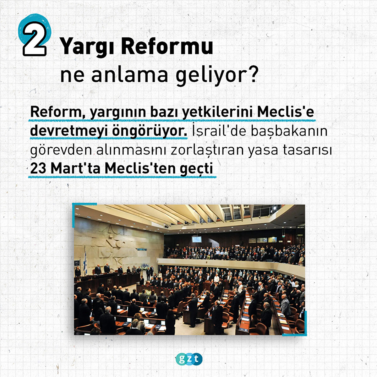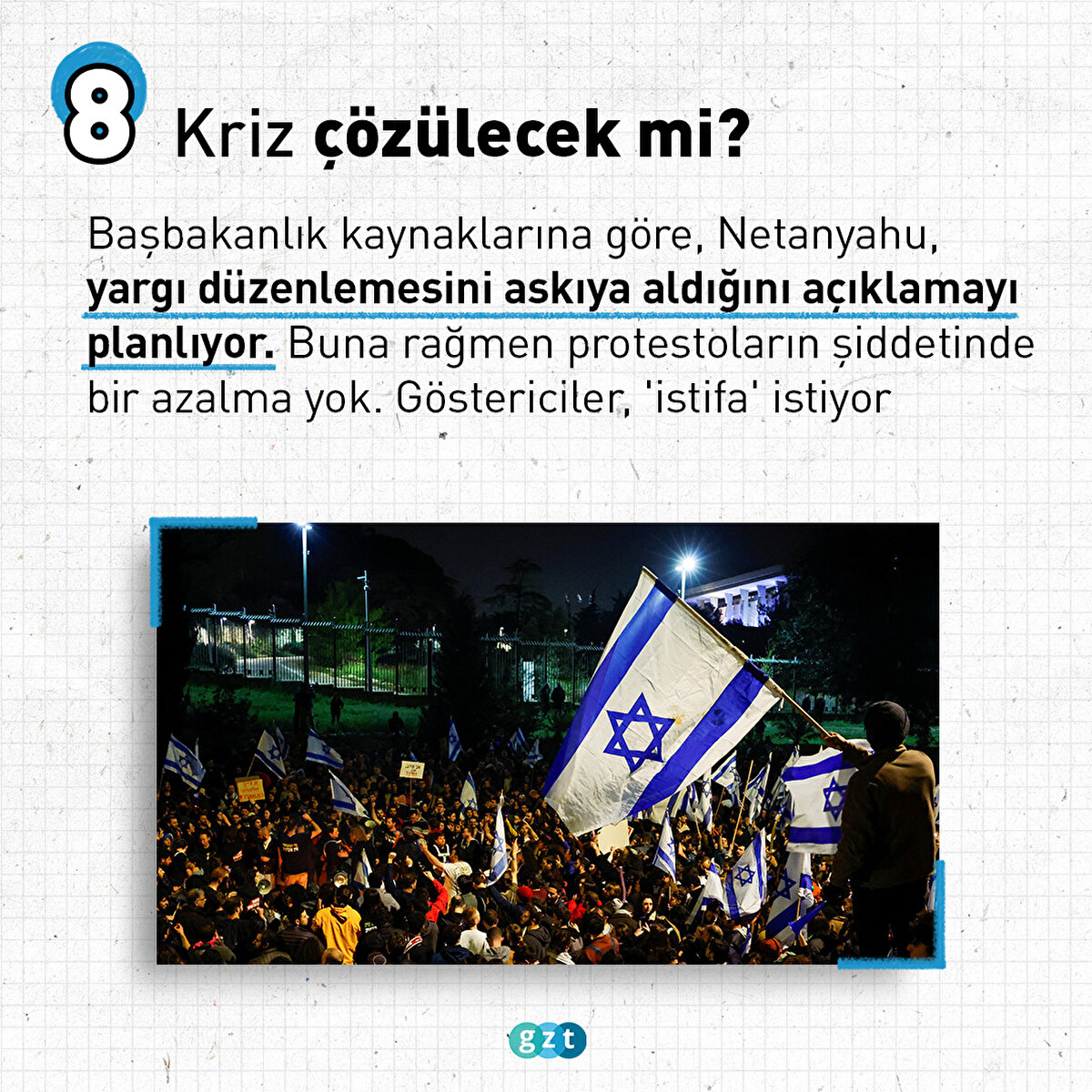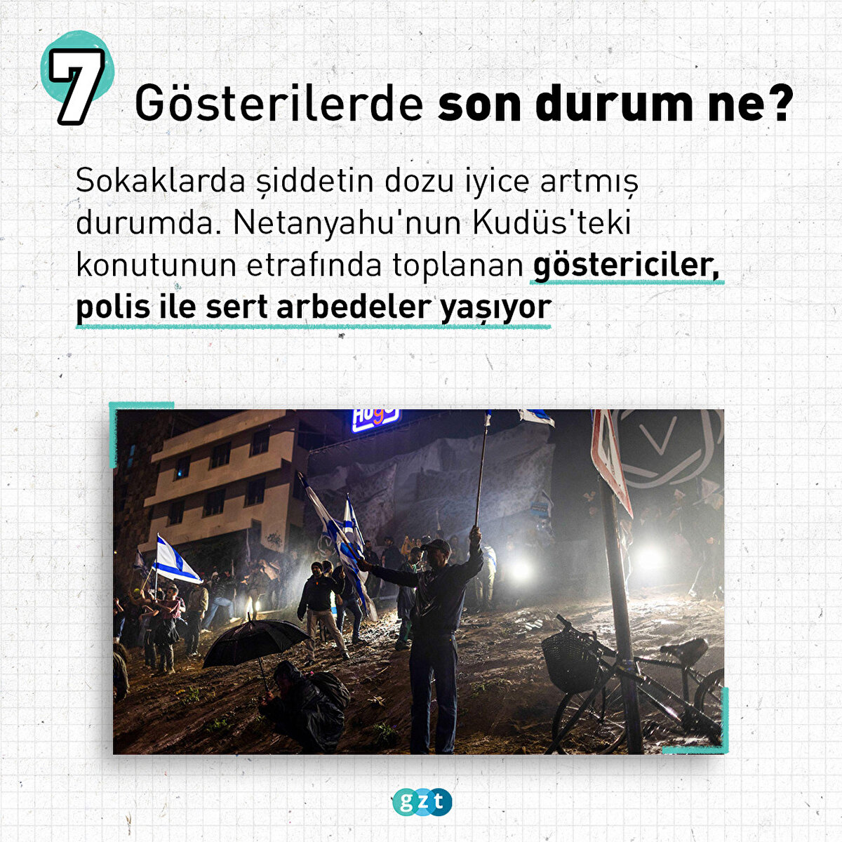 İsrail'de ülke tarihinin 'en radikal hükümetini' kuran İsrail Başbakanı Netanyahu, 'tutarsız politikaları' ve 'yargı reformu' nedeniyle 12 haftadır protesto ediliyor. Netanyahu'nun yargı düzenlemesinin durdurulması çağrısında bulunan Savunma Bakanı Yoav Gallant'ı görevden alması halkı sokağa çıkaran son adım oldu. İsrail'de yaşanan son gelişmeleri sizler için derledik.