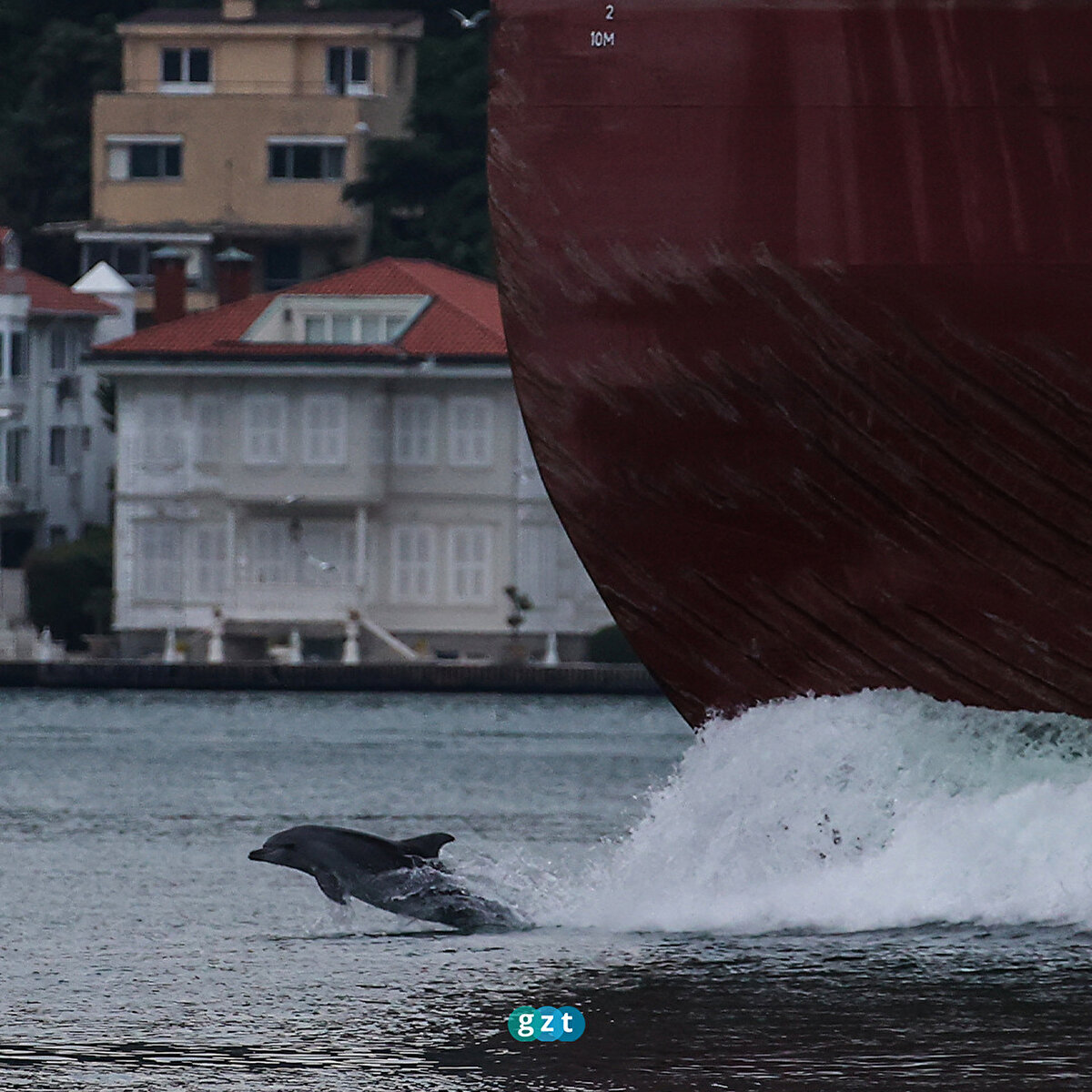 İstanbul Boğazı'nda yunuslar geçen gemilere eşlik etti