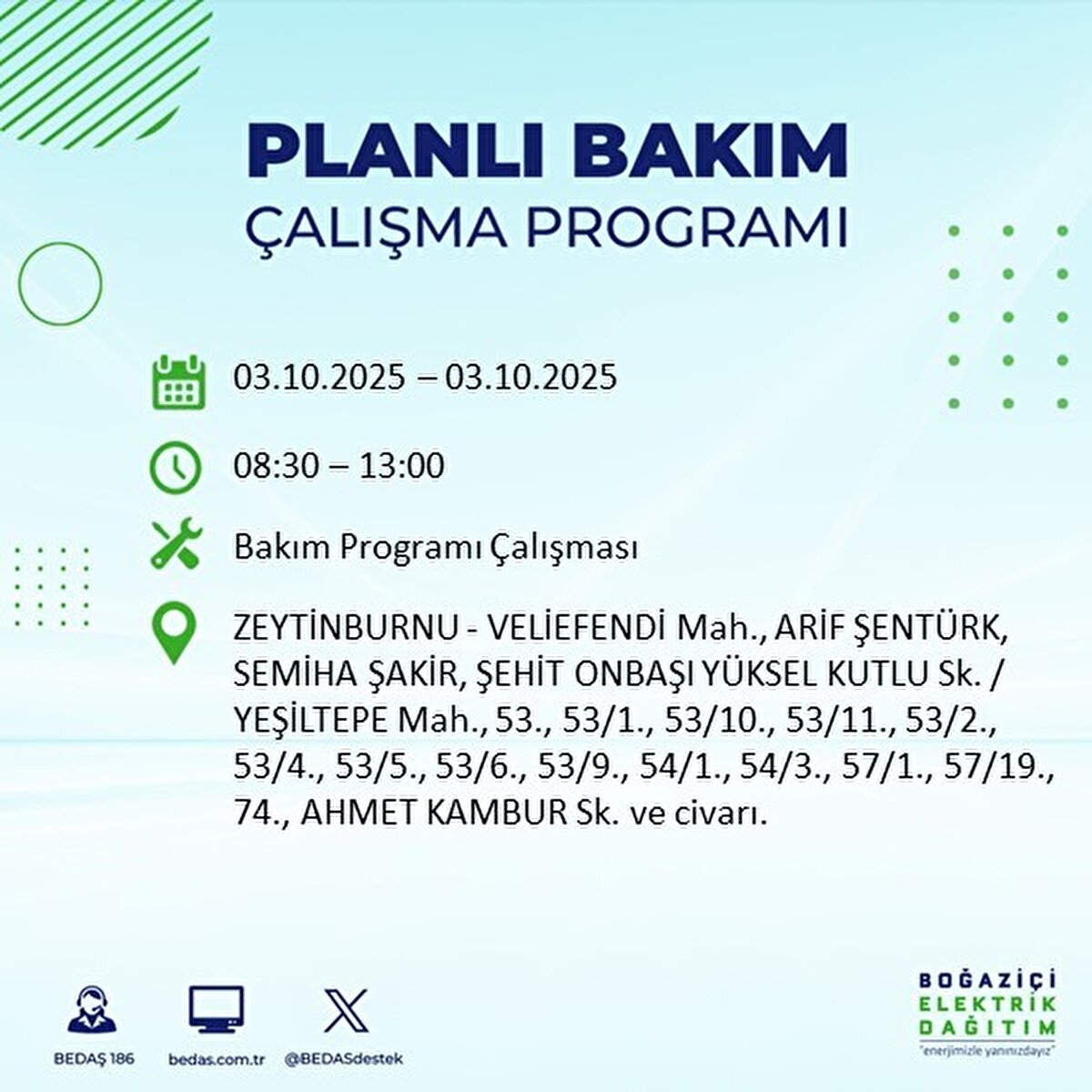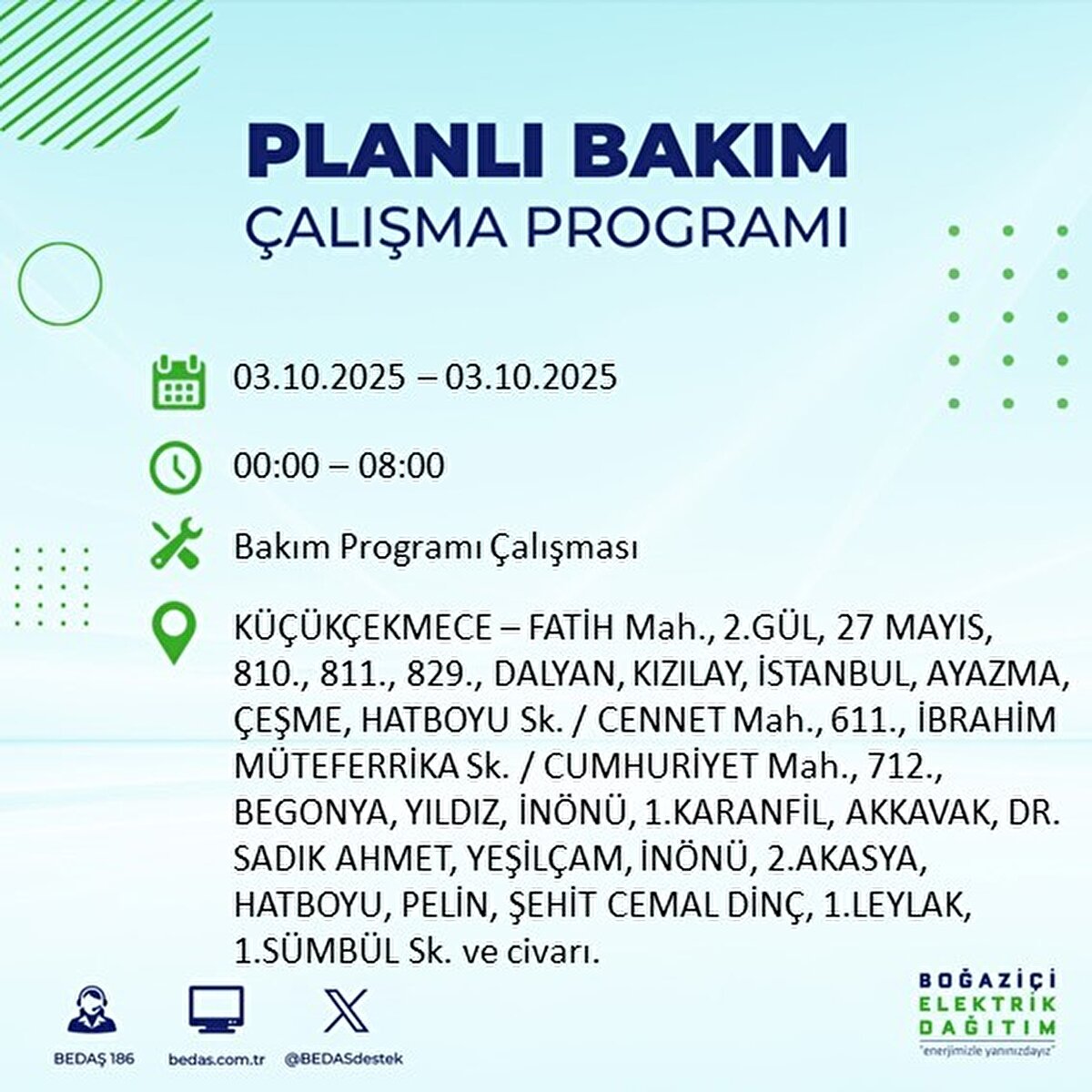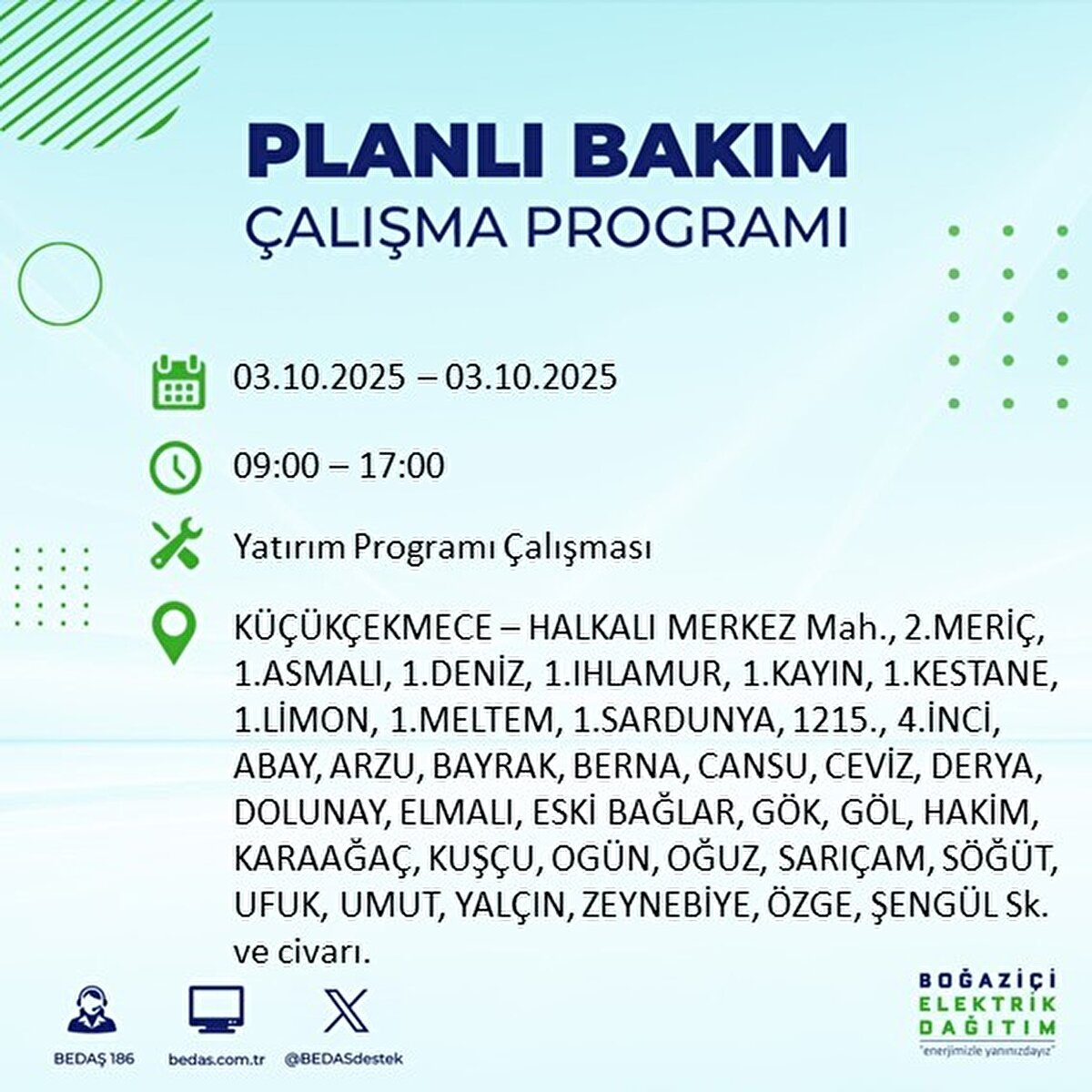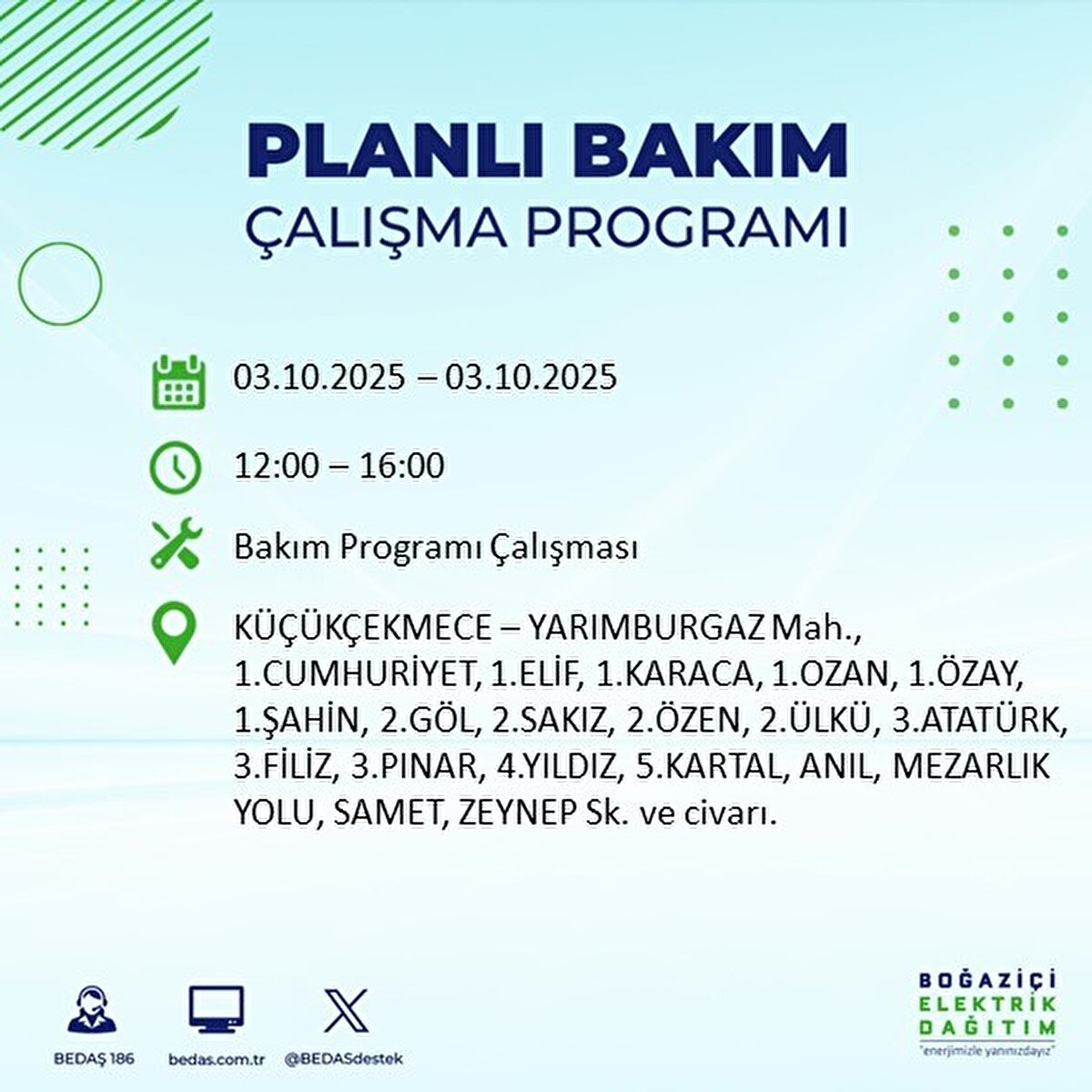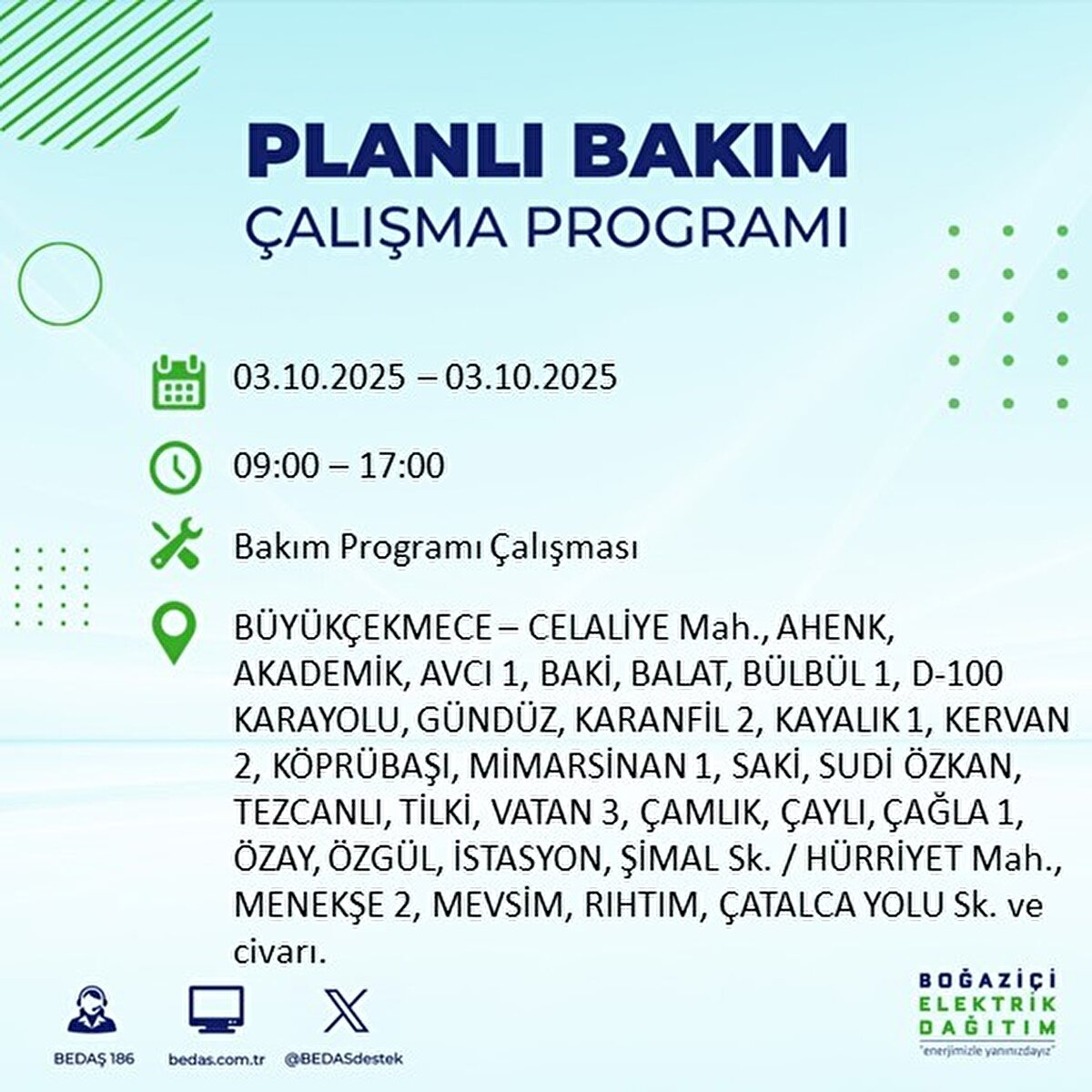 Boğaziçi Elektrik Dağıtım A.Ş. (BEDAŞ), İstanbul'un bir çok ilçesinde planlı bakım ve onarım çalışmaları nedeniyle elektrik kesintisi yapılacağını duyurdu. 3 Ekim 2025 tarihlerinde gerçekleştirilecek çalışmalar sebebiyle birçok ilçe ve mahallede 2 saat ile 10 saat arasında değişen sürelerde elektrik kesintileri yaşanacak.