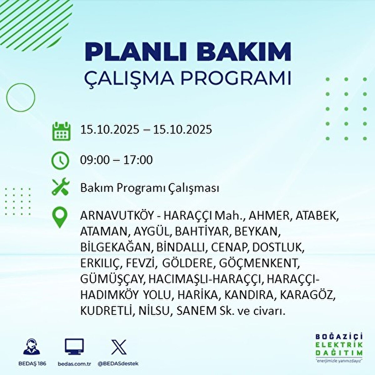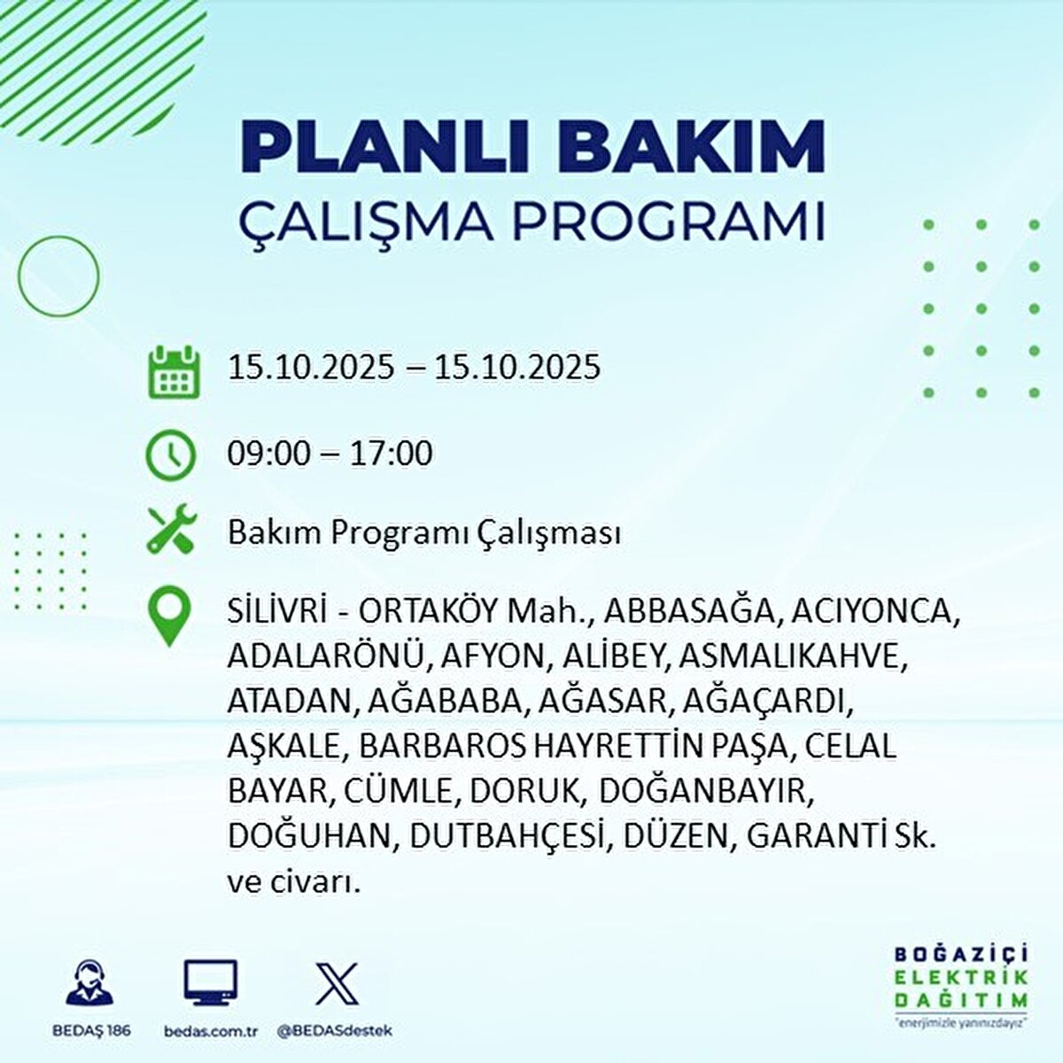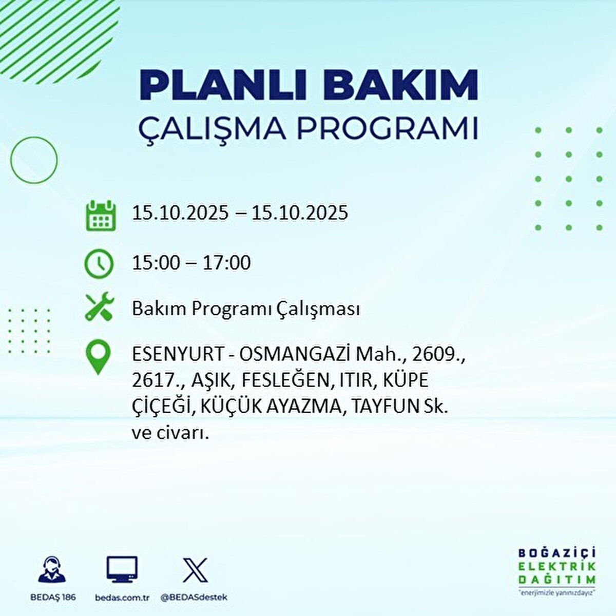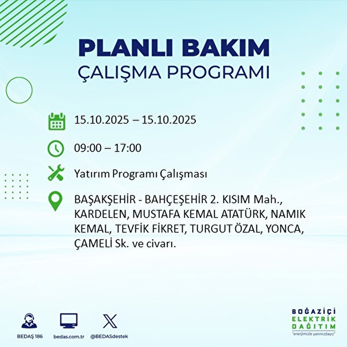 İstanbul'un 21 ilçesinde elektrik kesilecek! 15 Ekim 2025 Çarşamba İstanbul'da elektriğin kesileceği ilçeler ve mahalleler