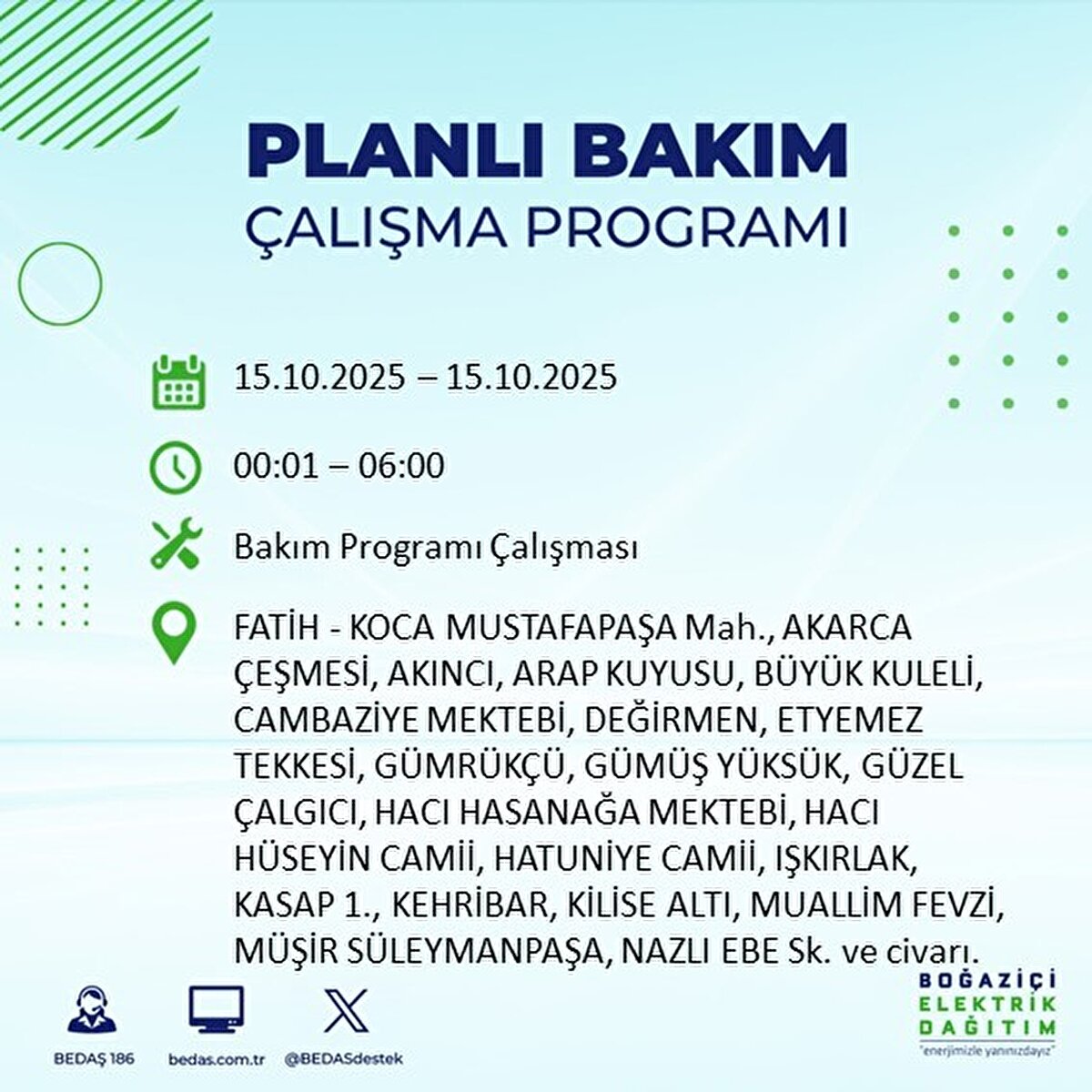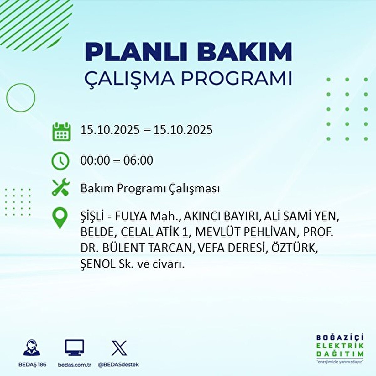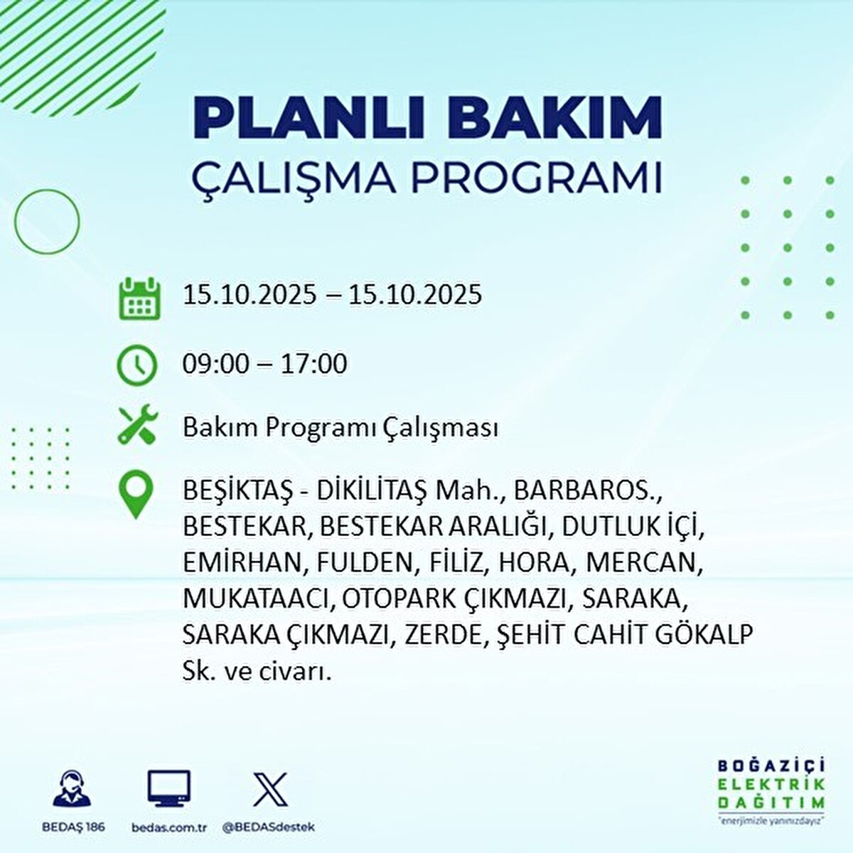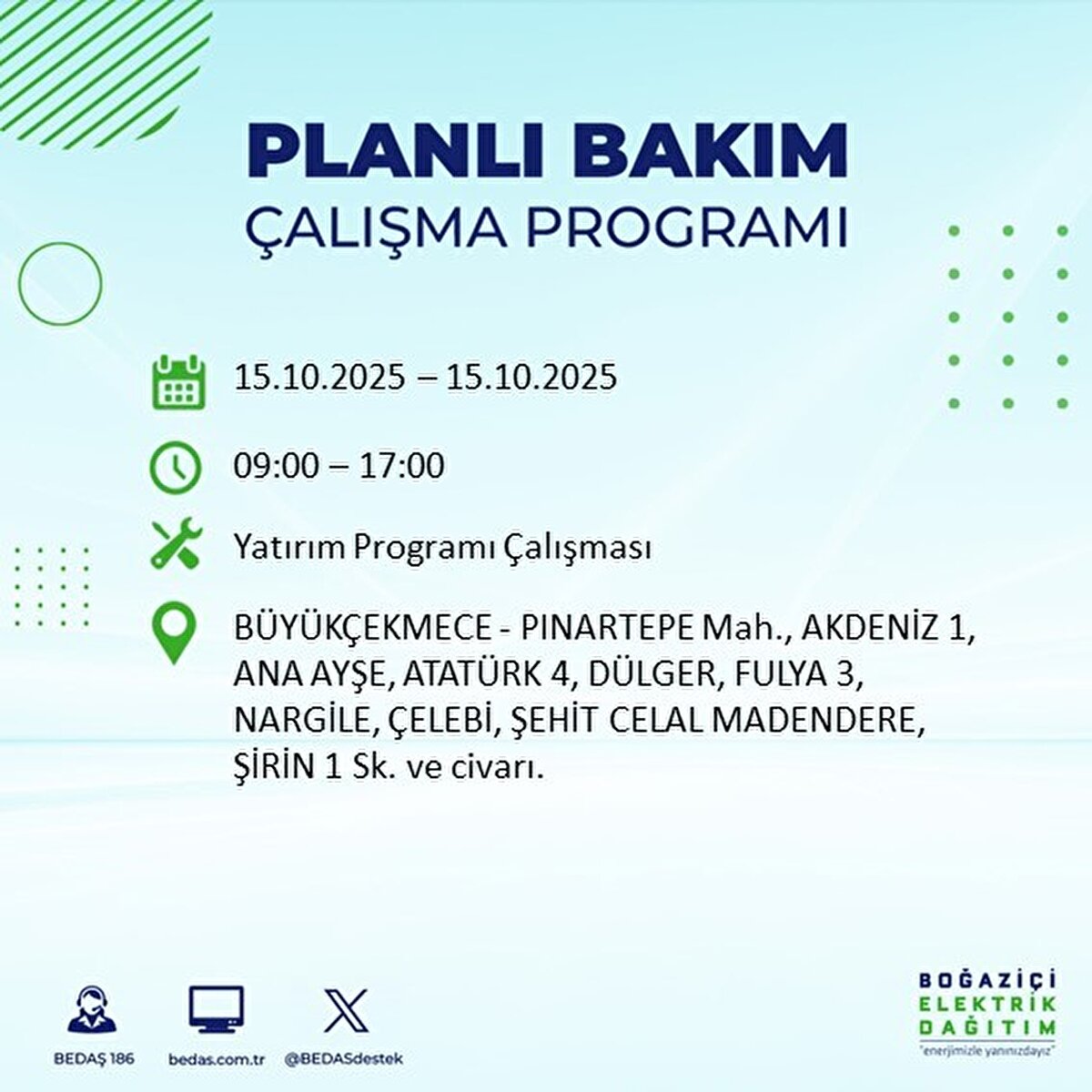 İstanbul'un 21 ilçesinde elektrik kesilecek! 15 Ekim 2025 Çarşamba İstanbul'da elektriğin kesileceği ilçeler ve mahalleler