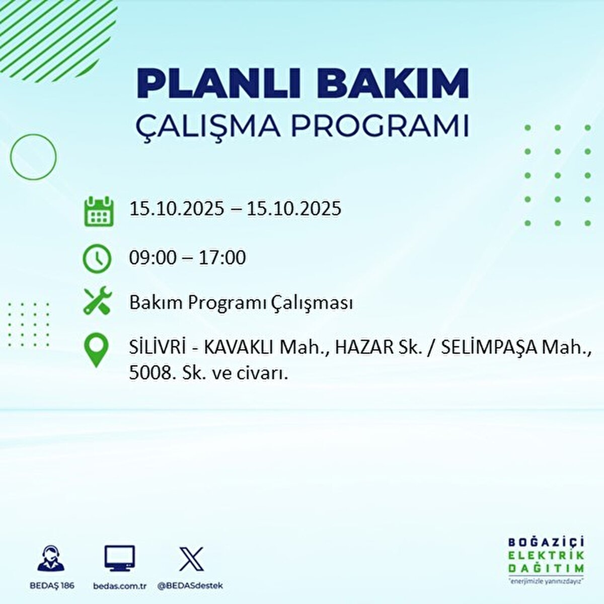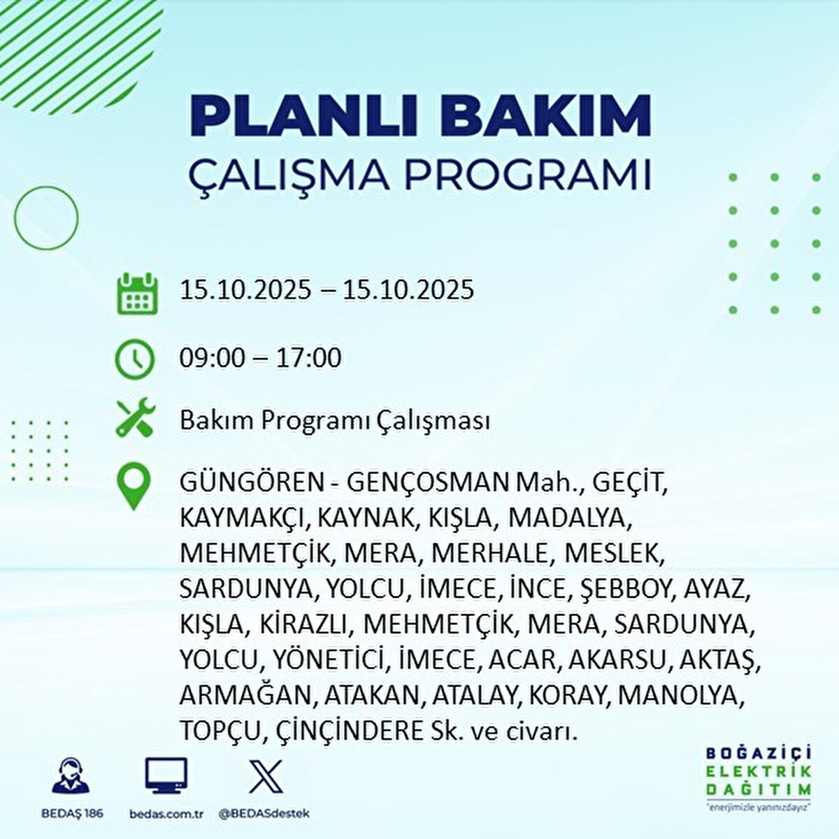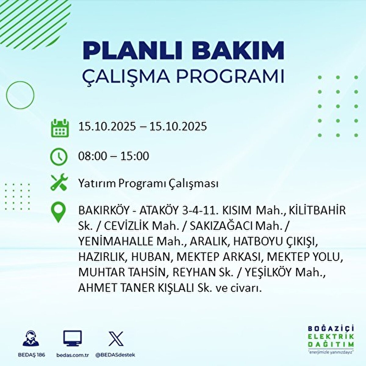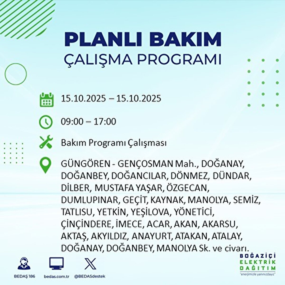 İstanbul'un 21 ilçesinde elektrik kesilecek! 15 Ekim 2025 Çarşamba İstanbul'da elektriğin kesileceği ilçeler ve mahalleler