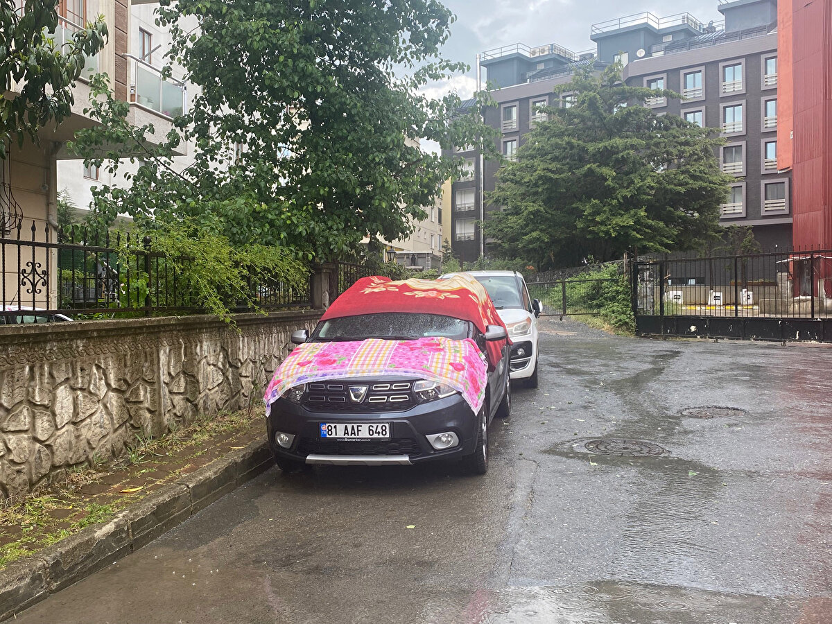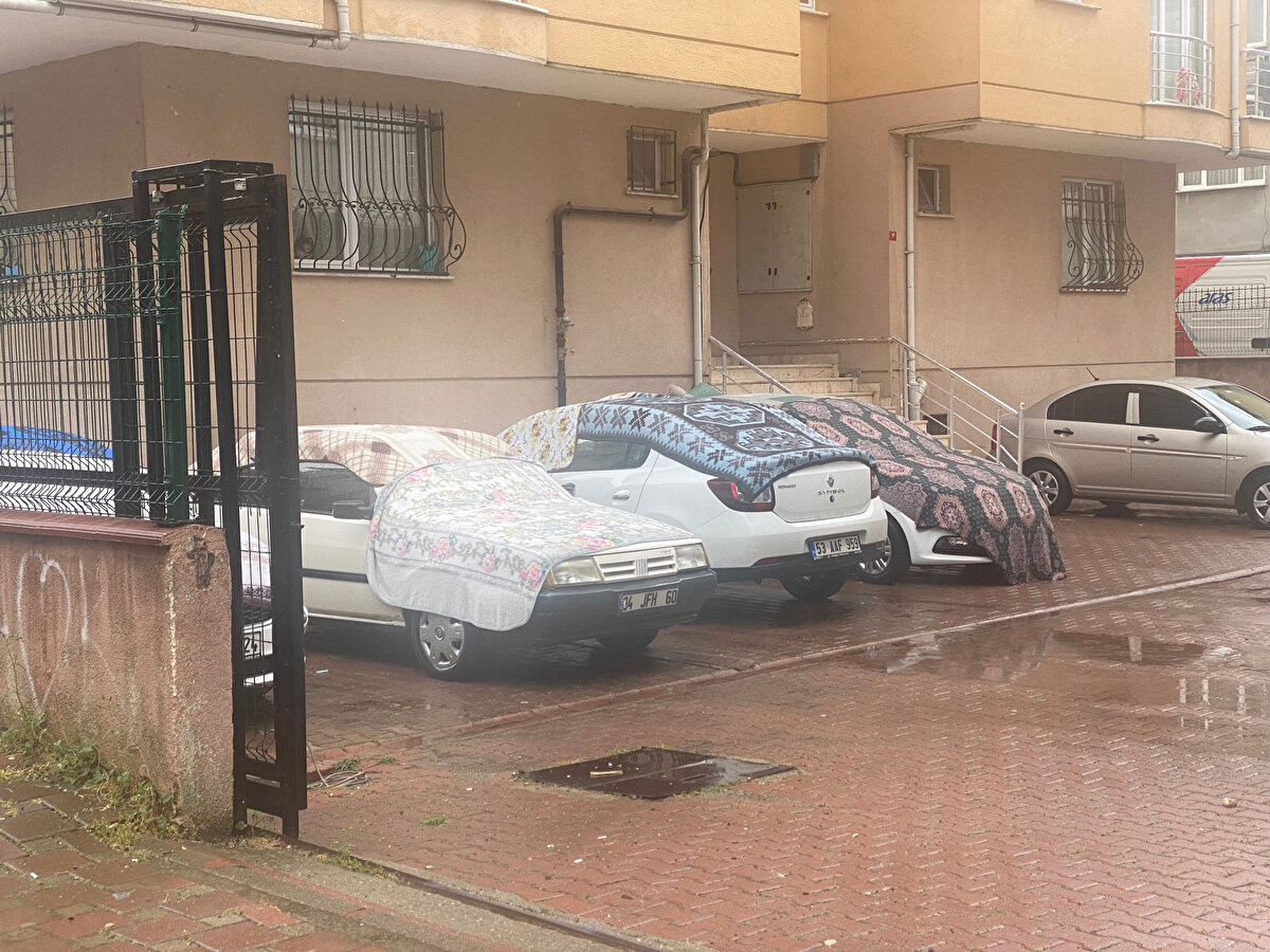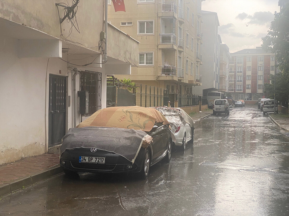 Çekmeköy ve Sultanbeyli çevresinde etkili olan doludan korunmak için bazı vatandaşlar araçlarını halı ve battaniyelerle kapladı.