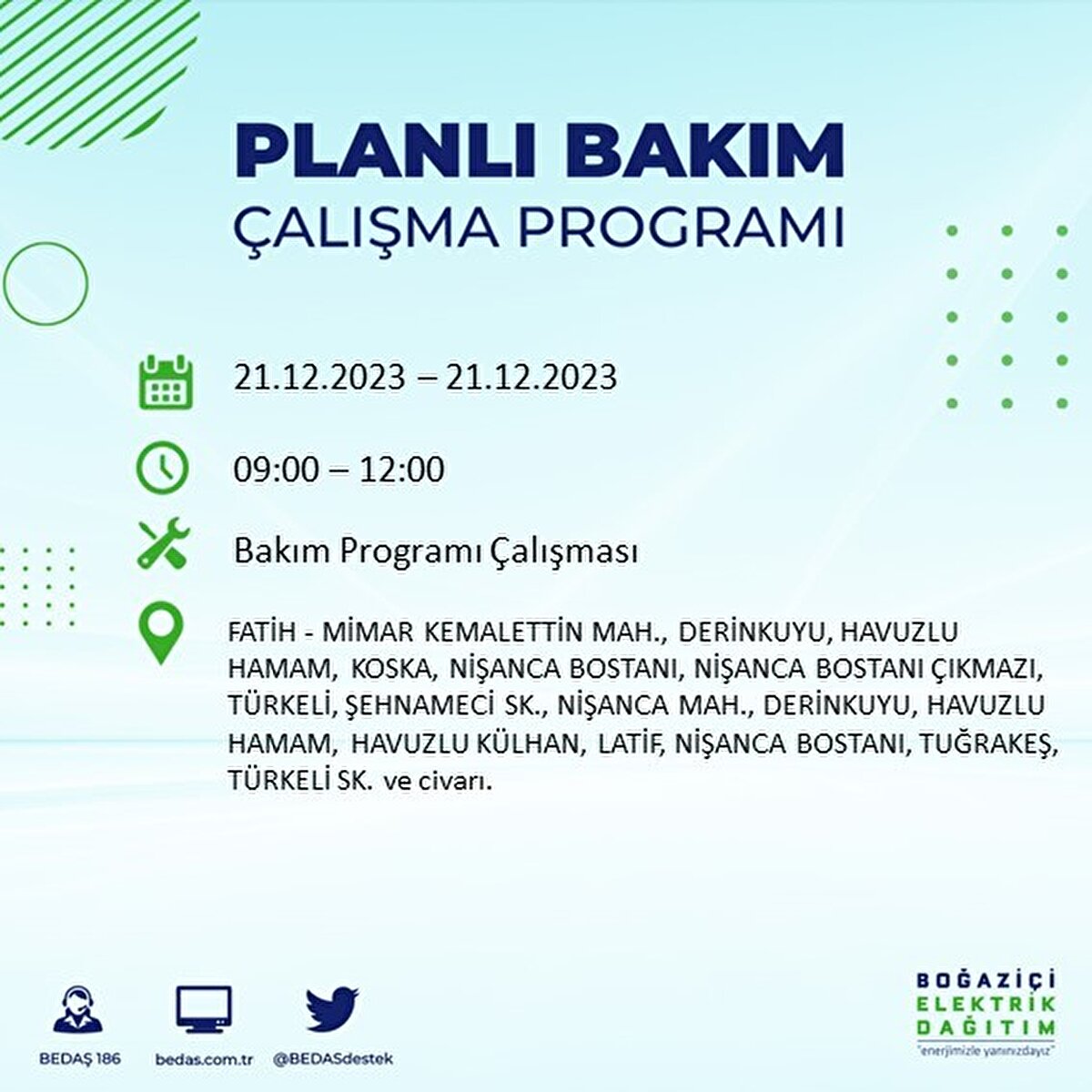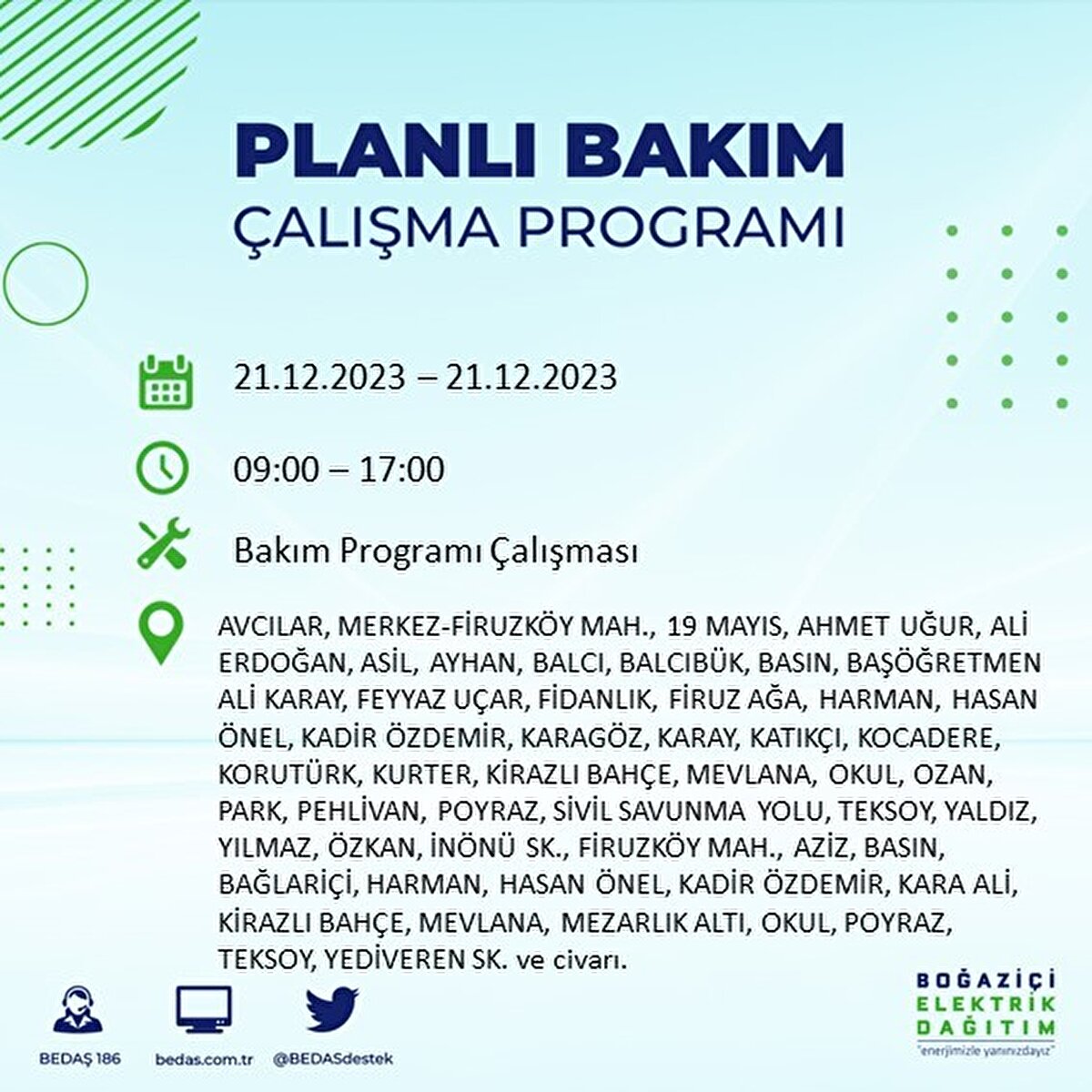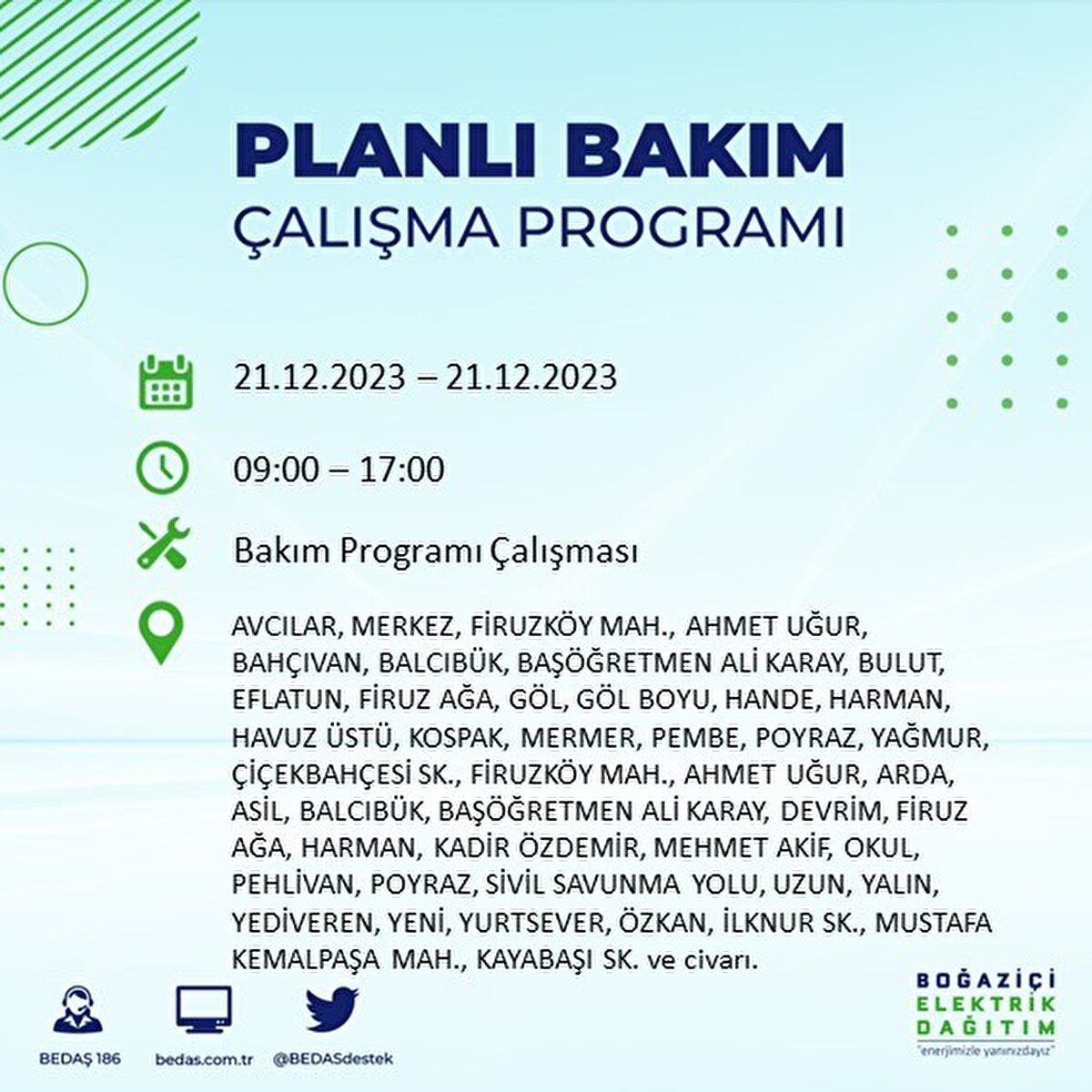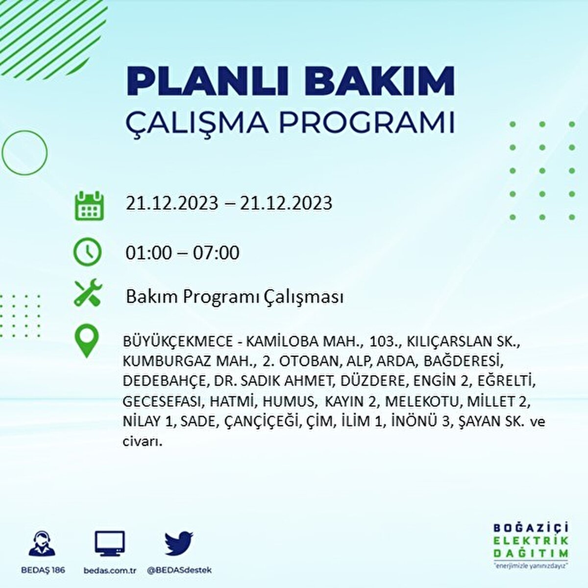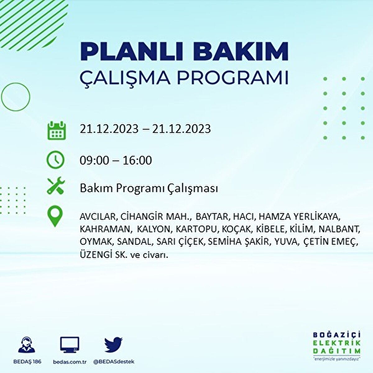 Boğaziçi Elektrik Dağıtım A.Ş (BEDAŞ) tarafından yayımlanan duyuruda İstanbul'un 21 ilçesinde elektrik kesintisi yapılacağı açıklandı. BEDAŞ'ın yayımladığı programa göre, Arnavutköy, Avcılar, Bağcılar, Bahçelievler, Bakırköy, Başakşehir, Beşiktaş, Beylikdüzü, Beyoğlu ve daha birçok ilçede bugün elektrik kesintisi yaşanacak.