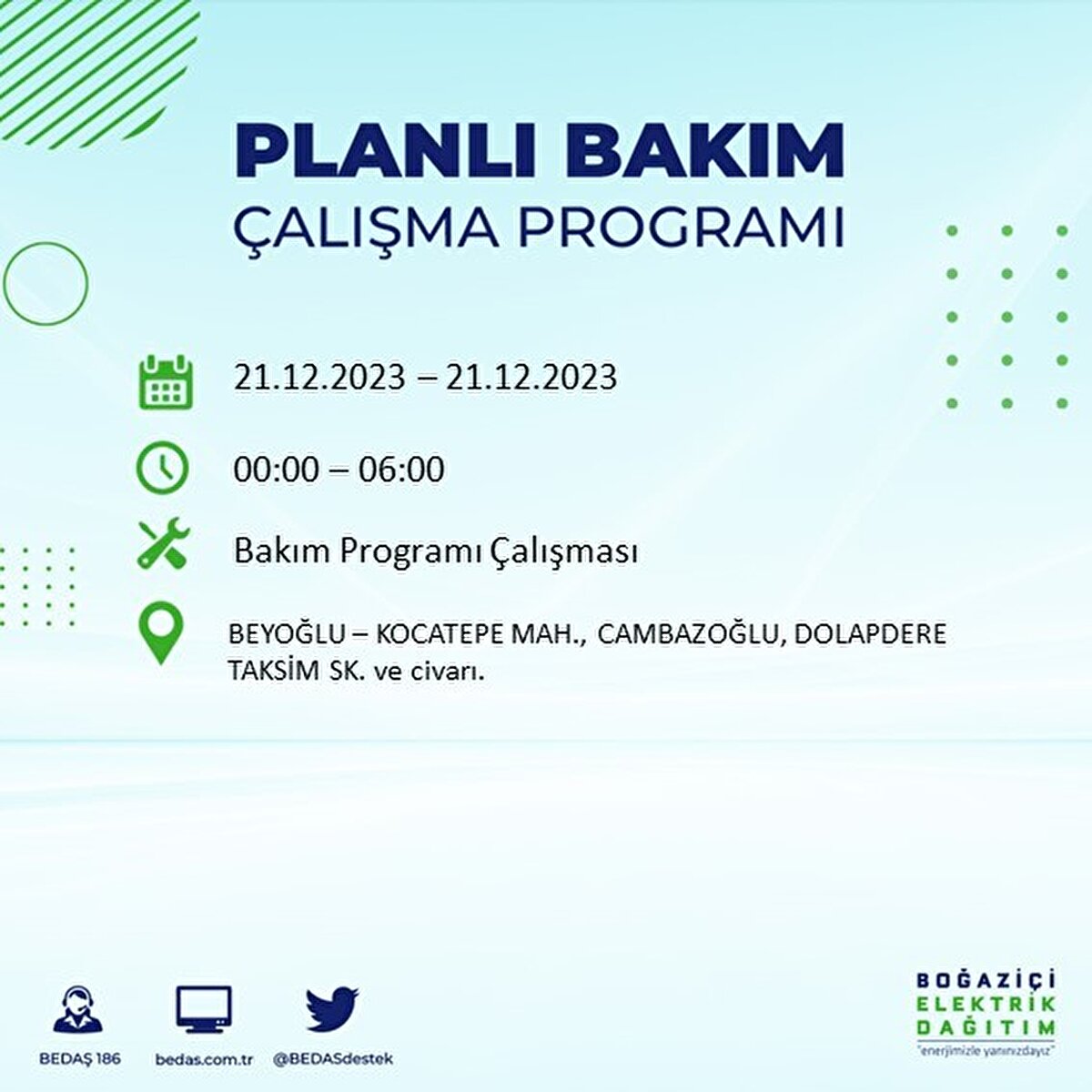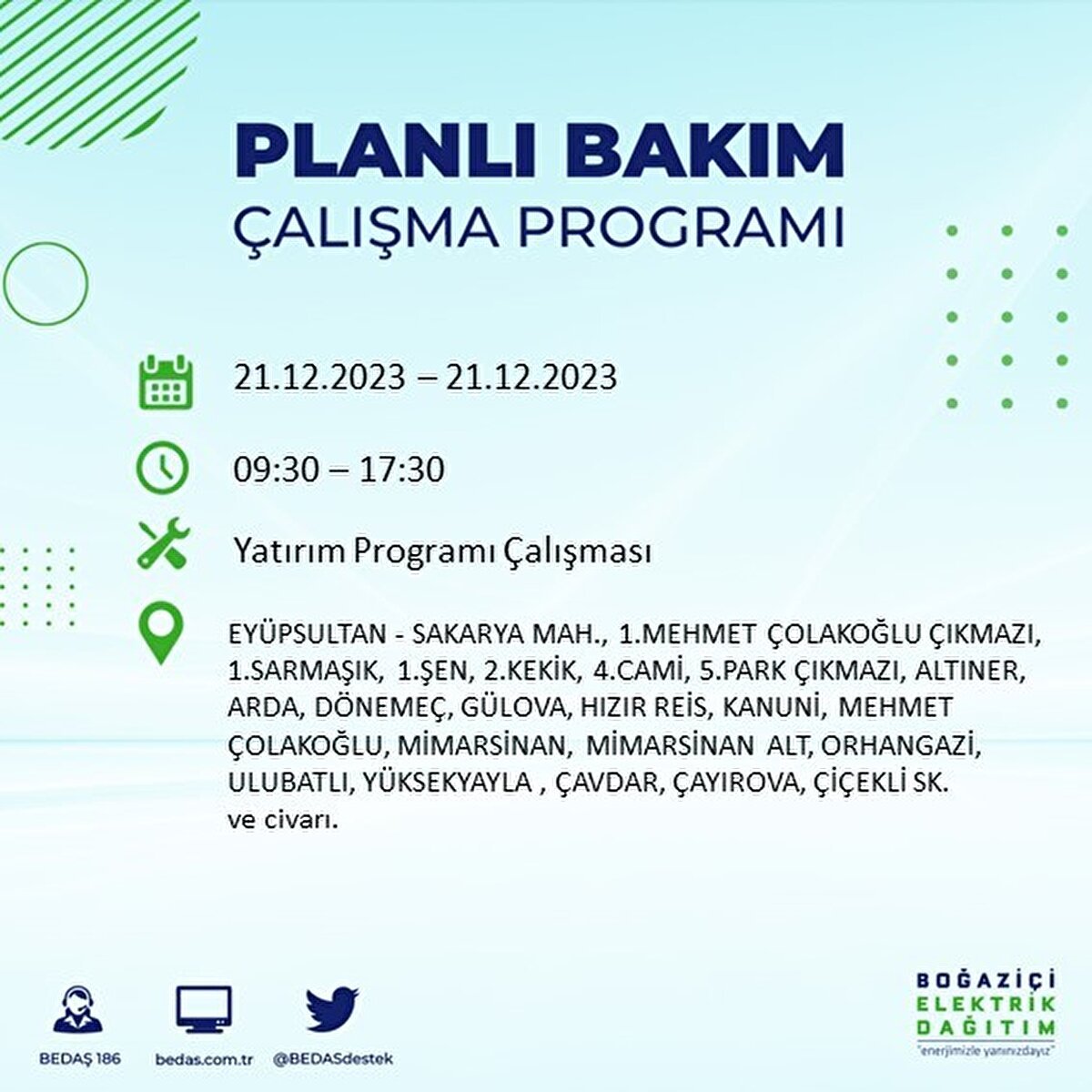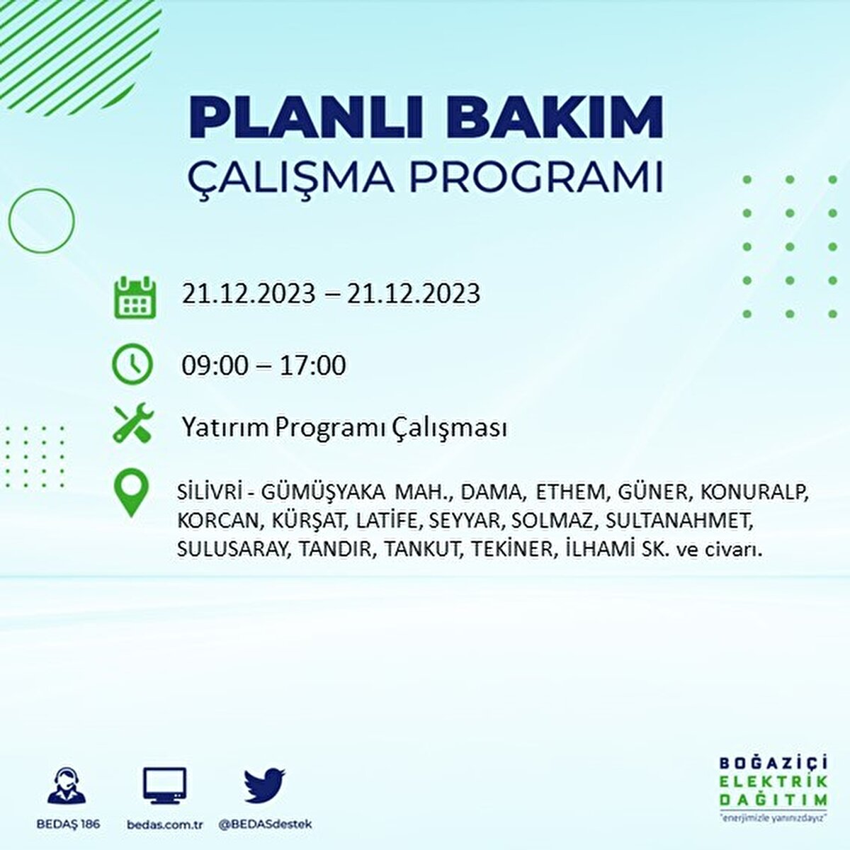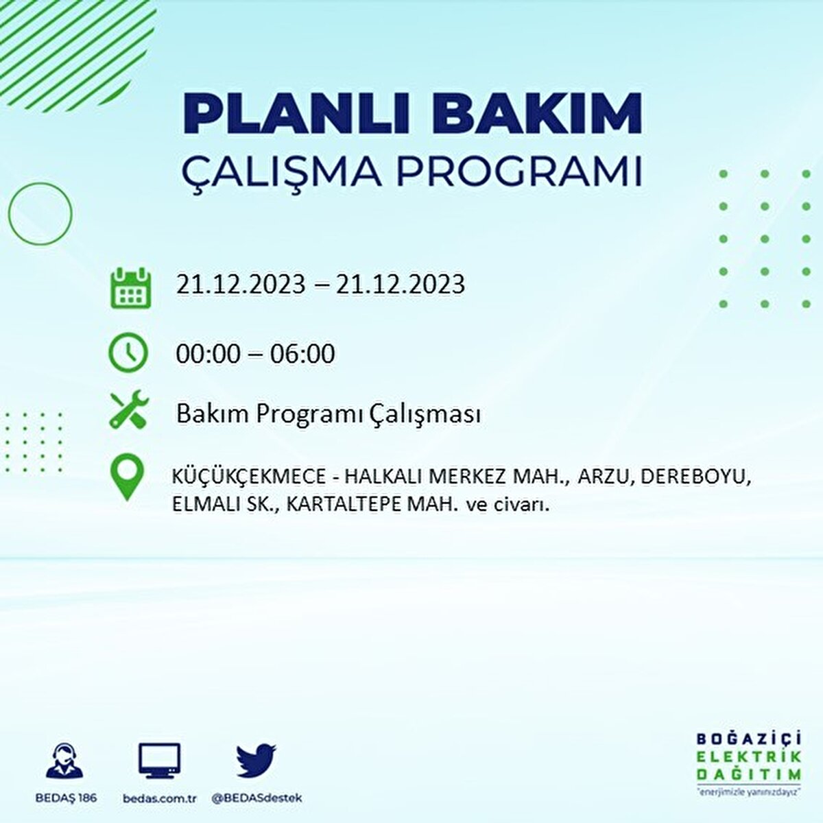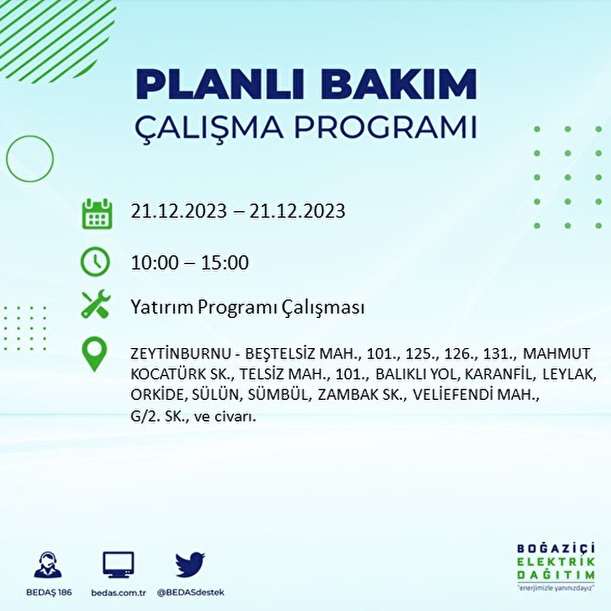 Boğaziçi Elektrik Dağıtım A.Ş (BEDAŞ) tarafından yayımlanan duyuruda İstanbul'un 21 ilçesinde elektrik kesintisi yapılacağı açıklandı. BEDAŞ'ın yayımladığı programa göre, Arnavutköy, Avcılar, Bağcılar, Bahçelievler, Bakırköy, Başakşehir, Beşiktaş, Beylikdüzü, Beyoğlu ve daha birçok ilçede bugün elektrik kesintisi yaşanacak.