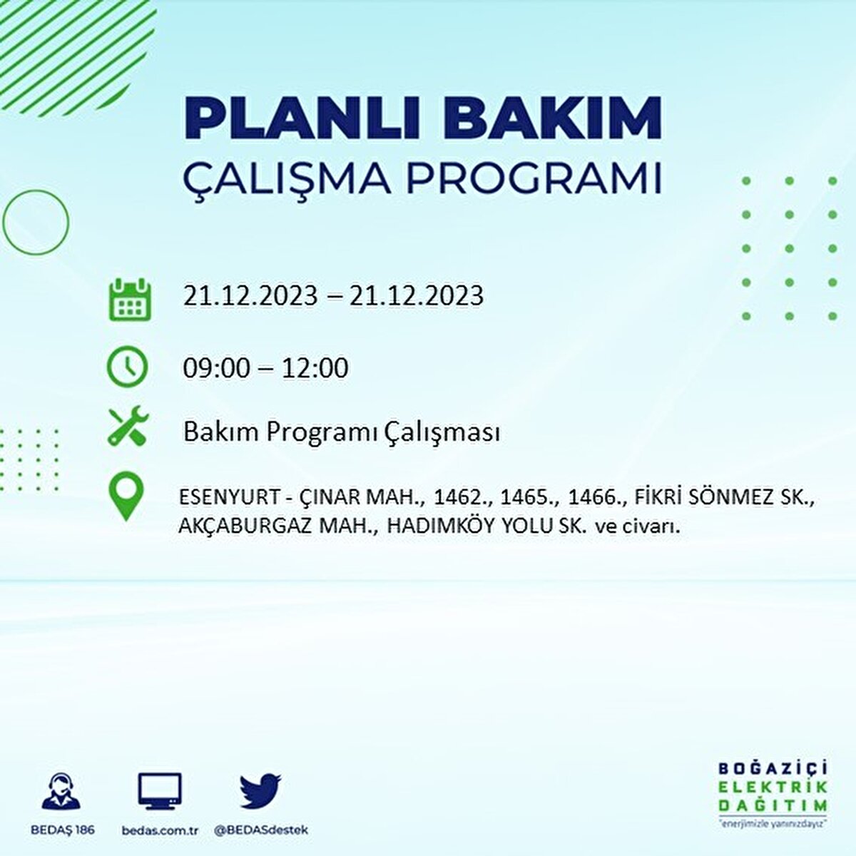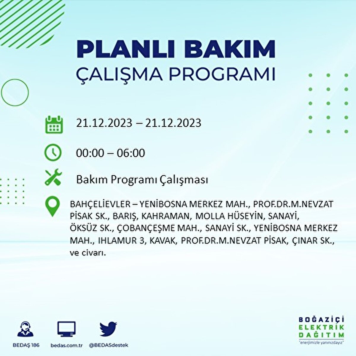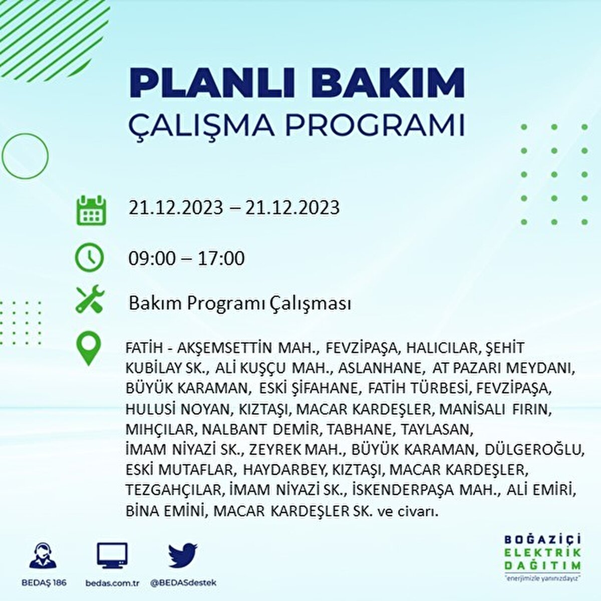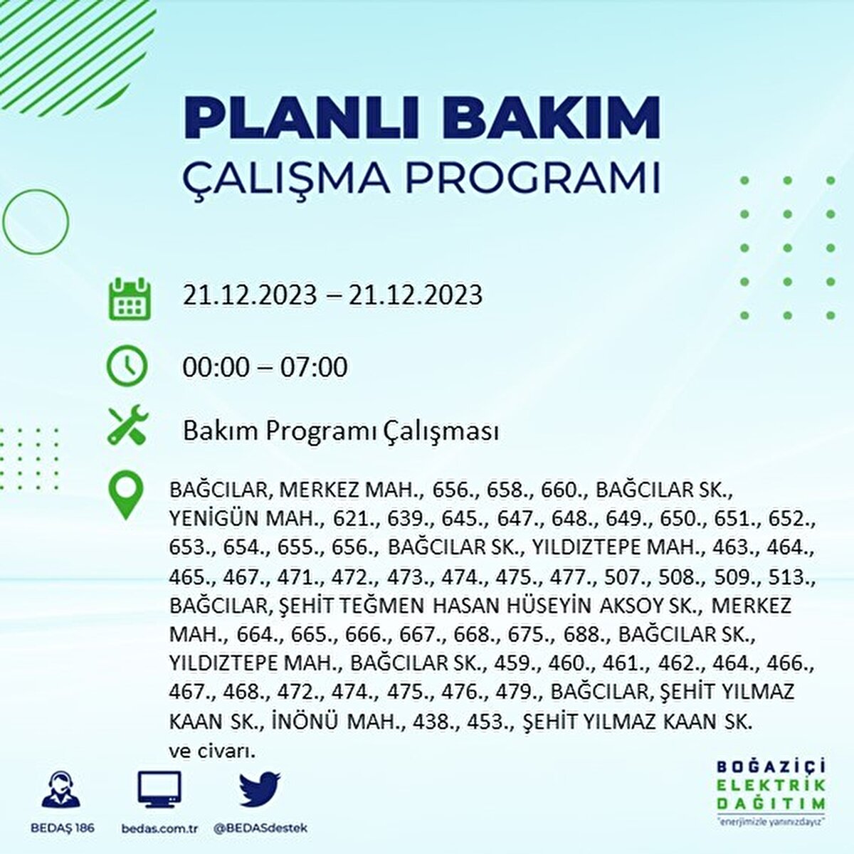 Boğaziçi Elektrik Dağıtım A.Ş (BEDAŞ) tarafından yayımlanan duyuruda İstanbul'un 21 ilçesinde elektrik kesintisi yapılacağı açıklandı. BEDAŞ'ın yayımladığı programa göre, Arnavutköy, Avcılar, Bağcılar, Bahçelievler, Bakırköy, Başakşehir, Beşiktaş, Beylikdüzü, Beyoğlu ve daha birçok ilçede bugün elektrik kesintisi yaşanacak.
