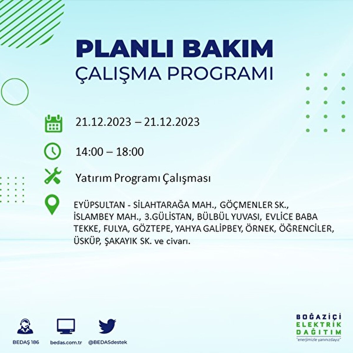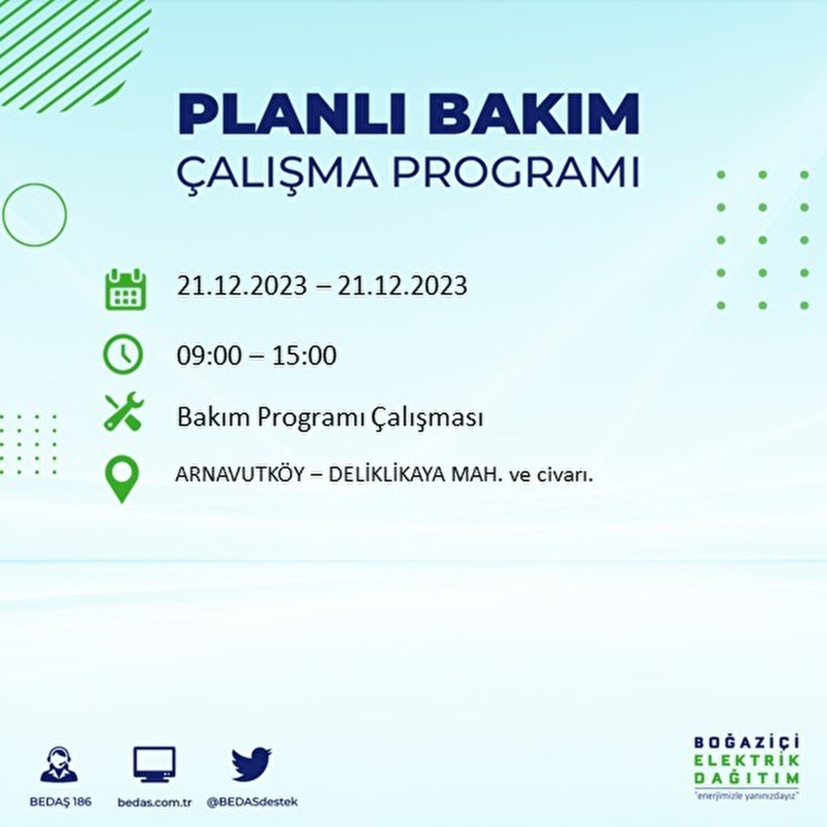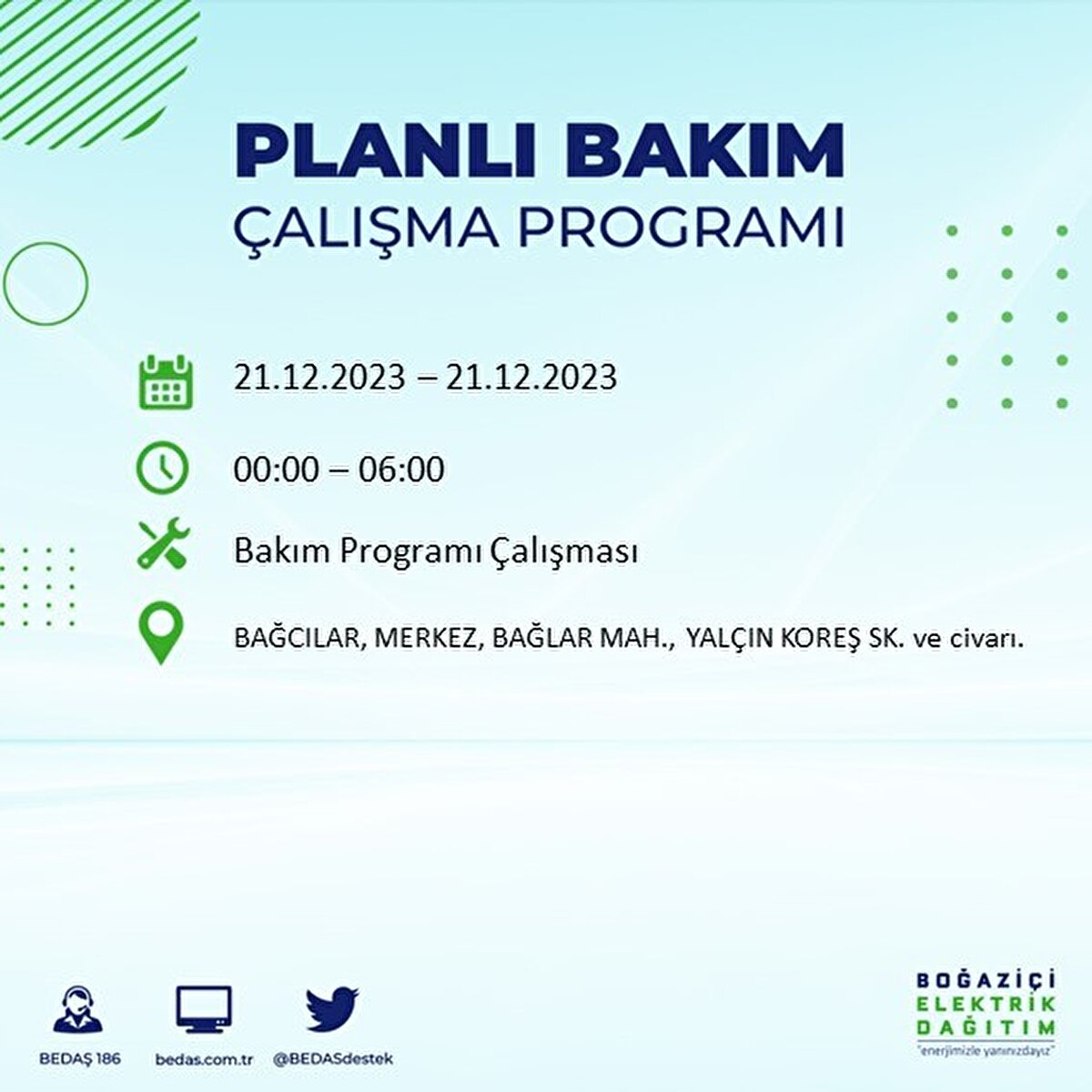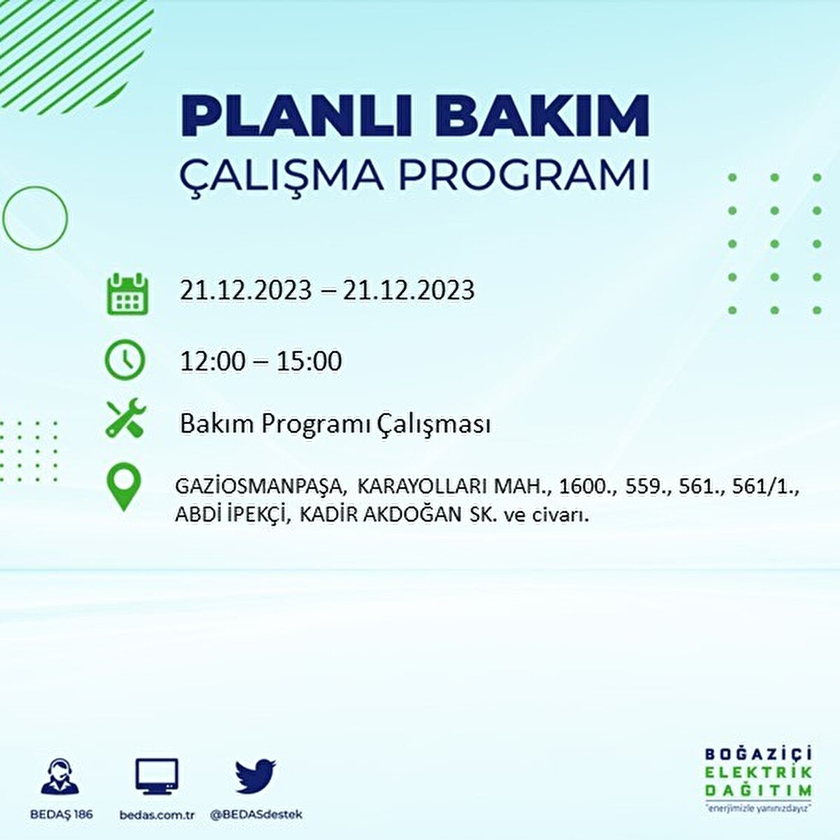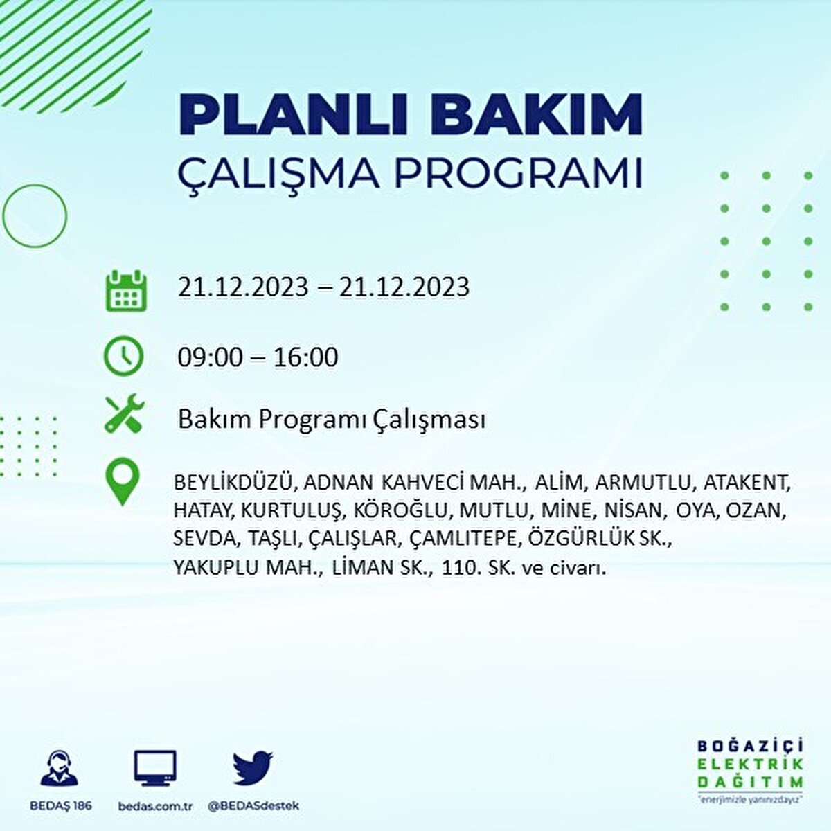 Boğaziçi Elektrik Dağıtım A.Ş (BEDAŞ) tarafından yayımlanan duyuruda İstanbul'un 21 ilçesinde elektrik kesintisi yapılacağı açıklandı. BEDAŞ'ın yayımladığı programa göre, Arnavutköy, Avcılar, Bağcılar, Bahçelievler, Bakırköy, Başakşehir, Beşiktaş, Beylikdüzü, Beyoğlu ve daha birçok ilçede bugün elektrik kesintisi yaşanacak.