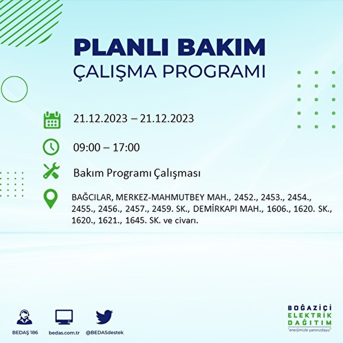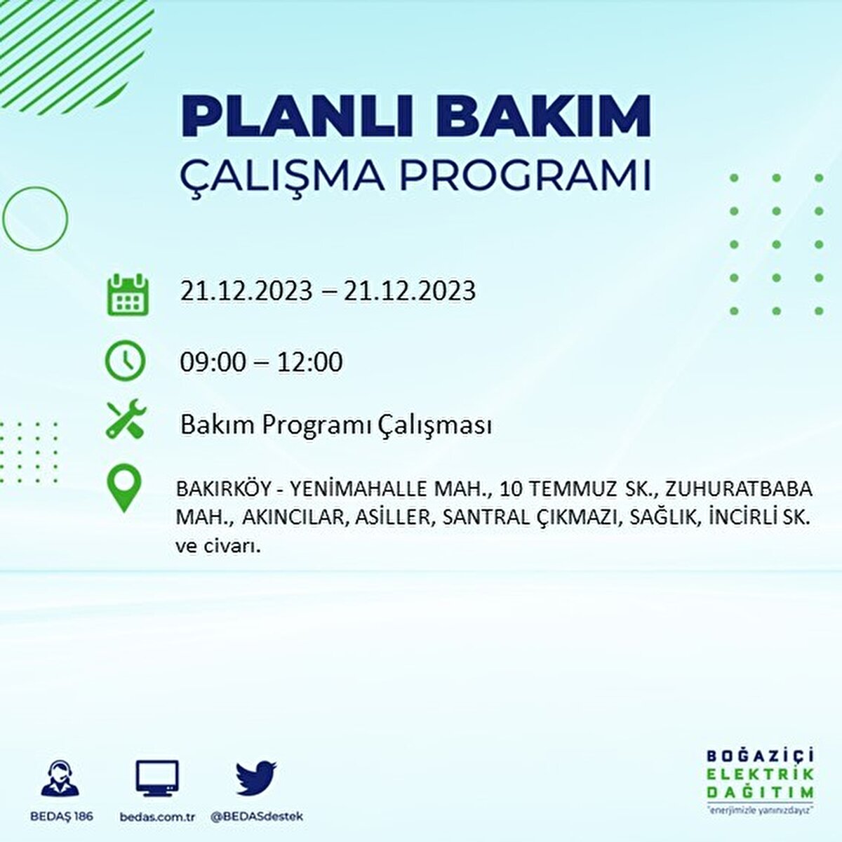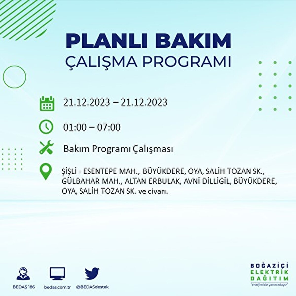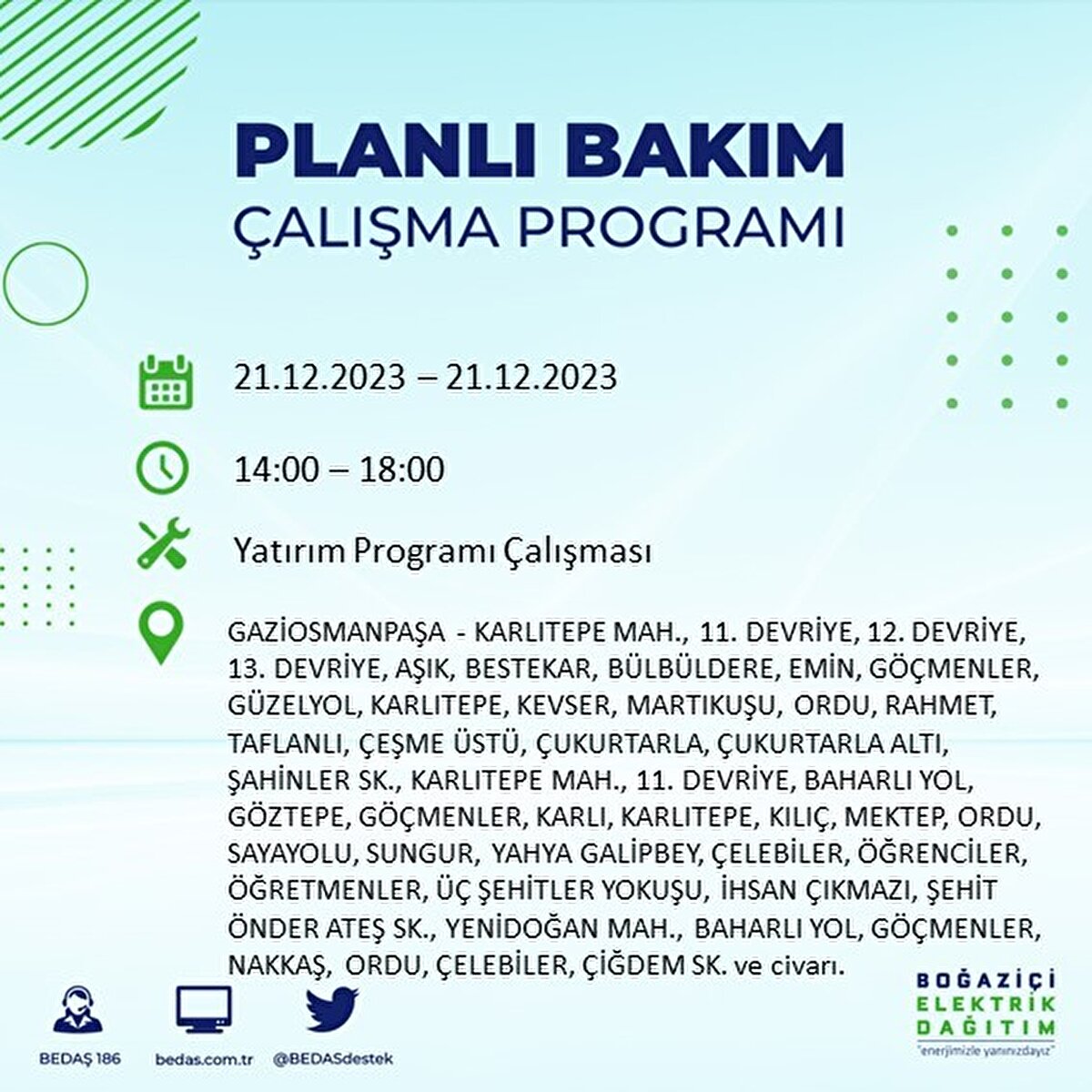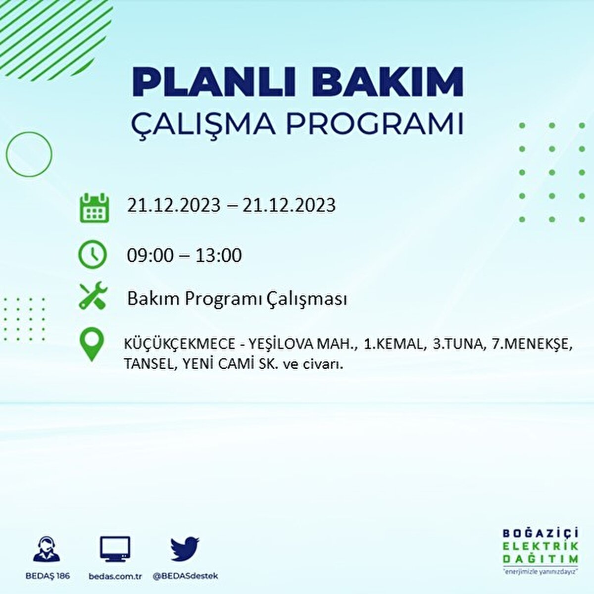 Boğaziçi Elektrik Dağıtım A.Ş (BEDAŞ) tarafından yayımlanan duyuruda İstanbul'un 21 ilçesinde elektrik kesintisi yapılacağı açıklandı. BEDAŞ'ın yayımladığı programa göre, Arnavutköy, Avcılar, Bağcılar, Bahçelievler, Bakırköy, Başakşehir, Beşiktaş, Beylikdüzü, Beyoğlu ve daha birçok ilçede bugün elektrik kesintisi yaşanacak.