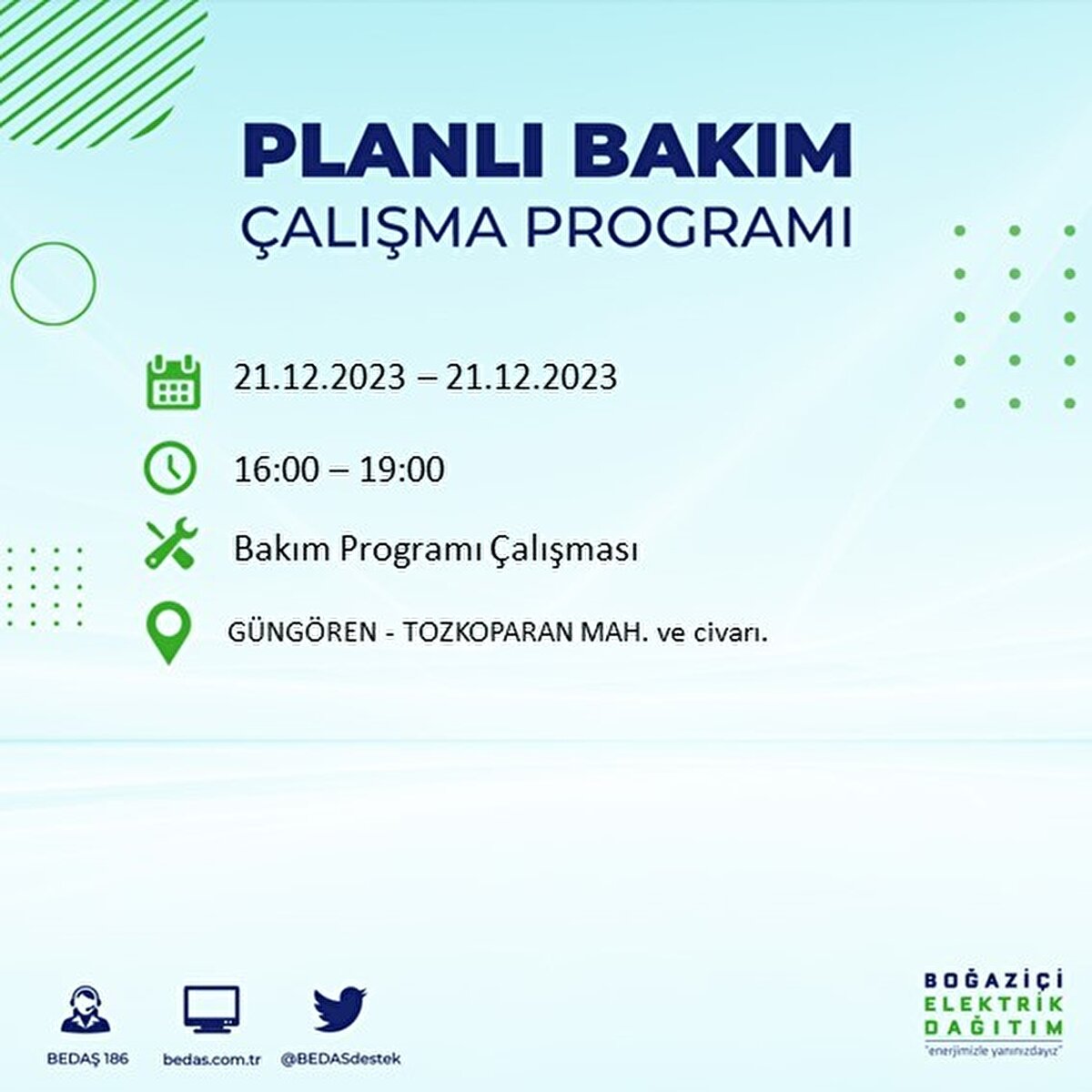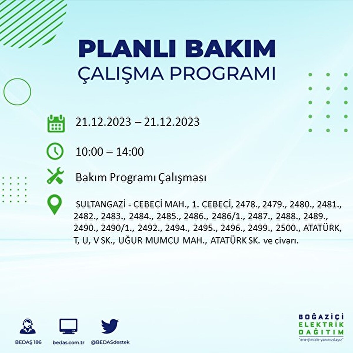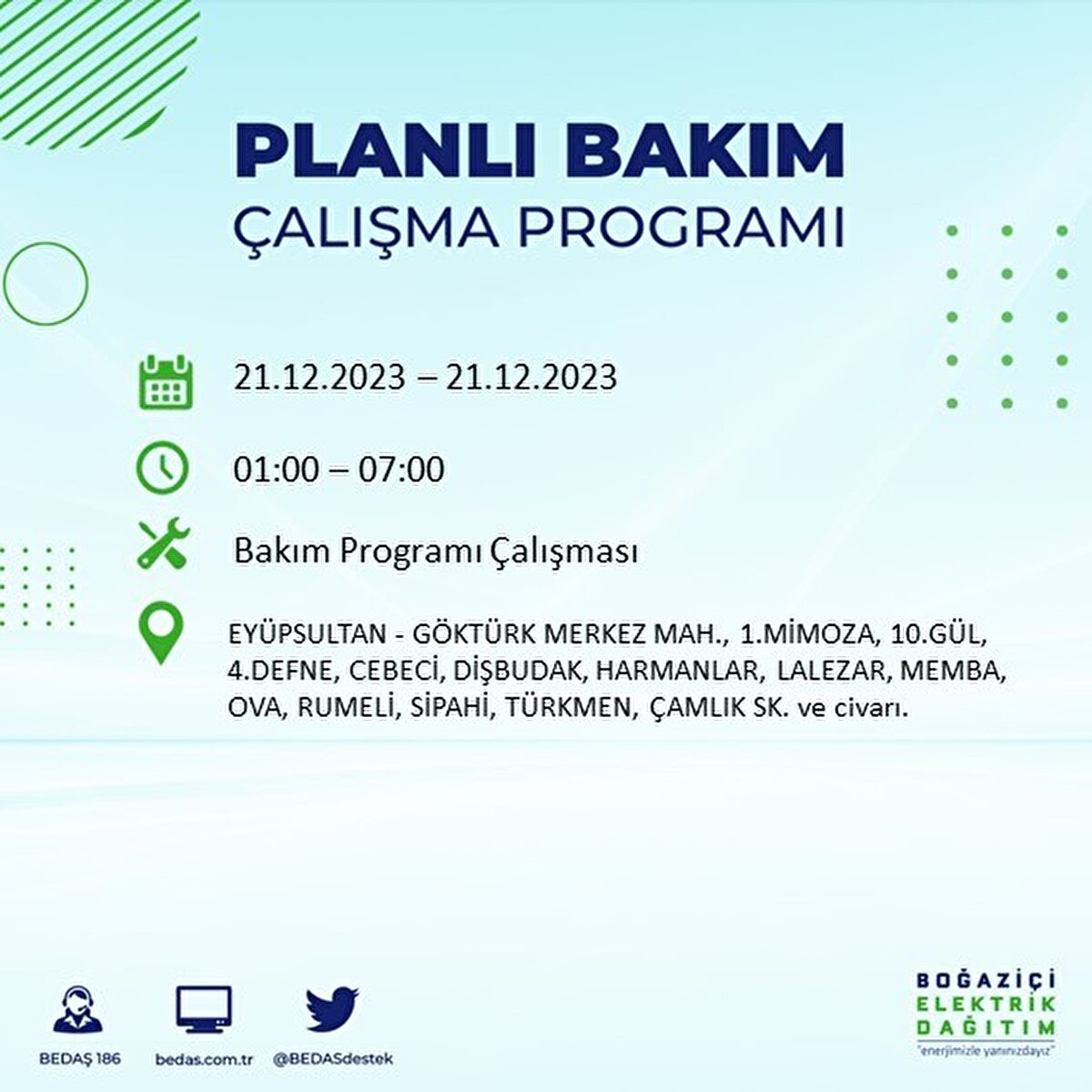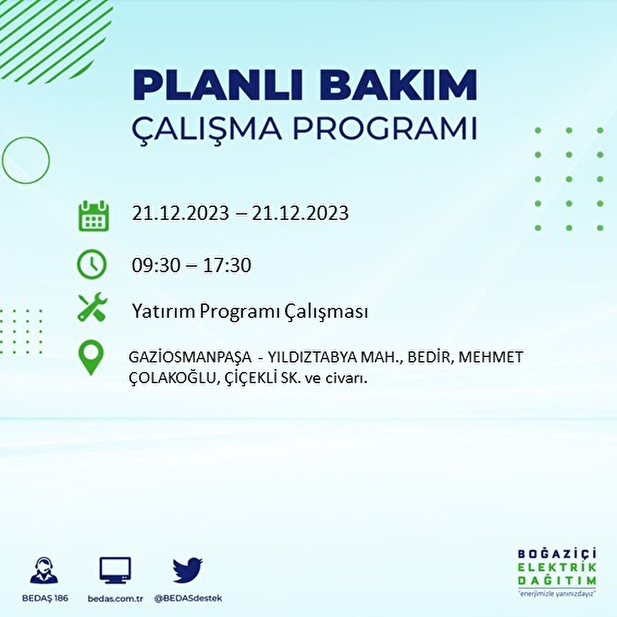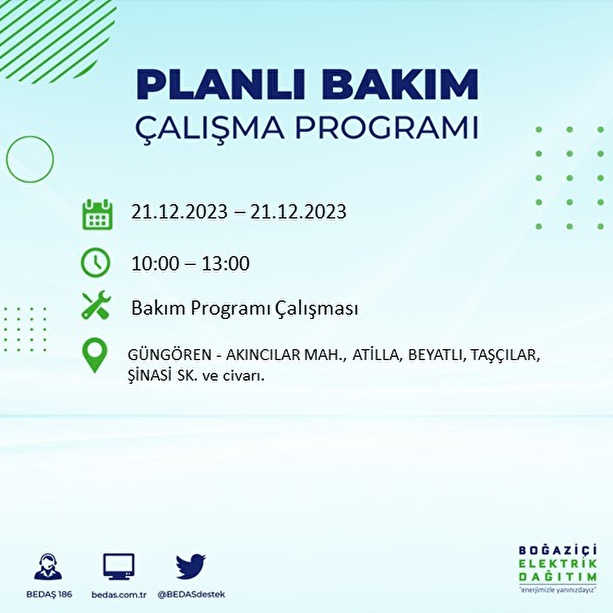 Boğaziçi Elektrik Dağıtım A.Ş (BEDAŞ) tarafından yayımlanan duyuruda İstanbul'un 21 ilçesinde elektrik kesintisi yapılacağı açıklandı. BEDAŞ'ın yayımladığı programa göre, Arnavutköy, Avcılar, Bağcılar, Bahçelievler, Bakırköy, Başakşehir, Beşiktaş, Beylikdüzü, Beyoğlu ve daha birçok ilçede bugün elektrik kesintisi yaşanacak.