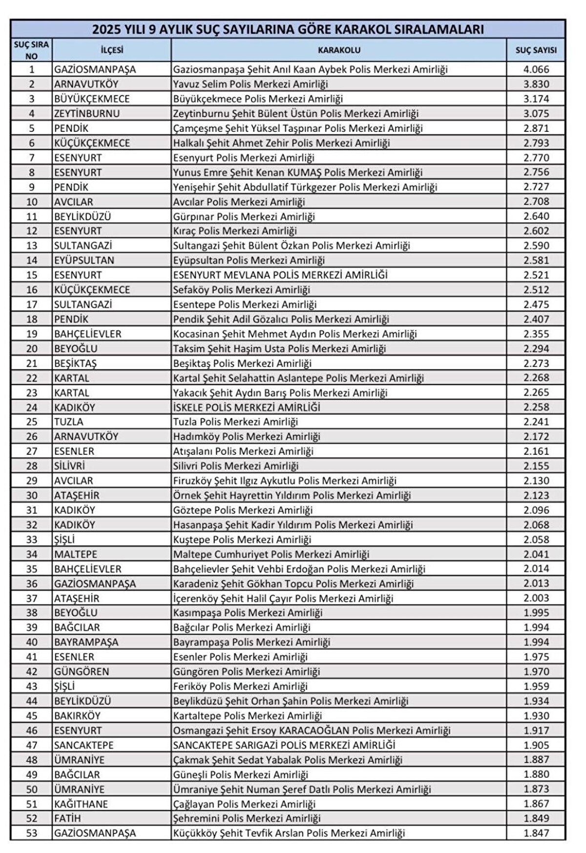 Emniyet verilerine göre, İstanbul'da yılın ilk dokuz ayında karakol bazında en fazla suç kaydı bulunan bölgeler açıklandı. Genellikle Avrupa Yakası'nın yoğun ilçeleri listede ön sıralarda yer alsa da, Anadolu Yakası'ndan da dikkat çeken karakollar bulunuyor. İşte o liste...