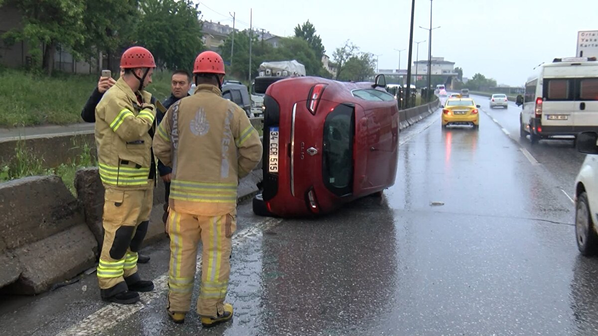 İstanbul Kartal'da yolda oluşan su birikintisine giren otomobil, sürücüsünün direksiyon hakimiyetini kaybetmesi sonucu beton bariyerlere çarparak devrildi.