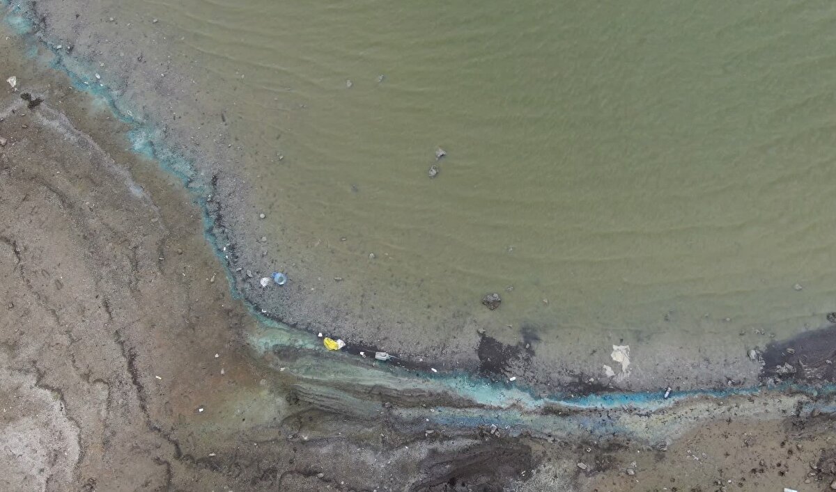 Suyun üzerine ayrı bir katman oluşturan tabakanın göl kenarındaki otlara ve taşlara da bulaştı.
