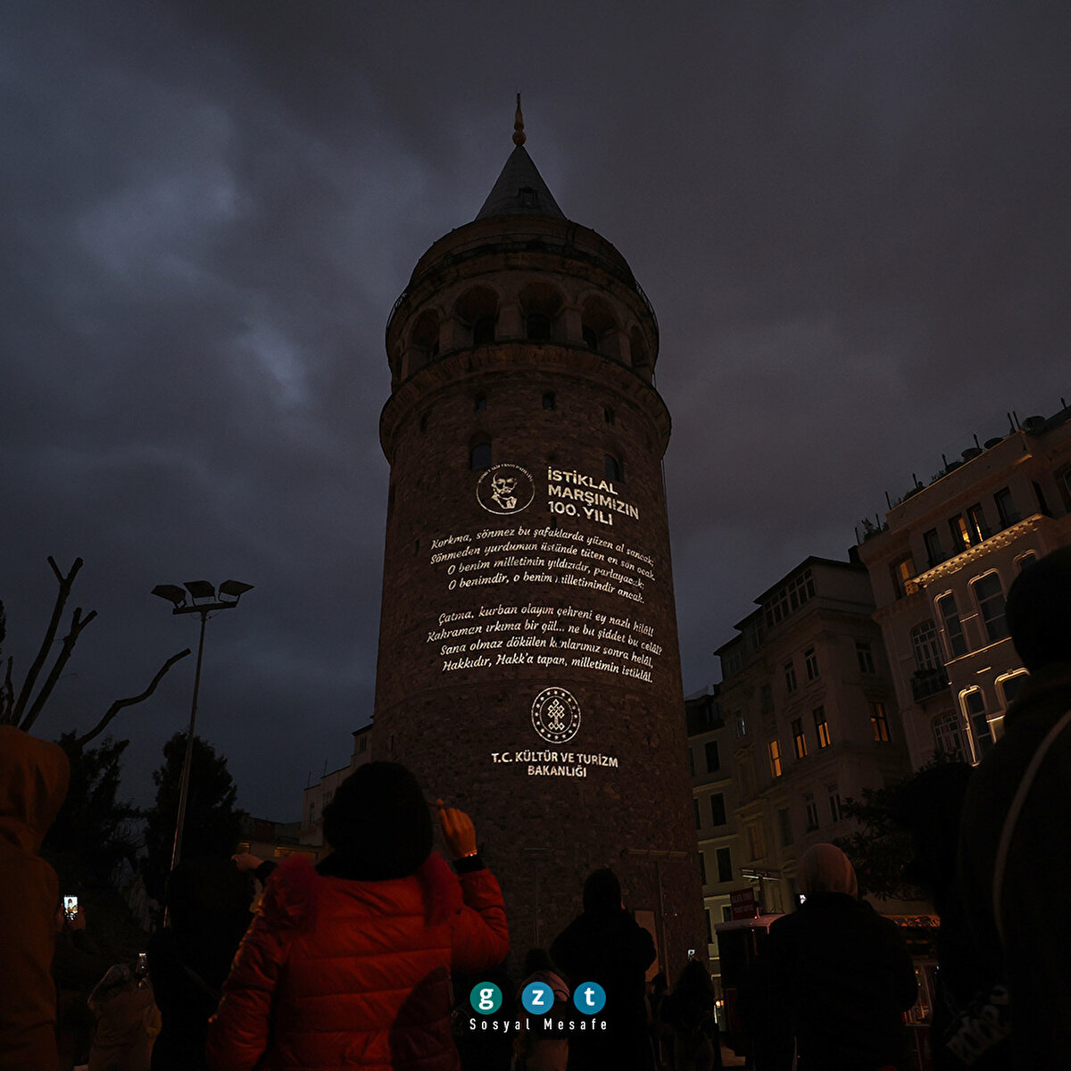 Kültür ve Turizm Bakanlığı, İstiklal Marşı'nın kabulünün 100'ncü kuruluş yıl dönümü için özel bir gösteri hazırladı. Türklerin Orta Asya'dan çıkışından günümüze kadar geçen dönemde tarihe adlarını yazdırmış önemli isimlere yer verilen gösteri “Mapping Show" yöntemiyle Galata Kulesi'ne yansıtıldı.