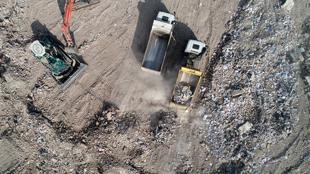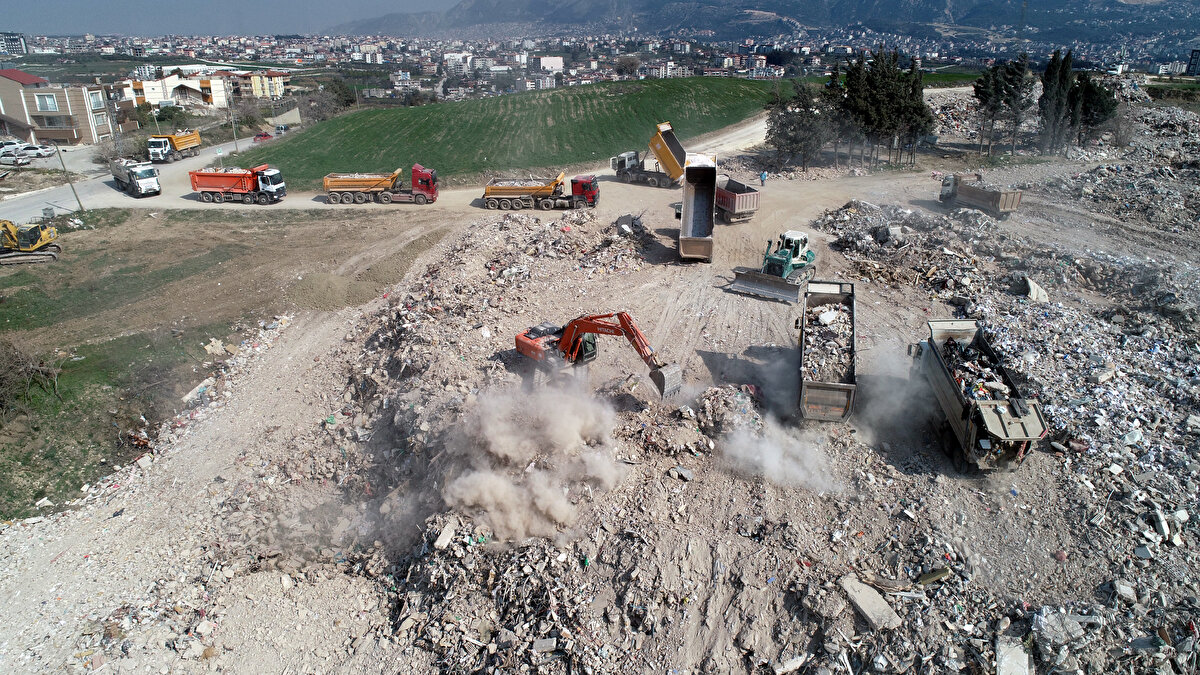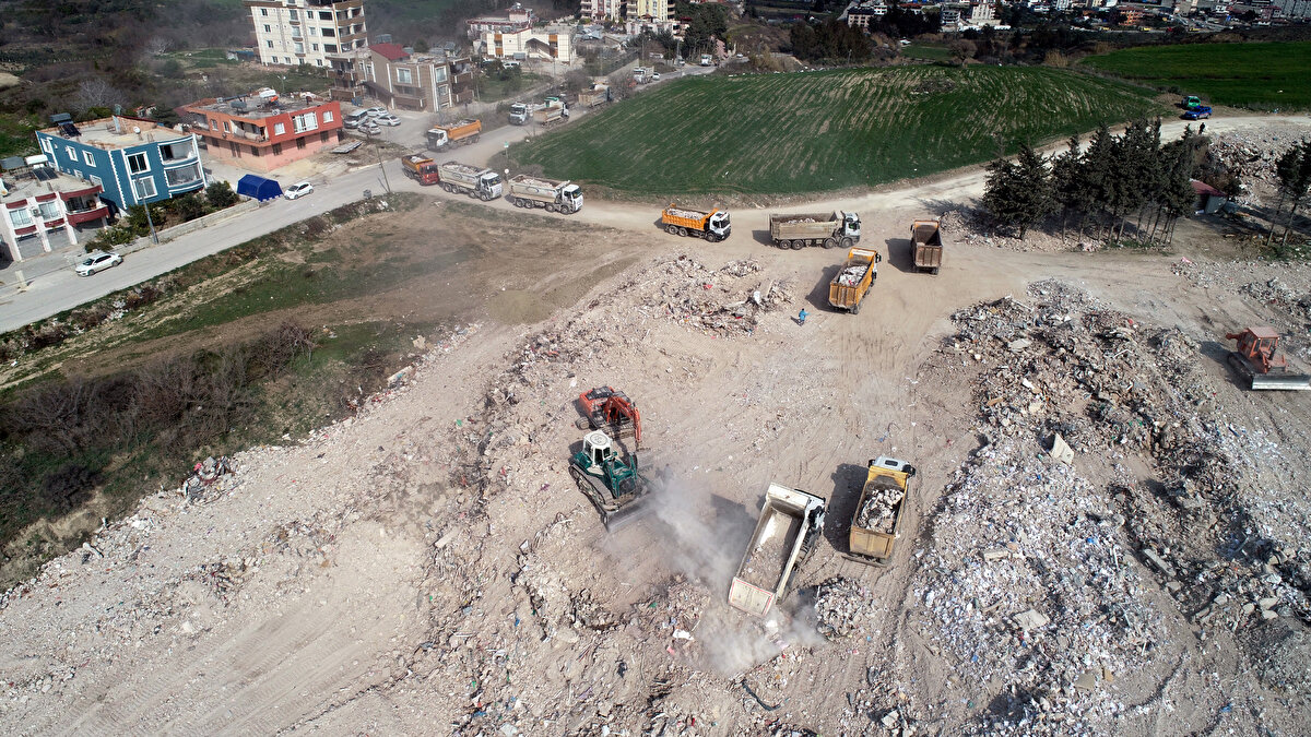 Hatay'da depremlerde yıkılan binaların enkazında yoğun bir çalışma yürütülüyor. İş makineleriyle hafriyat kamyonlarına yüklenen molozlar, toplama merkezine götürülüp, dökülüyor.