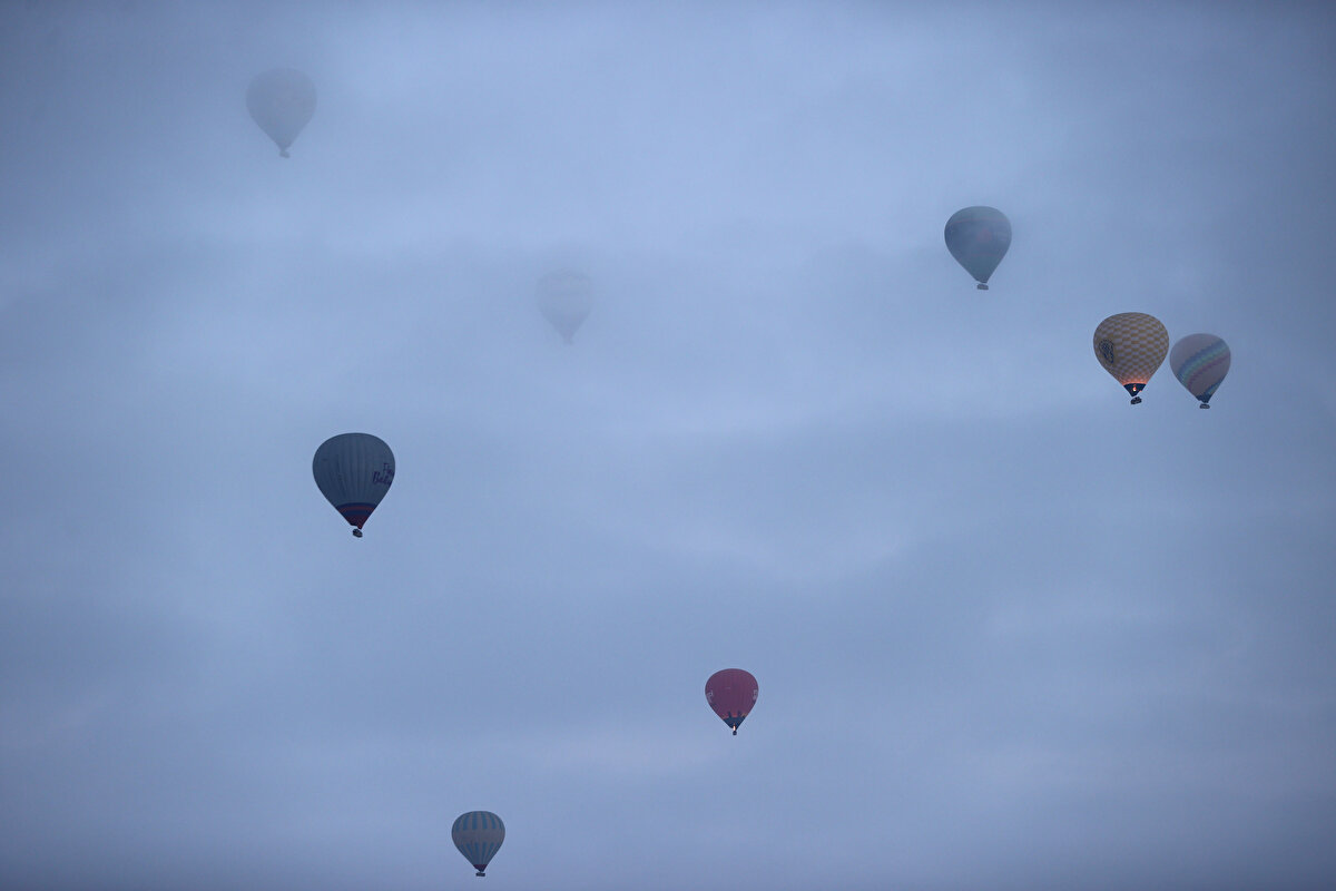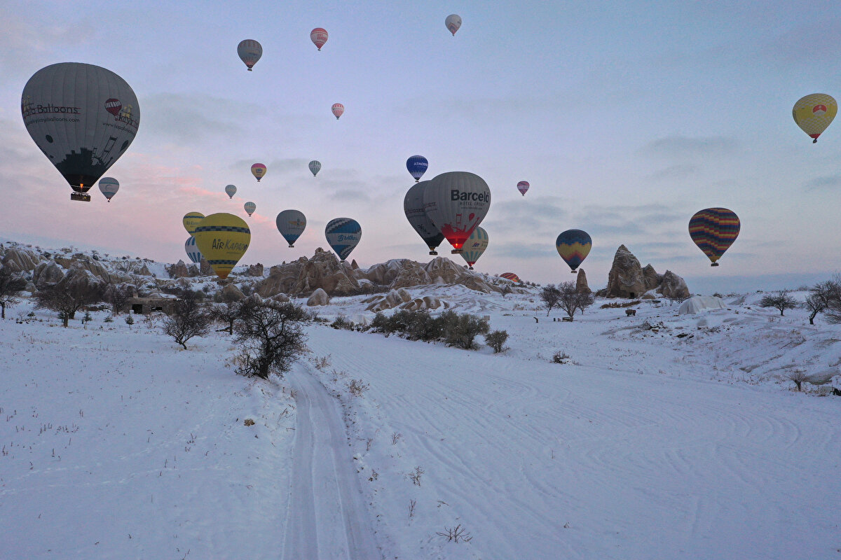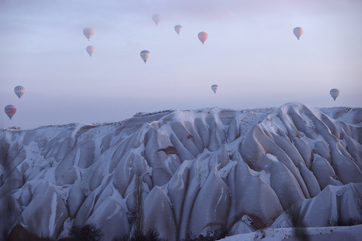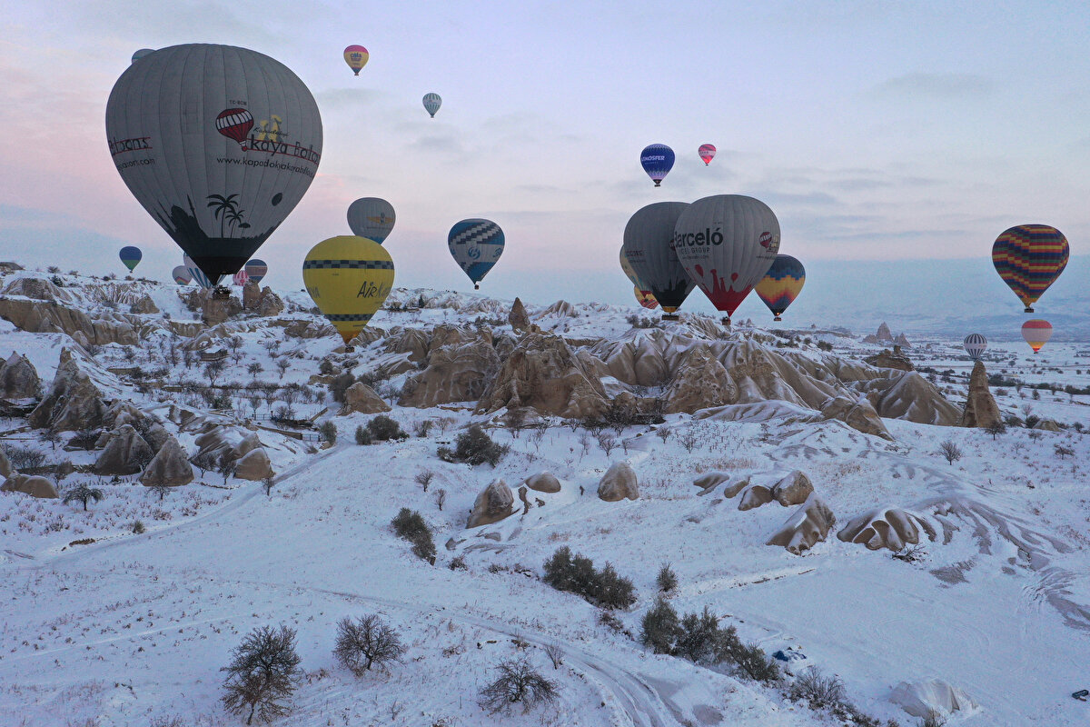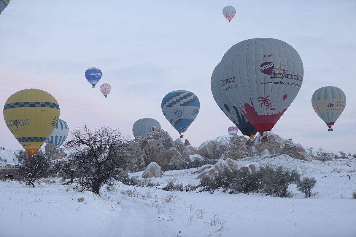 Kar yağışı ile beyaz örtüyle kaplanan Kapadokya'da olumsuz hava koşullarından dolayı 6 gündür gerçekleştirilemeyen sıcak hava balon turları yeniden başladı.