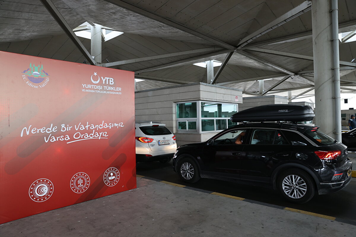 Yurtdışı Türkler ve Akraba Topluluklar Başkanlığı personeli de Kapıkule'de gurbetçileri dönüş yolunda kolonya ve kentin yöresel tatlılarından ikram edip uğurluyor