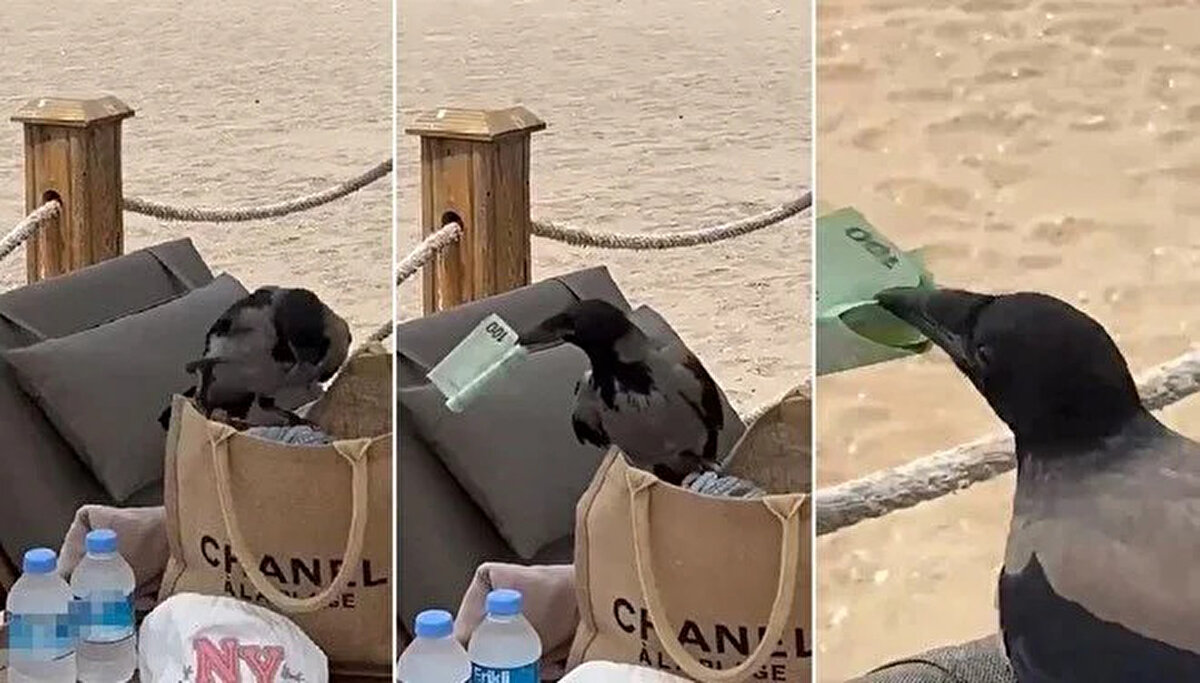 Serik ilçesi Belek turizm merkezinde yaşanan olayda, bir otelin sahilinde yüzmeye gelen turistlerin olduğu masaya konan karga, ağzı açık çantandan 100 euroyu gagasıyla aldı.