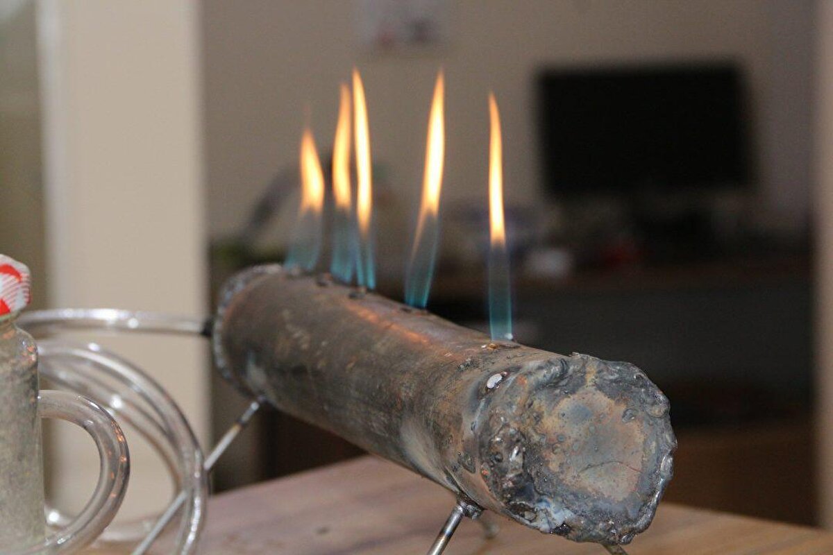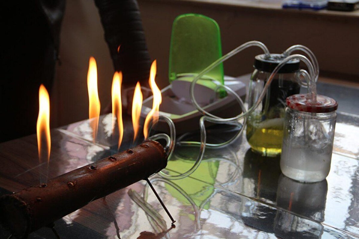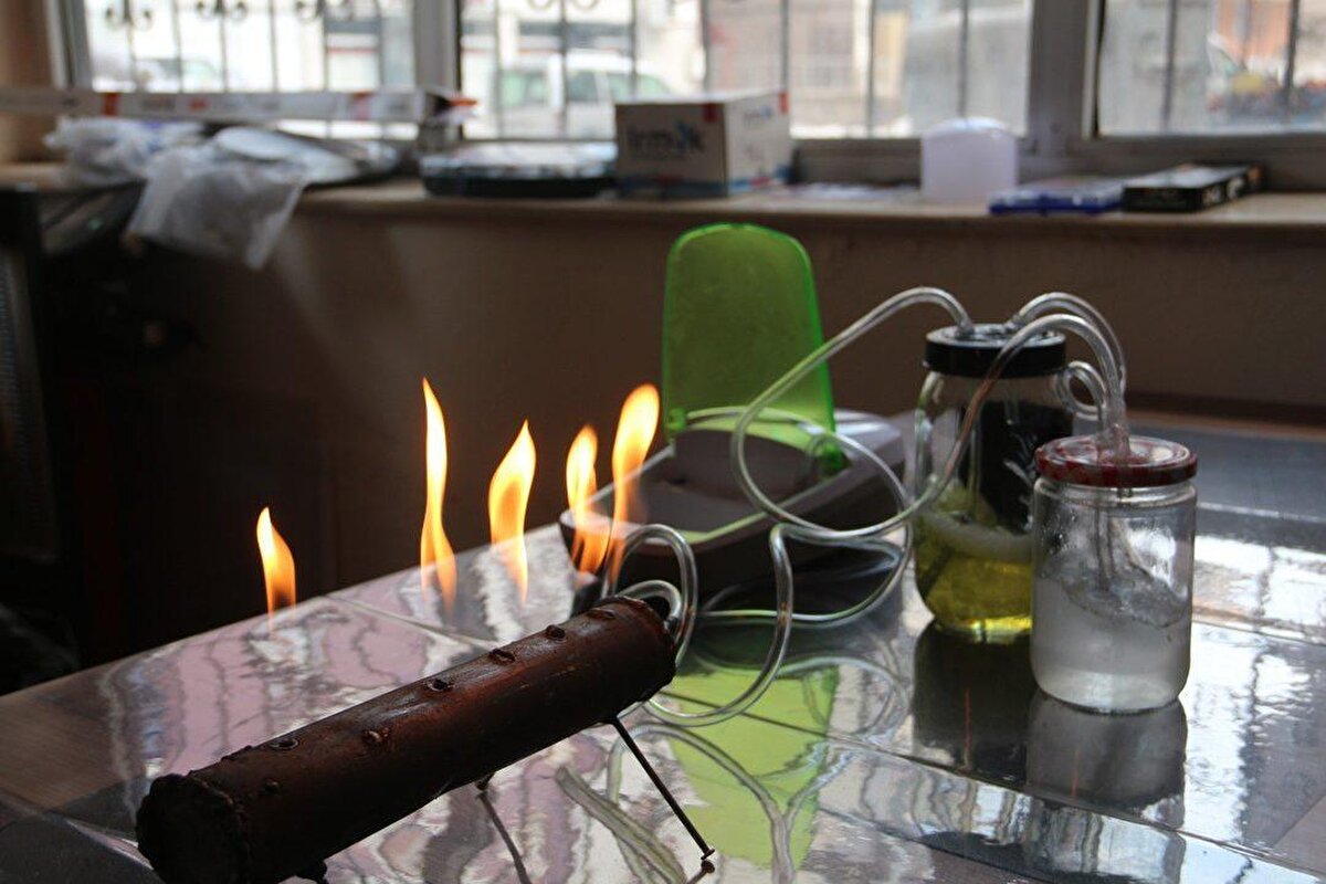 Karaca, “Yaptığımız bu sistem iki kavanoz, buhar makinesi ve ısıya dayanıklı borulardan oluşuyor. Bir kavanoza yarım litreden az benzin diğer kavanoza da yarısı kadar su ekliyoruz. Aradaki bağlantıları ısıya dayanıklı borularla yapıyoruz. Buhar makinesindeki hava benzinin yoğunlaşmasına sebep oluyor, bu da sudaki hidrojenle birleşip ateşe, yakıta dönüşüyor” dedi.