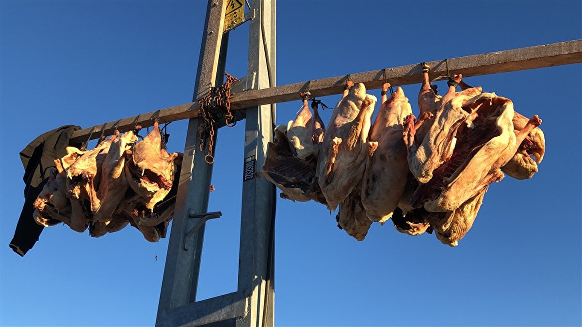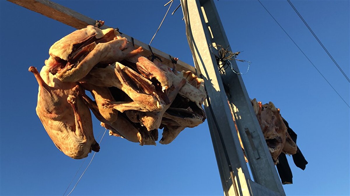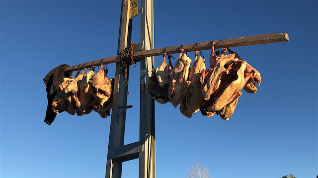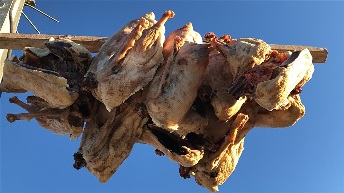 Kars'ın Arpaçay ilçesine bağlı Güvercin köyünde kaz kesimleri, geçen ay yapıldı. Kesilen kazların yaklaşık 1 ay sürecek kurutulma işlemine de başlandı. Köylüler, yaz aylarında bakım ve beslenmelerini yaptıkları kazları kestikten sonra evlerinin çatı saçaklarının altlarına veya direklere asıyor.