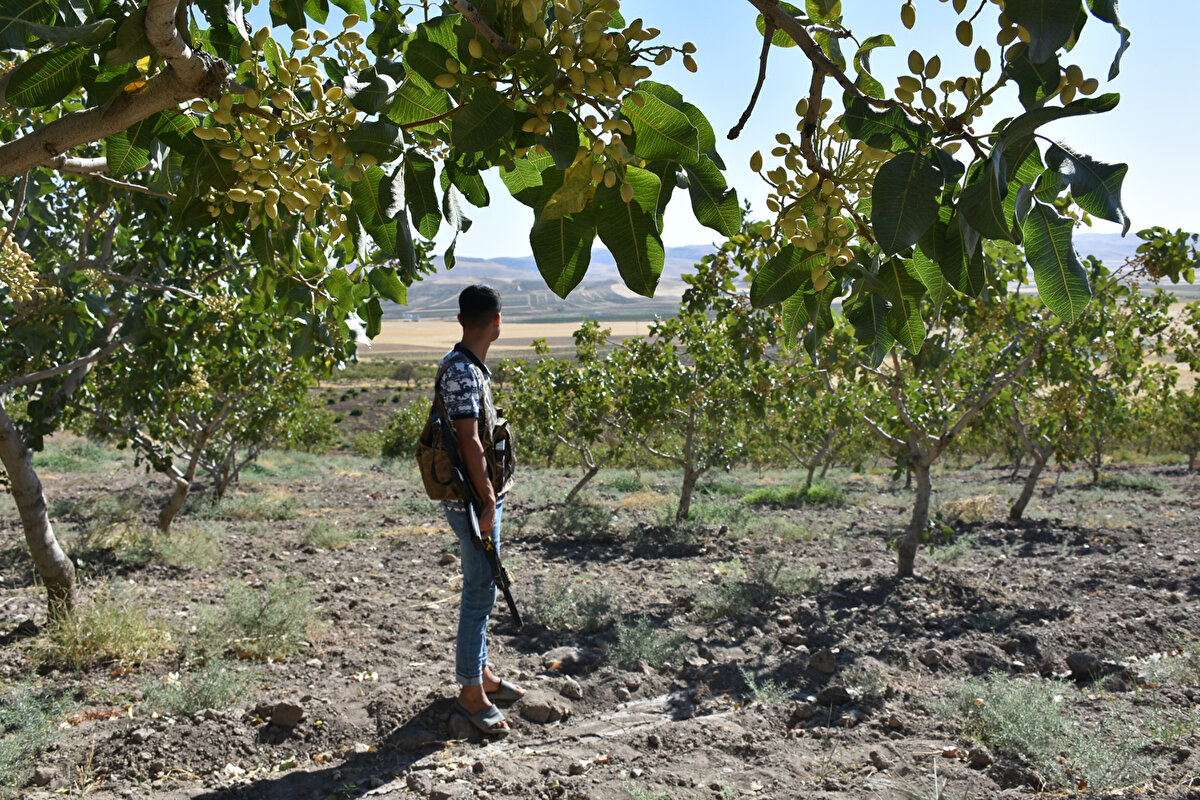 Batman'ın Beşiri ilçesinde 'yeşil altın' olarak adlandırılan fıstığın hasat dönemi yaklaştıkça üreticiler de önlemlerini artırdı. Gelecek ay hasadına başlanacak fıstık bahçelerinde üreticiler, mahsulleri çalınmasın diye silahla nöbet tutmaya başladı.