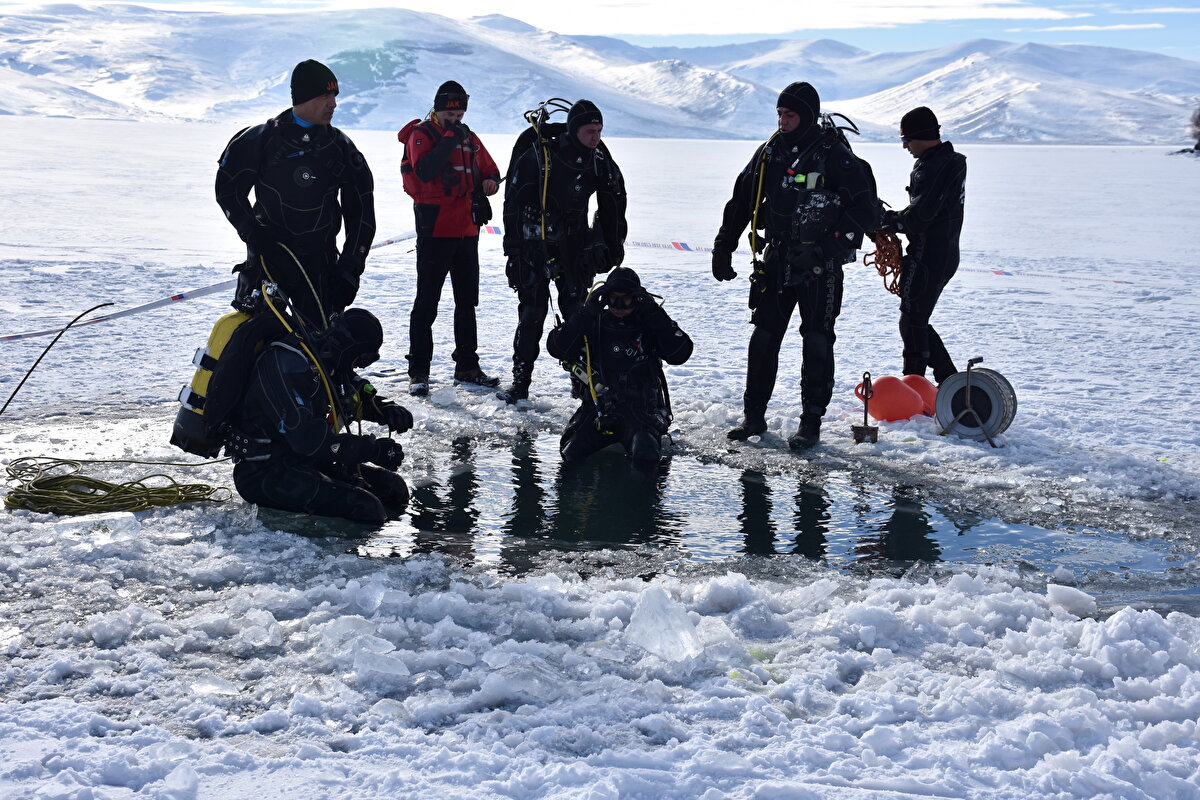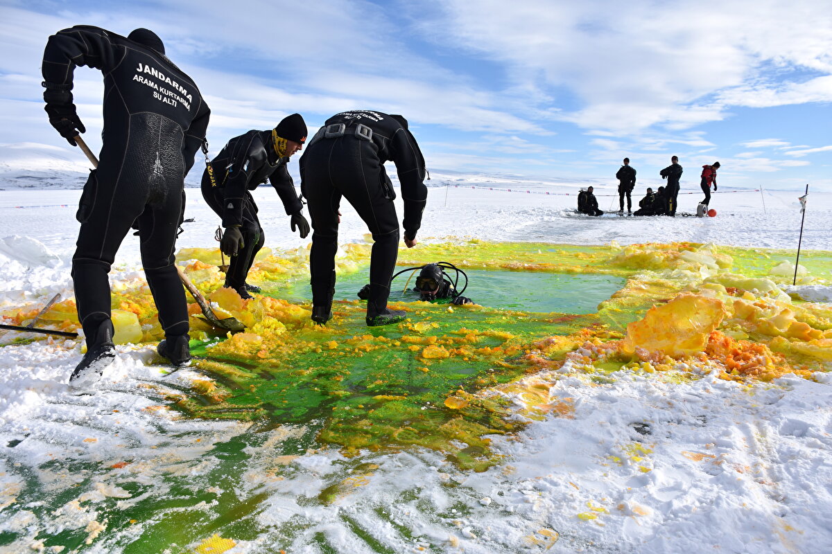 Ankara Jandarma Komando Özel Asayiş Komutanlığı (JÖAK) Sualtı Arama Kurtarma (SAK) Timleri, 18 dalgıçla yüzeyi tamamen buzla kaplı Çıldır Gölü'nde dalış yaptı.