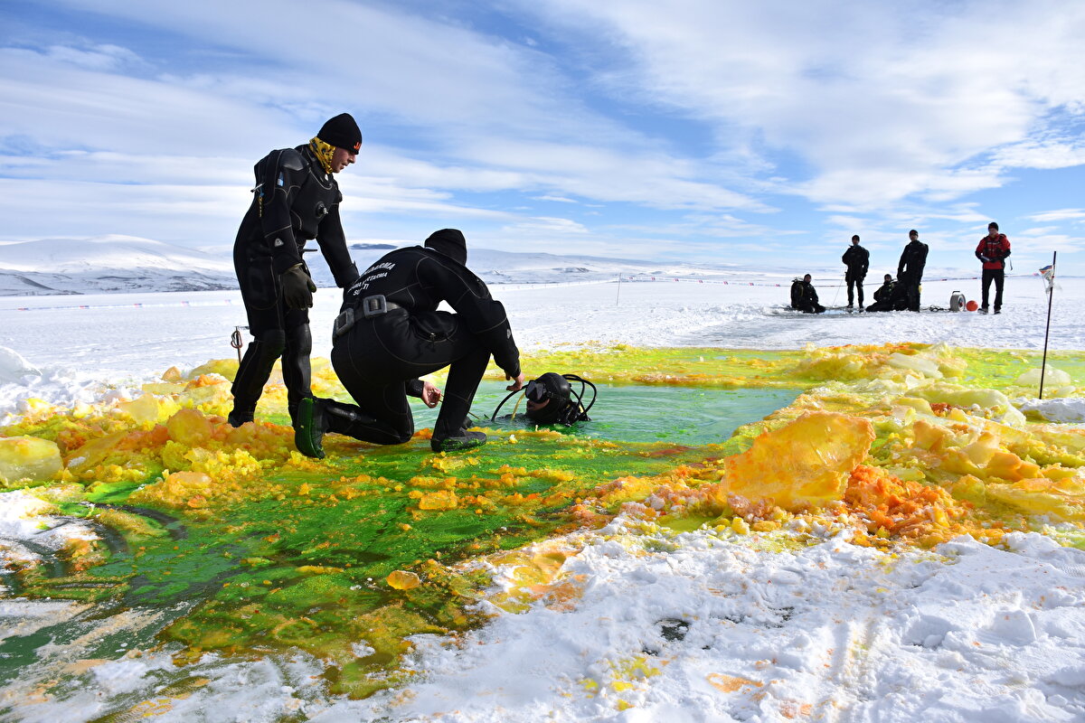 Hızarlar yardımıyla gölün yüzeyindeki buzları, üçgen galeri metoduyla kesen timler, ikişerli dalış eşleriyle bir giriş ve bir çıkış deliği arasında hat metoduyla sırayla dalış gerçekleştirdiler.