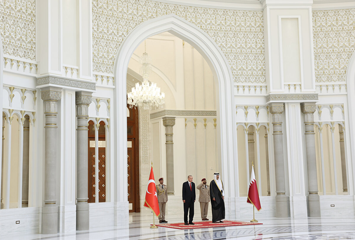 Havalimanı'ndaki karşılamanın ardından Cumhurbaşkanı Recep Tayyip Erdoğan, başkent Doha'da, Katar Emiri Şeyh Temim bin Hamed Al Sani tarafından resmi törenle karşılandı.