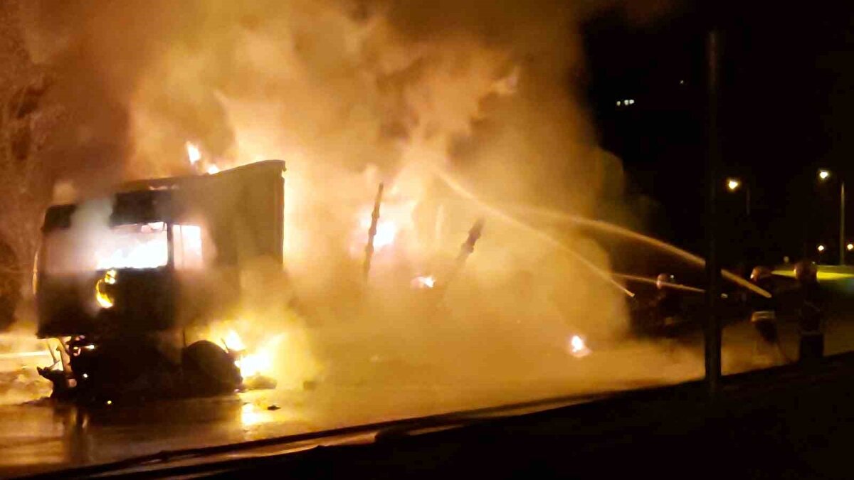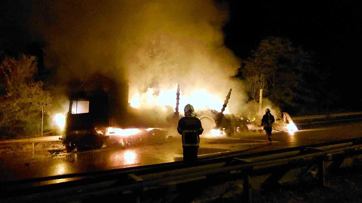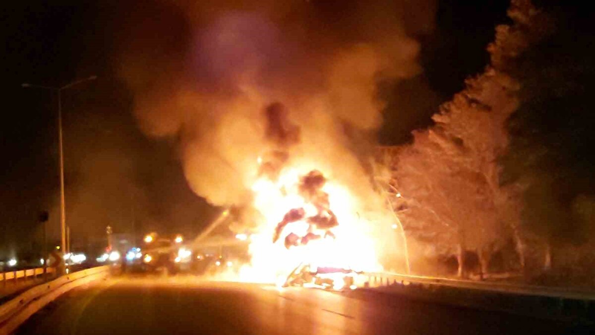 Tırın dorsesinden yola saçılan tiner kutuları yanmayı sürdürürken, bir süre ilerleyen tır durarak tamamen yanmaya başladı.