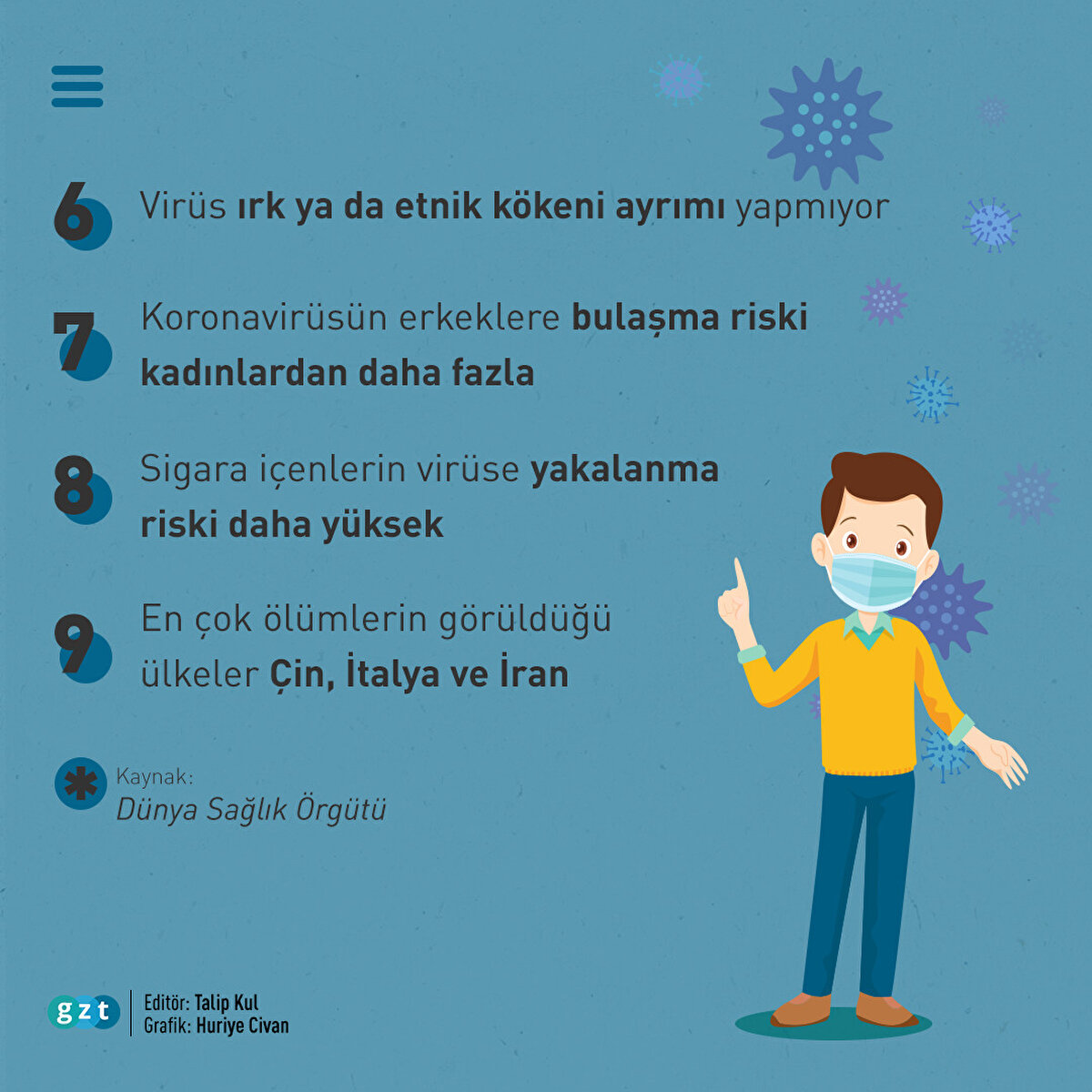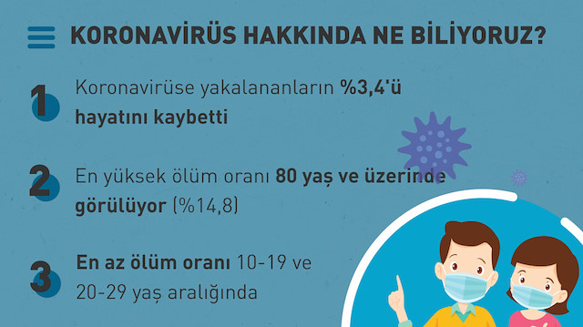 Koronavirüse yakalananların %3,4'ü hayatını kaybetti. En yüksek ölüm oranı 80 yaş ve üzerinde görülüyor. En az ölüm oranı 10-19 ve 20-29 yaş aralığında. Şu ana dek ölüm vakalarında hiç çocuk yok. Kronik hastalıkları olanlar risk grubunda. Virüs ırk ya da etnik kökeni ayrımı yapmıyor. Koronavirüsün erkeklere bulaşma riski kadınlardan daha fazla. Sigara içenlerin virüse yakalanma riski daha yüksek. En çok ölümlerin görüldüğü ülkeler Çin, İtalya ve İran oldu.