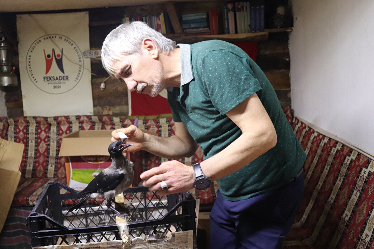 İlçenin Fevzi Çakmak Mahallesinde 4 yıldır çay ocağı işlemeciliği yapan Kaya, bir arkadaşı aracılığıyla yaralı 1 aylık karga yavrusunun bakımını üstlendi.