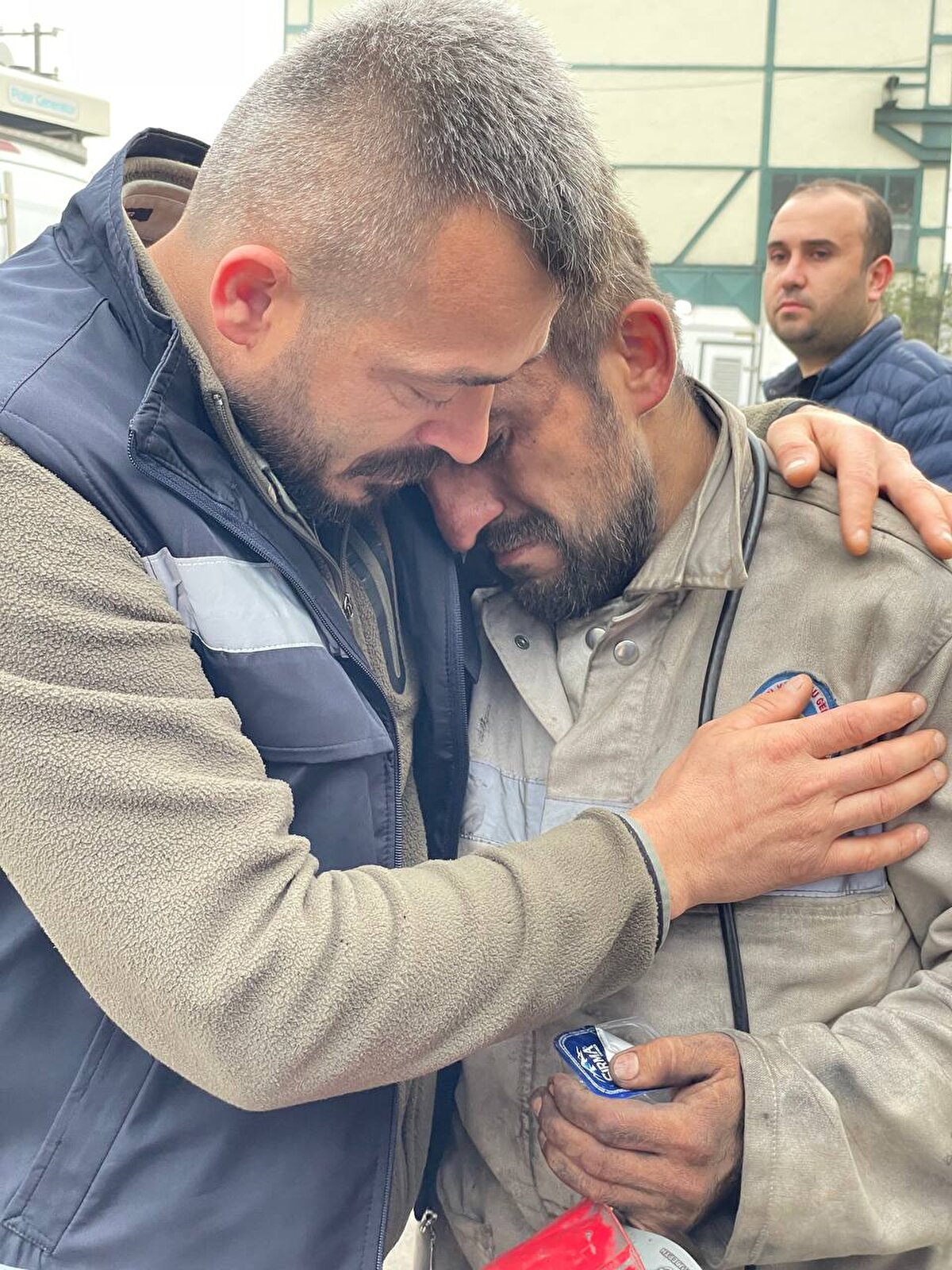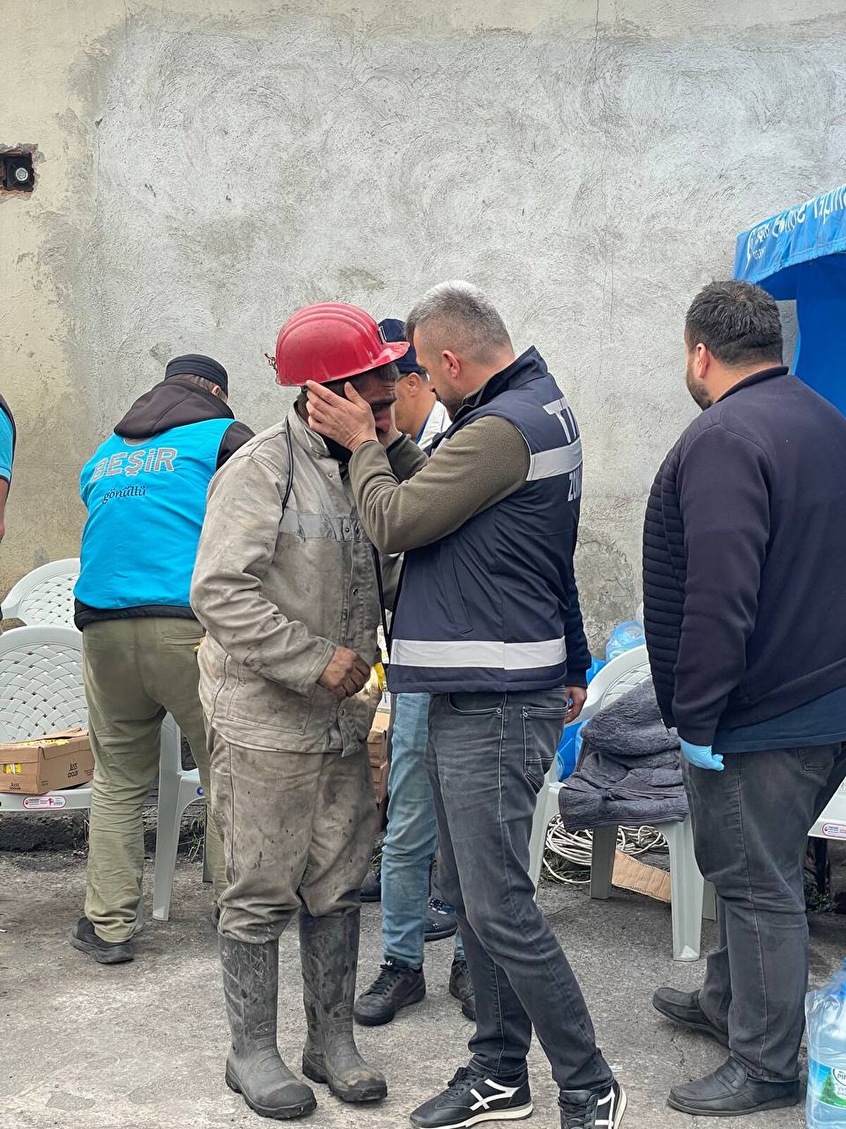 Amasra'da patlama meydana gelen maden ocağındaki işçileri kurtarma çalışmaları devam ediyor. Maden işçilerinden Muhammed Başol da (sağ) mesai arkadaşlarını kurtarma çalışmalarında görev aldı. Başol'u ocaktan çıktıktan sonra arkadaşları teselli etti.