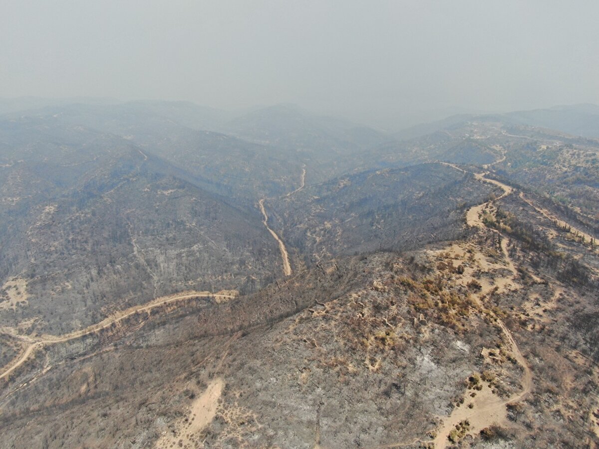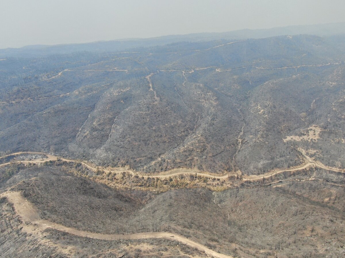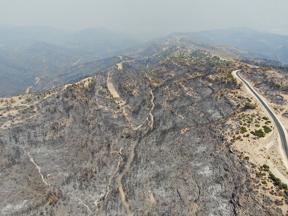 Antalya'nın Manavgat ilçesinde bir haftadır devam eden yangında zarar gören ve söndürülen ormanlık alanlar havadan drone ile görüntülendi.