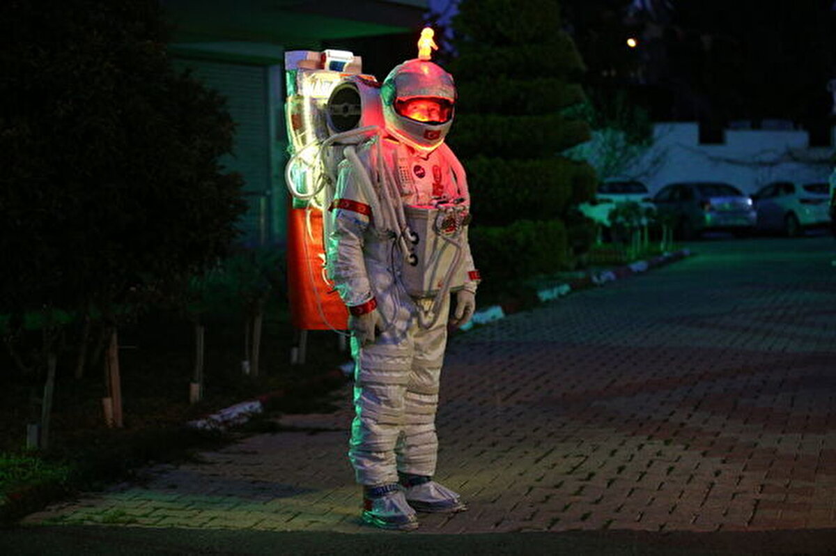 Mersin'de esnaf Zeki Konuk, geri dönüşüm malzemelerinden tasarladığı astronot kıyafetiyle sokak sokak gezip su tasarrufunun ve temiz suyun önemine dikkati çekiyor.
