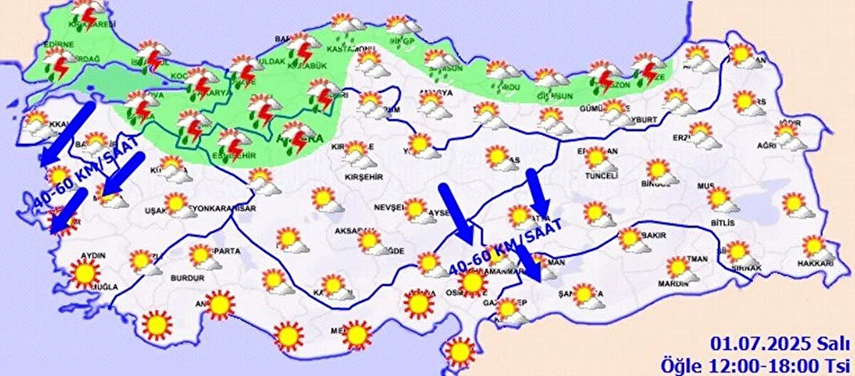 Rüzgar, ülke genelinde kuzey yönlerden hafif, zaman zaman orta kuvvette esecek. Ancak Marmara’nın güneybatısı, Kuzey Ege kıyıları, Doğu Anadolu’nun güneybatısı ile Kahramanmaraş ve Adıyaman çevrelerinde rüzgarın kuzeyden eserek yer yer kuvvetli ve kısa süreli fırtına şeklinde (40-80 kmsaat) etkili olacağı tahmin ediliyor.