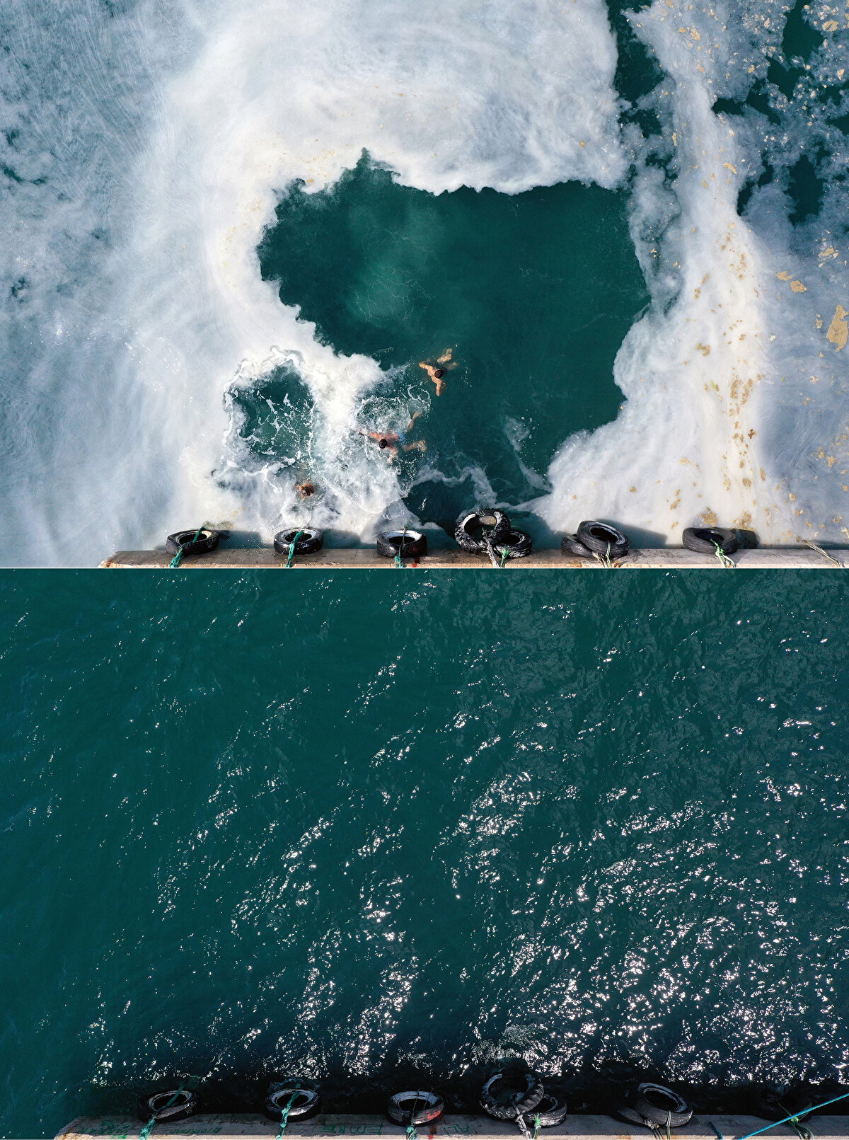 Güney sahili boyunca yüzeyde neredeyse yok denilecek kadar azalan müsilajın durumu, aynı açılardan drone ile havadan da görüntülendi.