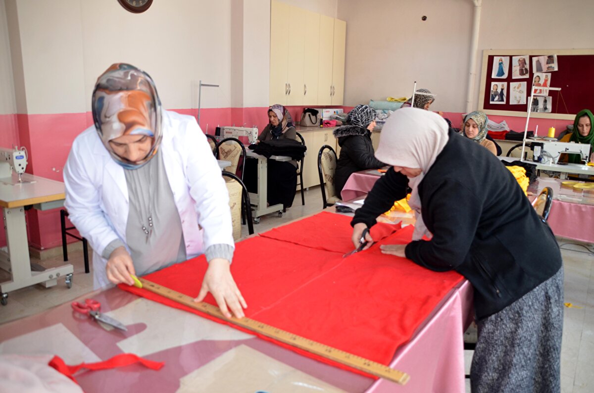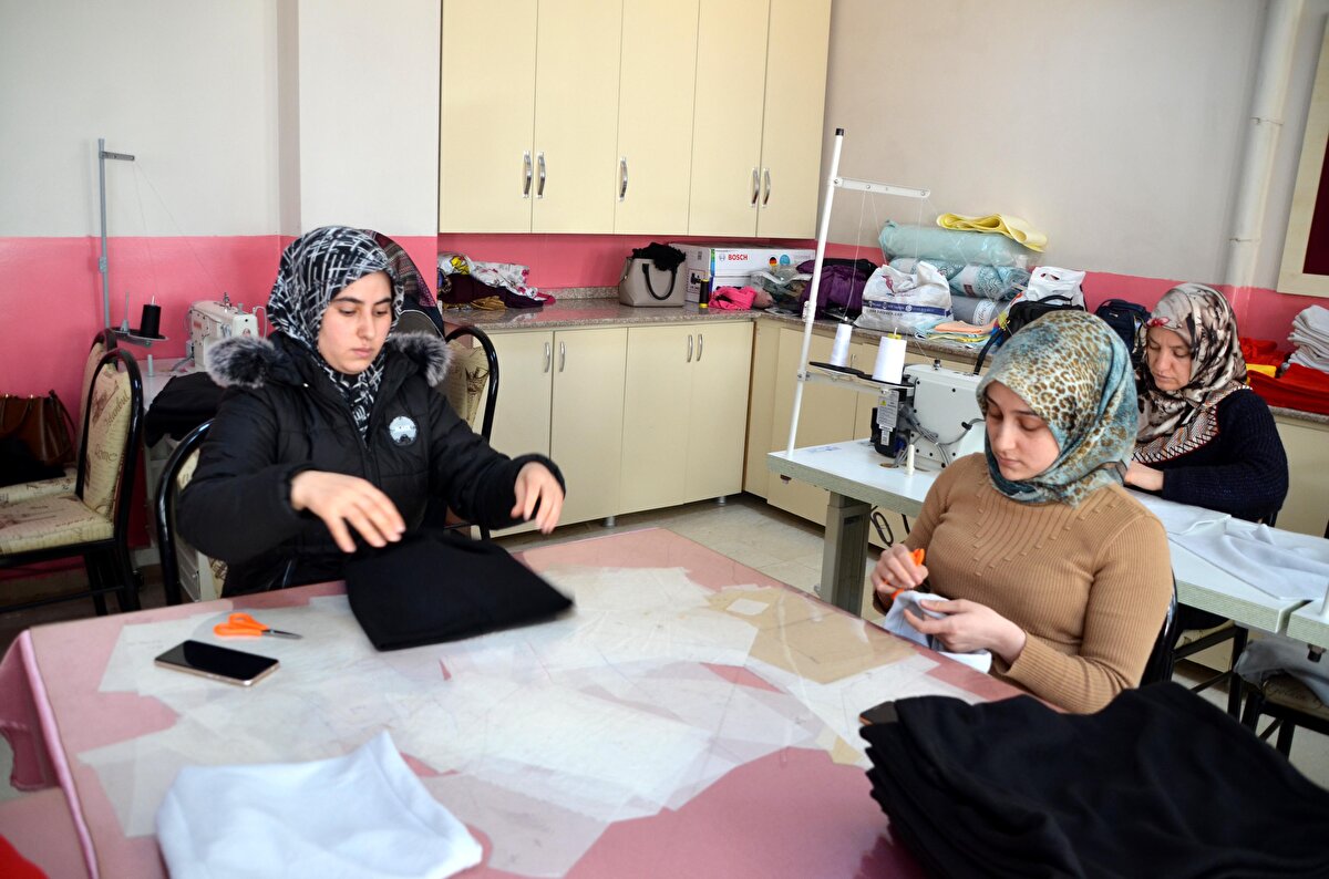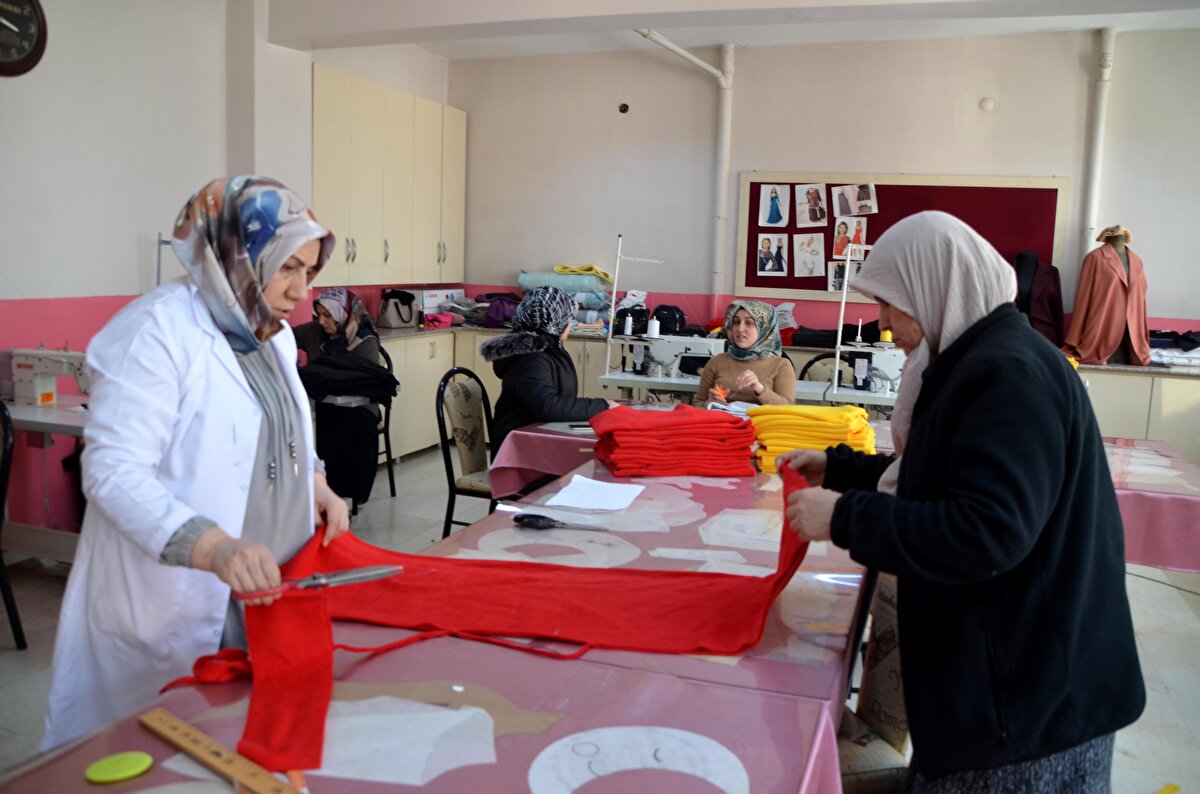 Usta öğretici Necla Özdemir ise vatandaşları soğuktan korumak için polar kumaştan şapka ve atkı hazırladıklarını dile getirerek, "Şu an aynı sınıfta 20 gönüllüyle çalışıyoruz. Yaşanan felaket sebebiyle çok üzgünüz. El birliğiyle yaraların sarılması gerekir. Mevsim şartları nedeniyle kursiyer arkadaşlarımız özveriyle çalışıyor. Depremzedelere dokunmak istedik." ifadelerini kullandı.