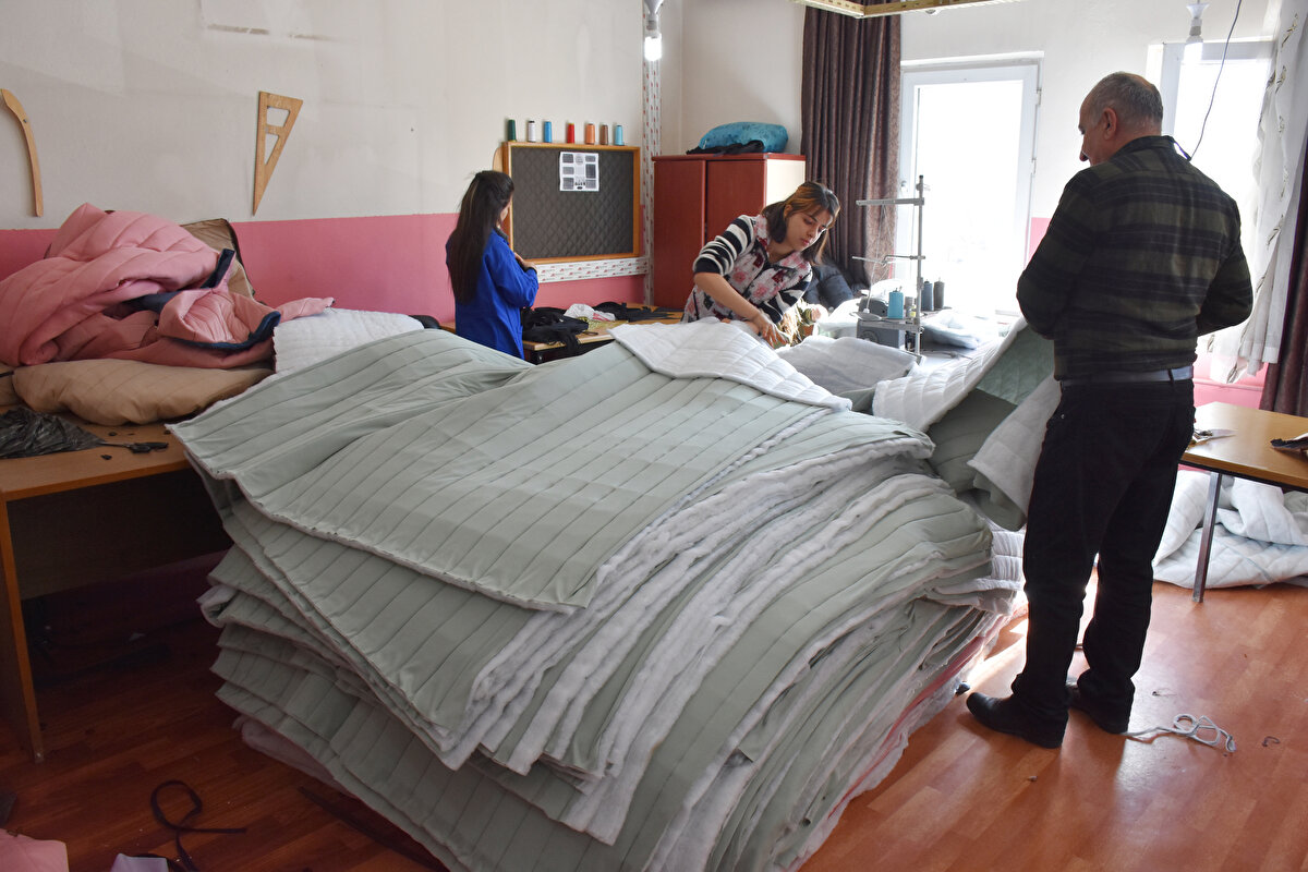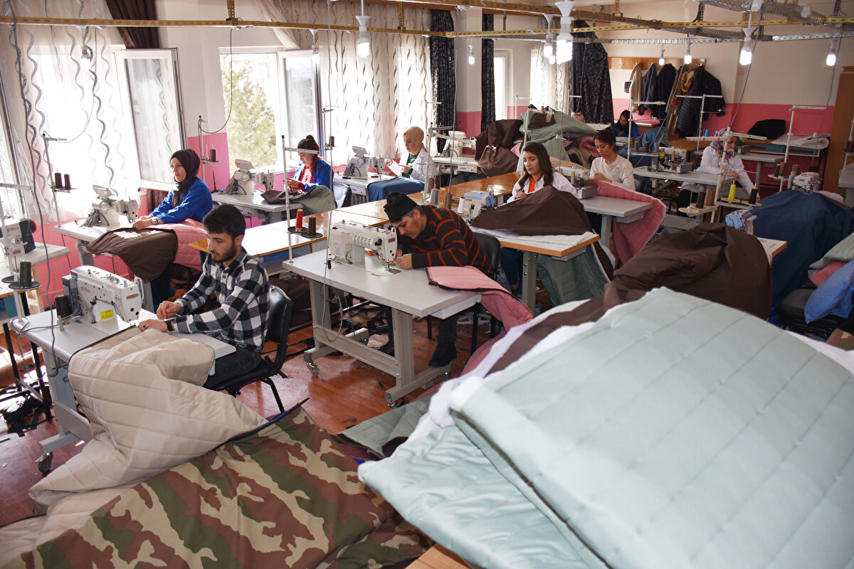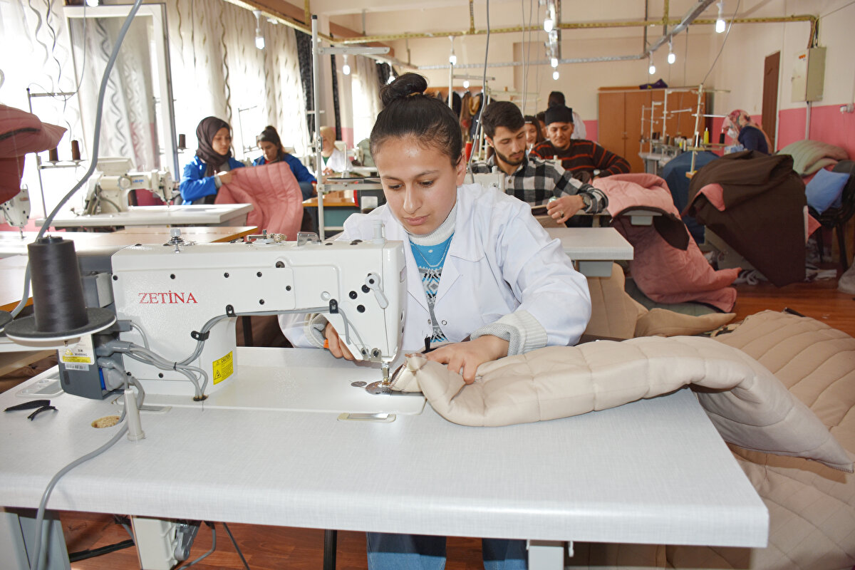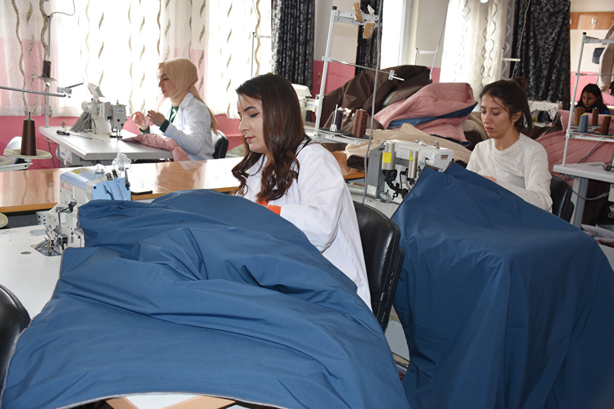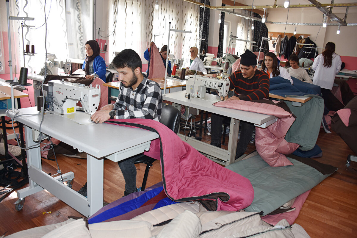 Van'da, Olgunlaşma Enstitüsü Müdürlüğünde de çalışanlar ile kursiyerler, soğuğa ve suya dayanıklı kumaş ve polardan battaniye, uyku tulumu ve yelek üretiyor.