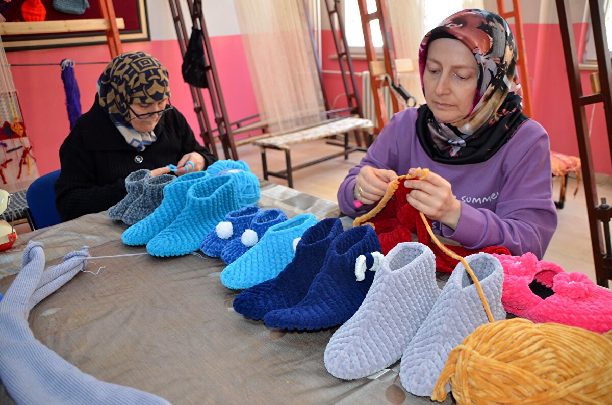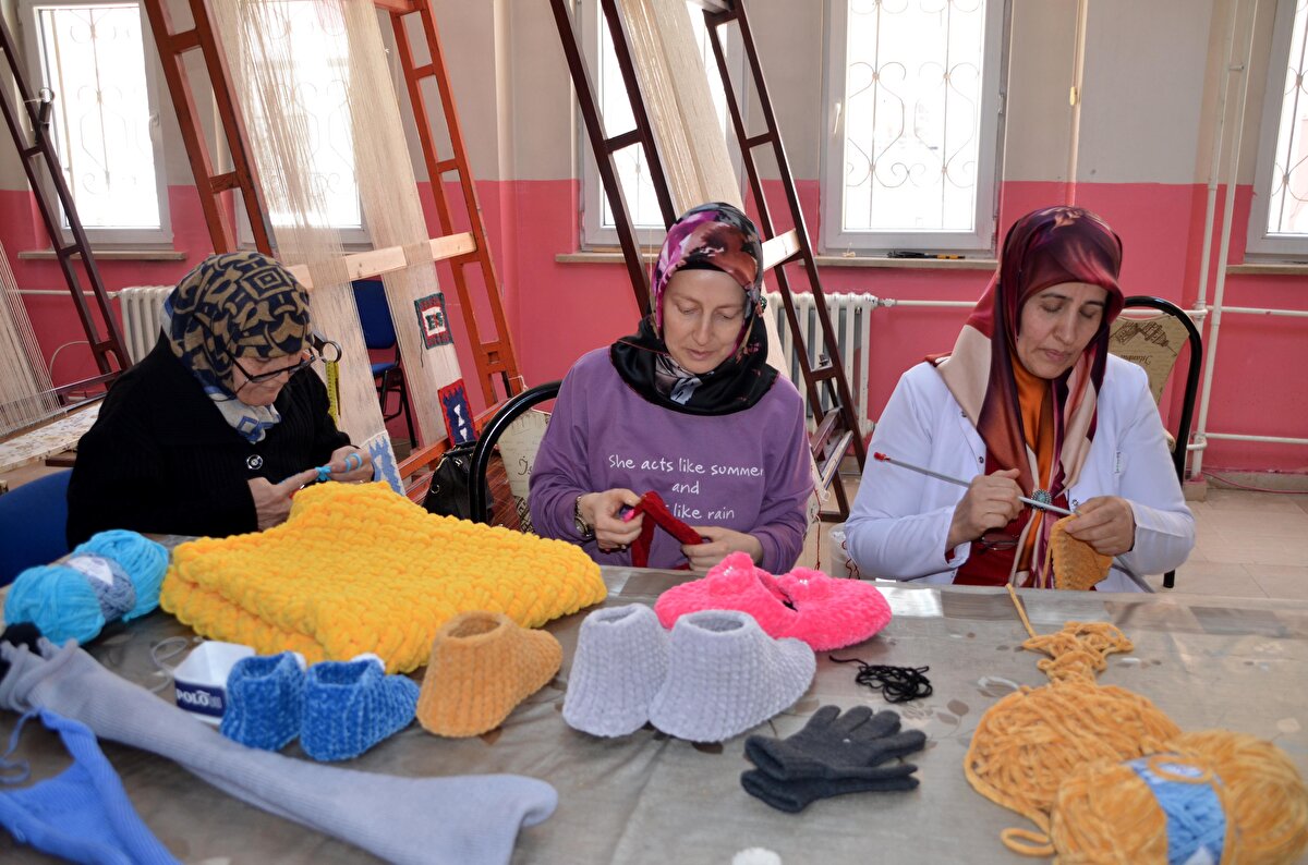 Deprem bölgesine çeşitli yaşam malzemesi desteği sunulan merkezde, üretilen 320 bere, 300 atkı, 100 eldiven, 100 panduf (ev ayakkabısı) ve 800 çorap afetzedelere gönderildi.