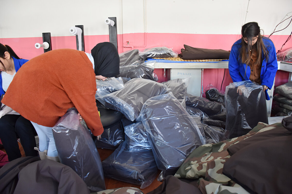 Van, Hakkari, Muş ve Bitlis'te öğretmen, öğrenci ve kadın kursiyerler, 6 Şubat'ta meydana gelen Kahramanmaraş merkezli depremlerin ilk gününden bu yana afetzedelerin ısınma ve giyim ihtiyaçlarının karşılanması için mesai yapıyor. Giyim üretim teknolojileri bölümünde 44 çalışanla hazırlanan ürünler, paketlendikten sonra deprem bölgesine gönderiliyor.