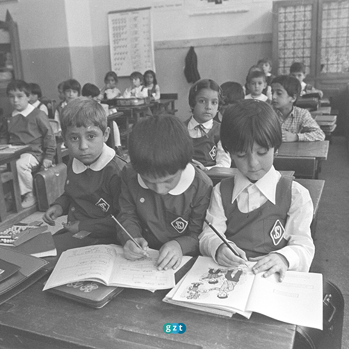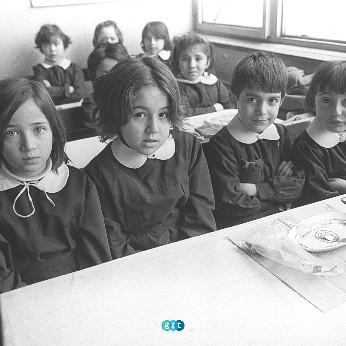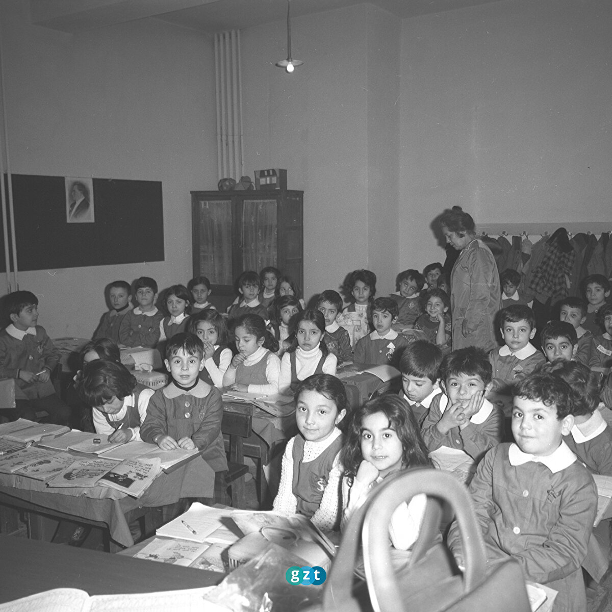 AA Arşivi'nden derlenen siyah beyaz fotoğraflarda, geçmiş yıllardaki derslikler, siyah önlüklü öğrenciler ve öğretmenlerinin görüntüleri yer alıyor. 15 Eylül 1975'te okula başlayan çocuklar ve öğretmenler