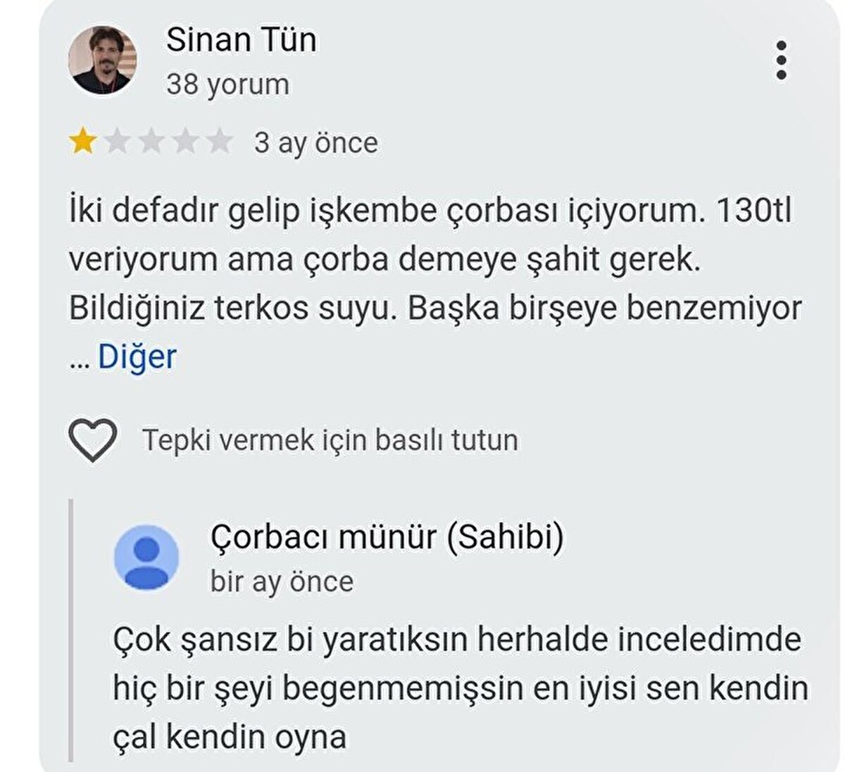 Eskişehir'de yaşayan 53 yıllık çorbacı Münür Subaşı, Google'da mekanı için olumsuz yorum yapanlara verdi veriştirdi. Türlü hakaretler ve tehditler savuran Subaşı'nın cevapları X'te gündeme geldi.