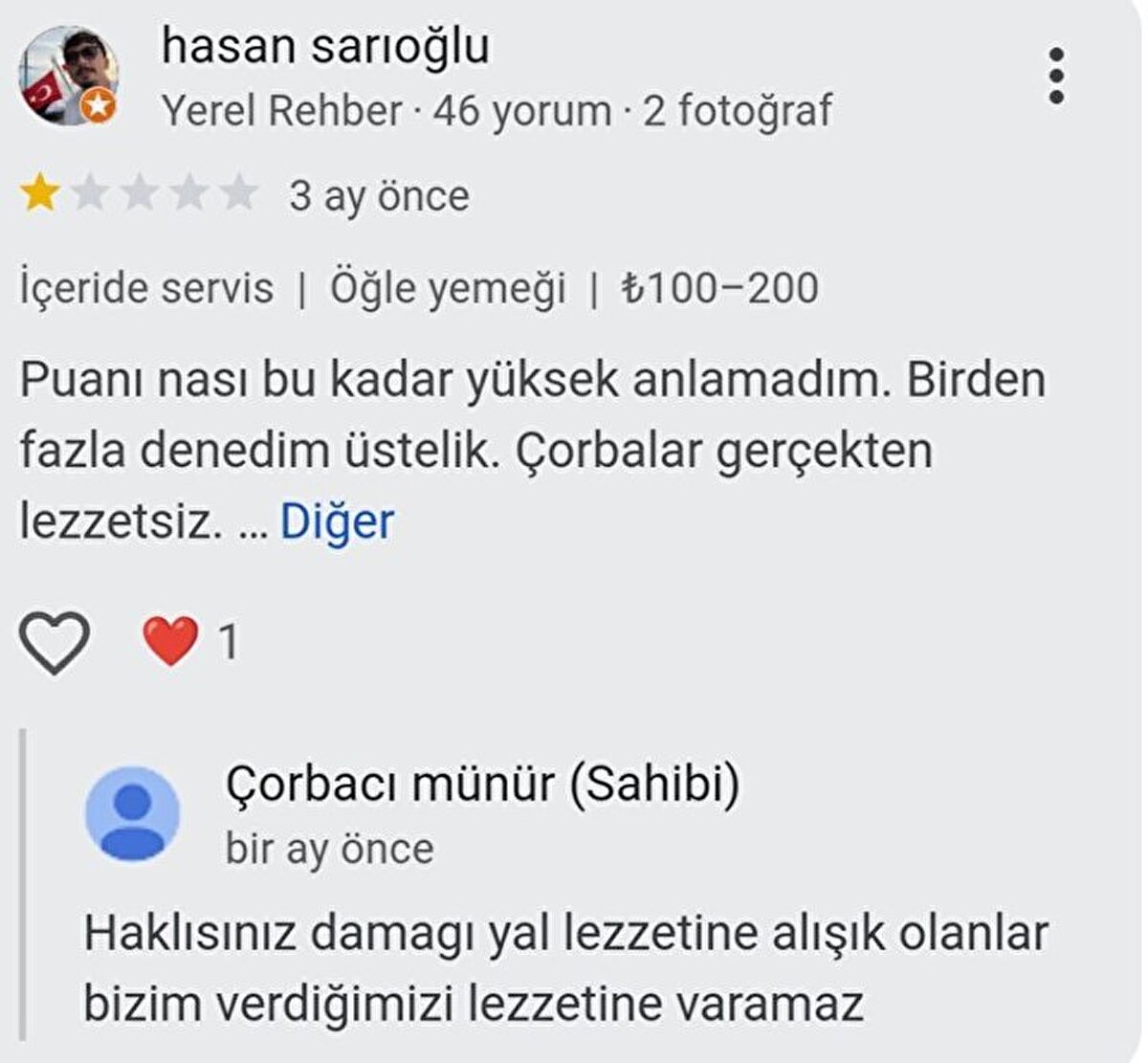 Eskişehir'de hizmet veren Çorbacı Münür adlı işletmenin sahibi Münür Subaşı, Google'da mekanı için olumsuz yorum yapanlara verdiği cevaplarla X'de gündeme geldi.