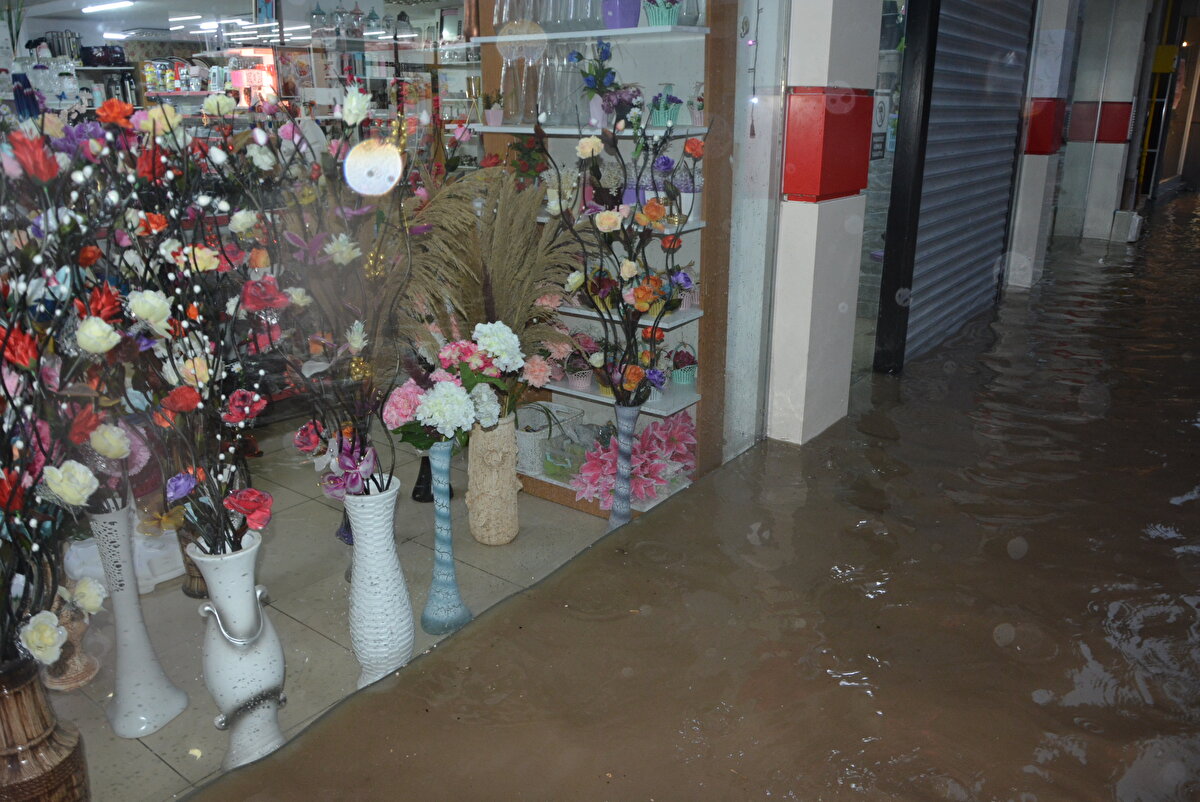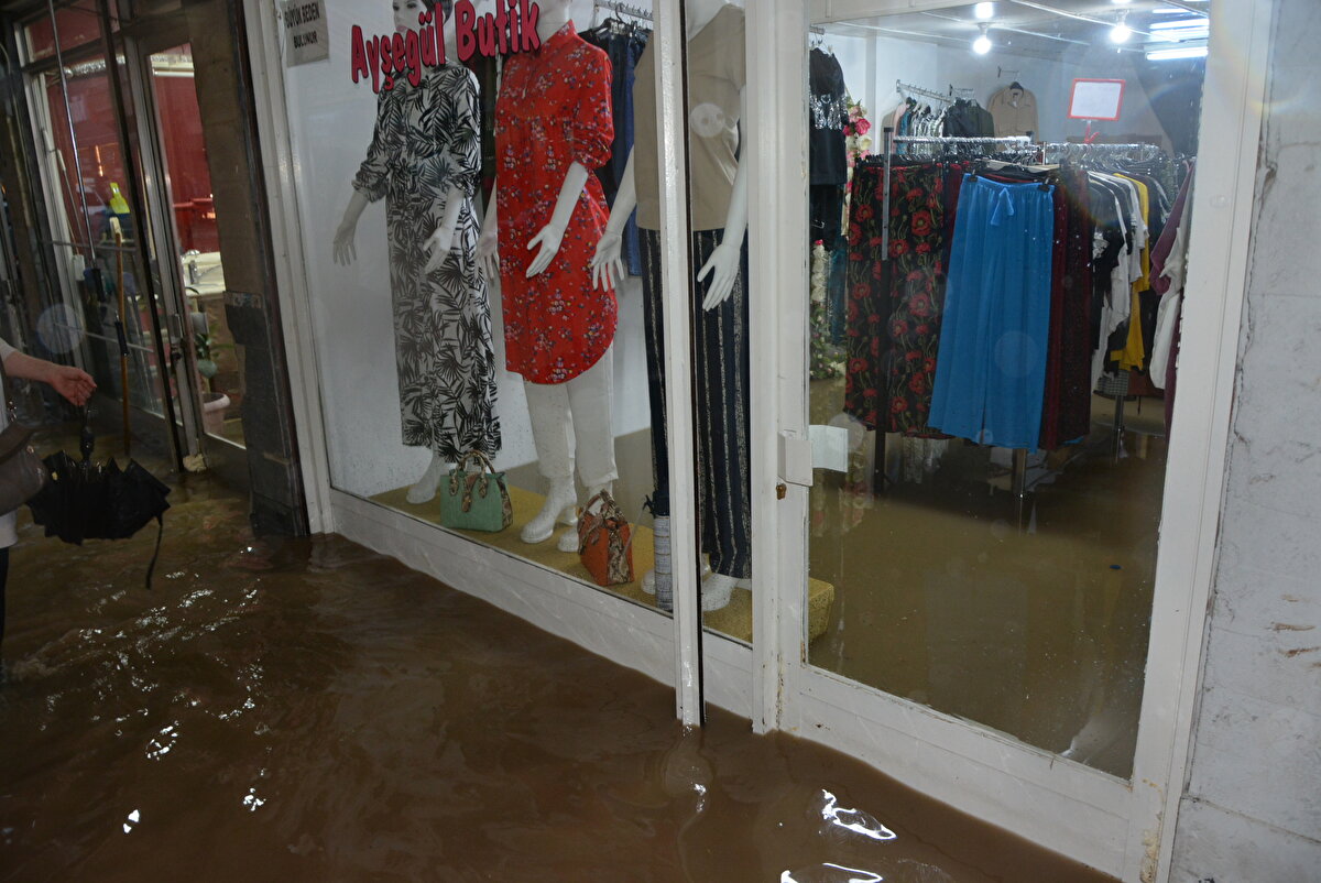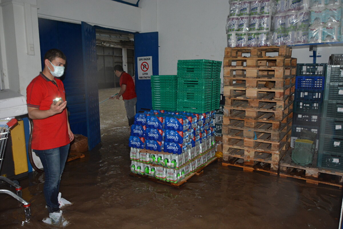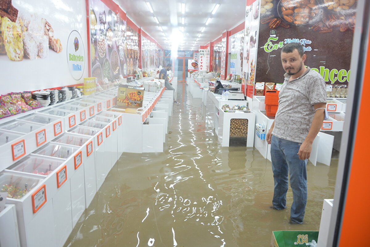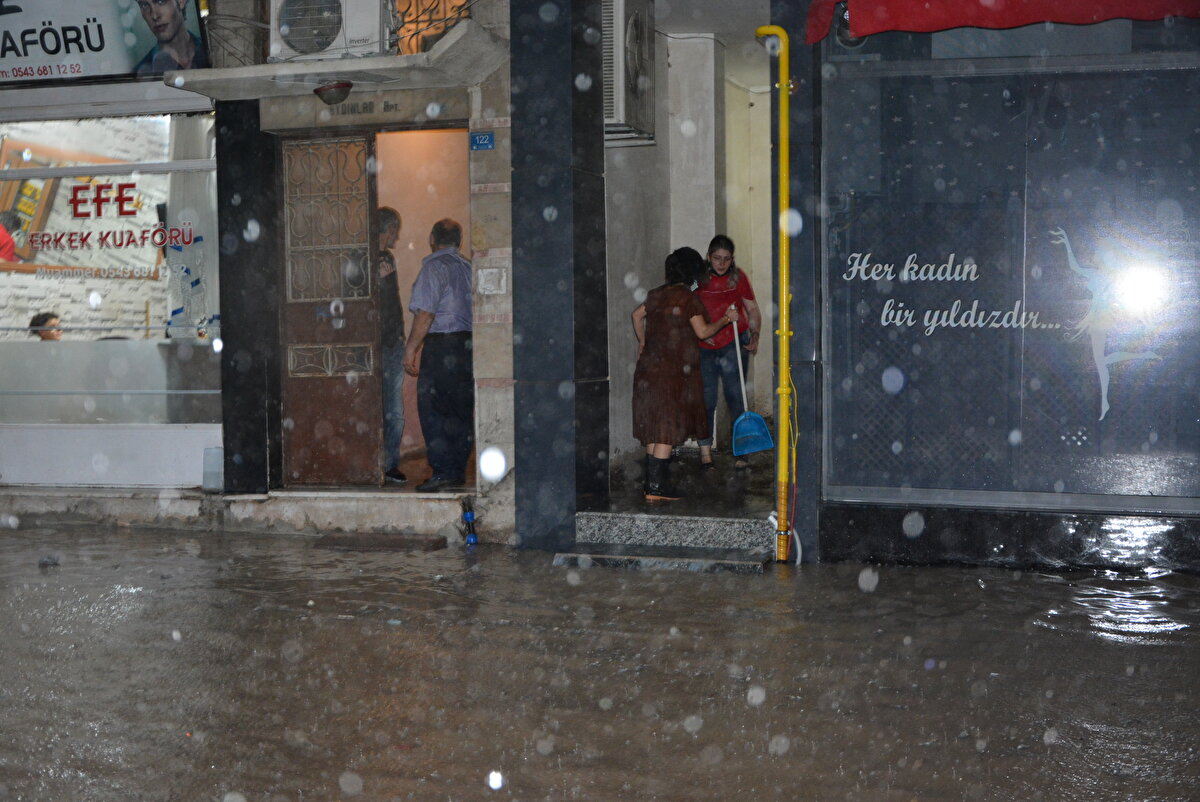 Kentin birçok noktasında, caddelerde ve ara yollarda yükselen yağmur suları, insanları tedirgin etti. Kısa sürede debisi yükselen yağmur suyu, ilçenin birçok noktasında bulunan iş yerlerine dolarak hasara neden oldu.